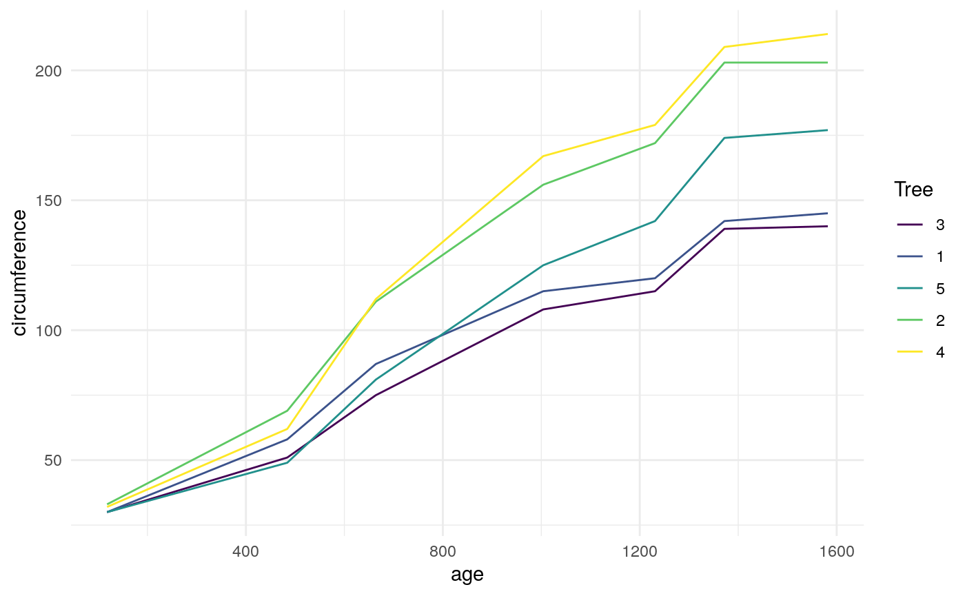 This contains 35 observations of three variables: Tree, age, and circumference. Tree is a factor with five levels describing five trees. As might be expected, age and circumference are correlated: