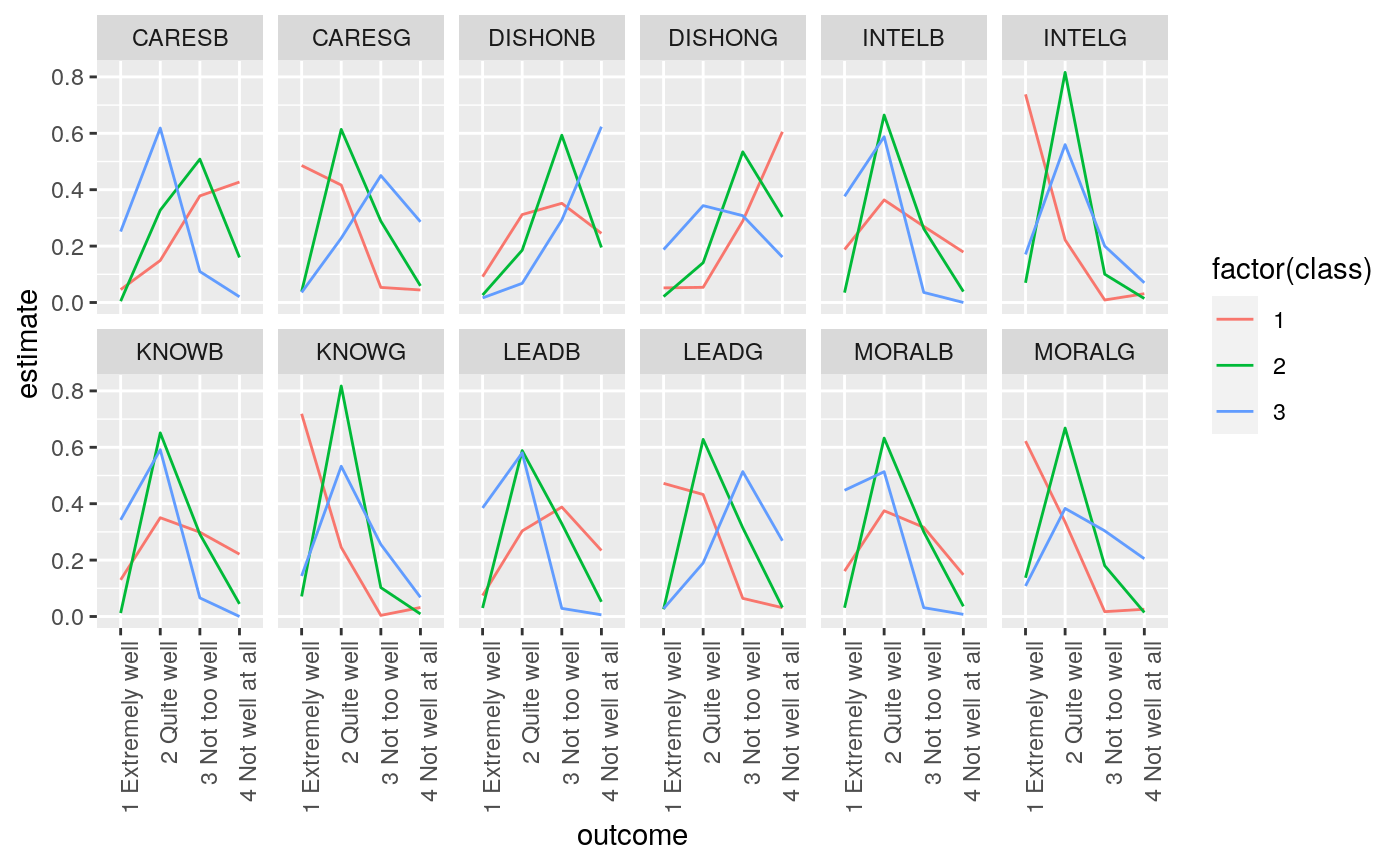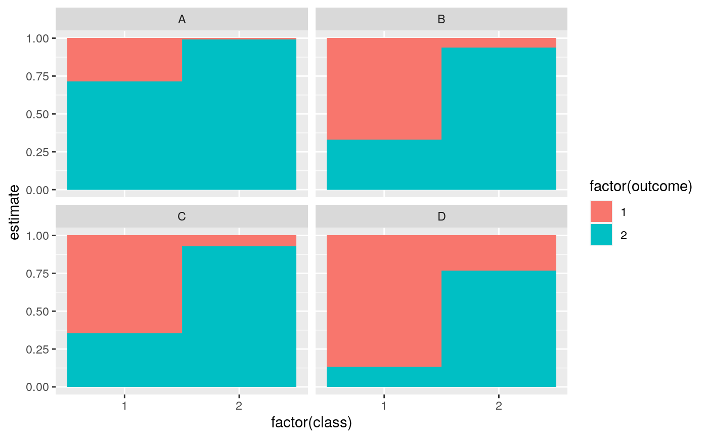 library(poLCA)#>library(dplyr) data(values) f <- cbind(A, B, C, D) ~ 1 M1 <- poLCA(f, values, nclass = 2, verbose = FALSE) M1#> Conditional item response (column) probabilities, #> by outcome variable, for each class (row) #> #> $A #> Pr(1) Pr(2) #> class 1: 0.2864 0.7136 #> class 2: 0.0068 0.9932 #> #> $B #> Pr(1) Pr(2) #> class 1: 0.6704 0.3296 #> class 2: 0.0602 0.9398 #> #> $C #> Pr(1) Pr(2) #> class 1: 0.6460 0.3540 #> class 2: 0.0735 0.9265 #> #> $D #> Pr(1) Pr(2) #> class 1: 0.8676 0.1324 #> class 2: 0.2309 0.7691 #> #> Estimated class population shares #> 0.7208 0.2792 #> #> Predicted class memberships (by modal posterior prob.) #> 0.6713 0.3287 #> #> ========================================================= #> Fit for 2 latent classes: #> ========================================================= #> number of observations: 216 #> number of estimated parameters: 9 #> residual degrees of freedom: 6 #> maximum log-likelihood: -504.4677 #> #> AIC(2): 1026.935 #> BIC(2): 1057.313 #> G^2(2): 2.719922 (Likelihood ratio/deviance statistic) #> X^2(2): 2.719764 (Chi-square goodness of fit) #>tidy(M1)#> # A tibble: 16 x 5 #> variable class outcome estimate std.error #> <chr> <int> <dbl> <dbl> <dbl> #> 1 A 1 1 0.286 0.0393 #> 2 A 2 1 0.00681 0.0254 #> 3 A 1 2 0.714 0.0393 #> 4 A 2 2 0.993 0.0254 #> 5 B 1 1 0.670 0.0489 #> 6 B 2 1 0.0602 0.0649 #> 7 B 1 2 0.330 0.0489 #> 8 B 2 2 0.940 0.0649 #> 9 C 1 1 0.646 0.0482 #> 10 C 2 1 0.0735 0.0642 #> 11 C 1 2 0.354 0.0482 #> 12 C 2 2 0.927 0.0642 #> 13 D 1 1 0.868 0.0379 #> 14 D 2 1 0.231 0.0929 #> 15 D 1 2 0.132 0.0379 #> 16 D 2 2 0.769 0.0929augment(M1)#> # A tibble: 216 x 7 #> A B C D X.Intercept. .class .probability #> <dbl> <dbl> <dbl> <dbl> <dbl> <int> <dbl> #> 1 2 2 2 2 1 2 0.959 #> 2 2 2 2 2 1 2 0.959 #> 3 2 2 2 2 1 2 0.959 #> 4 2 2 2 2 1 2 0.959 #> 5 2 2 2 2 1 2 0.959 #> 6 2 2 2 2 1 2 0.959 #> 7 2 2 2 2 1 2 0.959 #> 8 2 2 2 2 1 2 0.959 #> 9 2 2 2 2 1 2 0.959 #> 10 2 2 2 2 1 2 0.959 #> # … with 206 more rowsglance(M1)#> # A tibble: 1 x 8 #> logLik AIC BIC g.squared chi.squared df df.residual nobs #> <dbl> <dbl> <dbl> <dbl> <dbl> <dbl> <dbl> <int> #> 1 -504. 1027. 1057. 2.72 2.72 9 6 216library(ggplot2) ggplot(tidy(M1), aes(factor(class), estimate, fill = factor(outcome))) + geom_bar(stat = "identity", width = 1) + facet_wrap(~variable)## Three-class model with a single covariate. data(election) f2a <- cbind( MORALG, CARESG, KNOWG, LEADG, DISHONG, INTELG, MORALB, CARESB, KNOWB, LEADB, DISHONB, INTELB ) ~ PARTY nes2a <- poLCA(f2a, election, nclass = 3, nrep = 5, verbose = FALSE) td <- tidy(nes2a) td#> # A tibble: 144 x 5 #> variable class outcome estimate std.error #> <chr> <int> <fct> <dbl> <dbl> #> 1 MORALG 1 1 Extremely well 0.622 0.0309 #> 2 MORALG 2 1 Extremely well 0.137 0.0182 #> 3 MORALG 3 1 Extremely well 0.108 0.0175 #> 4 MORALG 1 2 Quite well 0.335 0.0293 #> 5 MORALG 2 2 Quite well 0.668 0.0247 #> 6 MORALG 3 2 Quite well 0.383 0.0274 #> 7 MORALG 1 3 Not too well 0.0172 0.00841 #> 8 MORALG 2 3 Not too well 0.180 0.0208 #> 9 MORALG 3 3 Not too well 0.304 0.0253 #> 10 MORALG 1 4 Not well at all 0.0258 0.0124 #> # … with 134 more rows# show ggplot(td, aes(outcome, estimate, color = factor(class), group = class)) + geom_line() + facet_wrap(~variable, nrow = 2) + theme(axis.text.x = element_text(angle = 90, hjust = 1))#> # A tibble: 1,300 x 16 #> MORALG CARESG KNOWG LEADG DISHONG INTELG MORALB CARESB KNOWB LEADB DISHONB #> <fct> <fct> <fct> <fct> <fct> <fct> <fct> <fct> <fct> <fct> <fct> #> 1 3 Not… 1 Ext… 2 Qu… 2 Qu… 3 Not … 2 Qui… 1 Ext… 1 Ext… 2 Qu… 2 Qu… 4 Not … #> 2 1 Ext… 2 Qui… 2 Qu… 1 Ex… 3 Not … 2 Qui… 2 Qui… 2 Qui… 2 Qu… 3 No… 3 Not … #> 3 2 Qui… 2 Qui… 2 Qu… 2 Qu… 2 Quit… 2 Qui… 2 Qui… 3 Not… 2 Qu… 2 Qu… 3 Not … #> 4 2 Qui… 4 Not… 2 Qu… 3 No… 2 Quit… 2 Qui… 1 Ext… 1 Ext… 2 Qu… 2 Qu… 3 Not … #> 5 2 Qui… 2 Qui… 2 Qu… 2 Qu… 3 Not … 2 Qui… 3 Not… 4 Not… 4 No… 4 No… 3 Not … #> 6 2 Qui… 2 Qui… 2 Qu… 3 No… 4 Not … 2 Qui… 2 Qui… 3 Not… 2 Qu… 2 Qu… 3 Not … #> 7 1 Ext… 1 Ext… 1 Ex… 1 Ex… 4 Not … 1 Ext… 2 Qui… 4 Not… 2 Qu… 3 No… 3 Not … #> 8 2 Qui… 2 Qui… 2 Qu… 2 Qu… 3 Not … 2 Qui… 3 Not… 2 Qui… 2 Qu… 2 Qu… 3 Not … #> 9 2 Qui… 2 Qui… 2 Qu… 2 Qu… 3 Not … 2 Qui… 2 Qui… 2 Qui… 2 Qu… 3 No… 2 Quit… #> 10 2 Qui… 3 Not… 2 Qu… 2 Qu… 3 Not … 2 Qui… 2 Qui… 4 Not… 2 Qu… 4 No… 2 Quit… #> # … with 1,290 more rows, and 5 more variables: INTELB <fct>, #> # X.Intercept. <dbl>, PARTY <dbl>, .class <int>, .probability <dbl>#> # A tibble: 3 x 2 #> .class n #> <int> <int> #> 1 1 360 #> 2 2 496 #> 3 3 444# if the original data is provided, it leads to NAs in new columns # for rows that weren't predicted au2 <- augment(nes2a, data = election) au2#> # A tibble: 1,785 x 20 #> MORALG CARESG KNOWG LEADG DISHONG INTELG MORALB CARESB KNOWB LEADB DISHONB #> <fct> <fct> <fct> <fct> <fct> <fct> <fct> <fct> <fct> <fct> <fct> #> 1 3 Not… 1 Ext… 2 Qu… 2 Qu… 3 Not … 2 Qui… 1 Ext… 1 Ext… 2 Qu… 2 Qu… 4 Not … #> 2 4 Not… 3 Not… 4 No… 3 No… 2 Quit… 2 Qui… NA NA 2 Qu… 3 No… NA #> 3 1 Ext… 2 Qui… 2 Qu… 1 Ex… 3 Not … 2 Qui… 2 Qui… 2 Qui… 2 Qu… 3 No… 3 Not … #> 4 2 Qui… 2 Qui… 2 Qu… 2 Qu… 2 Quit… 2 Qui… 2 Qui… 3 Not… 2 Qu… 2 Qu… 3 Not … #> 5 2 Qui… 4 Not… 2 Qu… 3 No… 2 Quit… 2 Qui… 1 Ext… 1 Ext… 2 Qu… 2 Qu… 3 Not … #> 6 2 Qui… 3 Not… 3 No… 2 Qu… 2 Quit… 2 Qui… 2 Qui… NA 3 No… 2 Qu… 2 Quit… #> 7 2 Qui… NA 2 Qu… 2 Qu… 4 Not … 2 Qui… NA 3 Not… 2 Qu… 2 Qu… 4 Not … #> 8 2 Qui… 2 Qui… 2 Qu… 2 Qu… 3 Not … 2 Qui… 3 Not… 4 Not… 4 No… 4 No… 3 Not … #> 9 2 Qui… 2 Qui… 2 Qu… 3 No… 4 Not … 2 Qui… 2 Qui… 3 Not… 2 Qu… 2 Qu… 3 Not … #> 10 1 Ext… 1 Ext… 1 Ex… 1 Ex… 4 Not … 1 Ext… 2