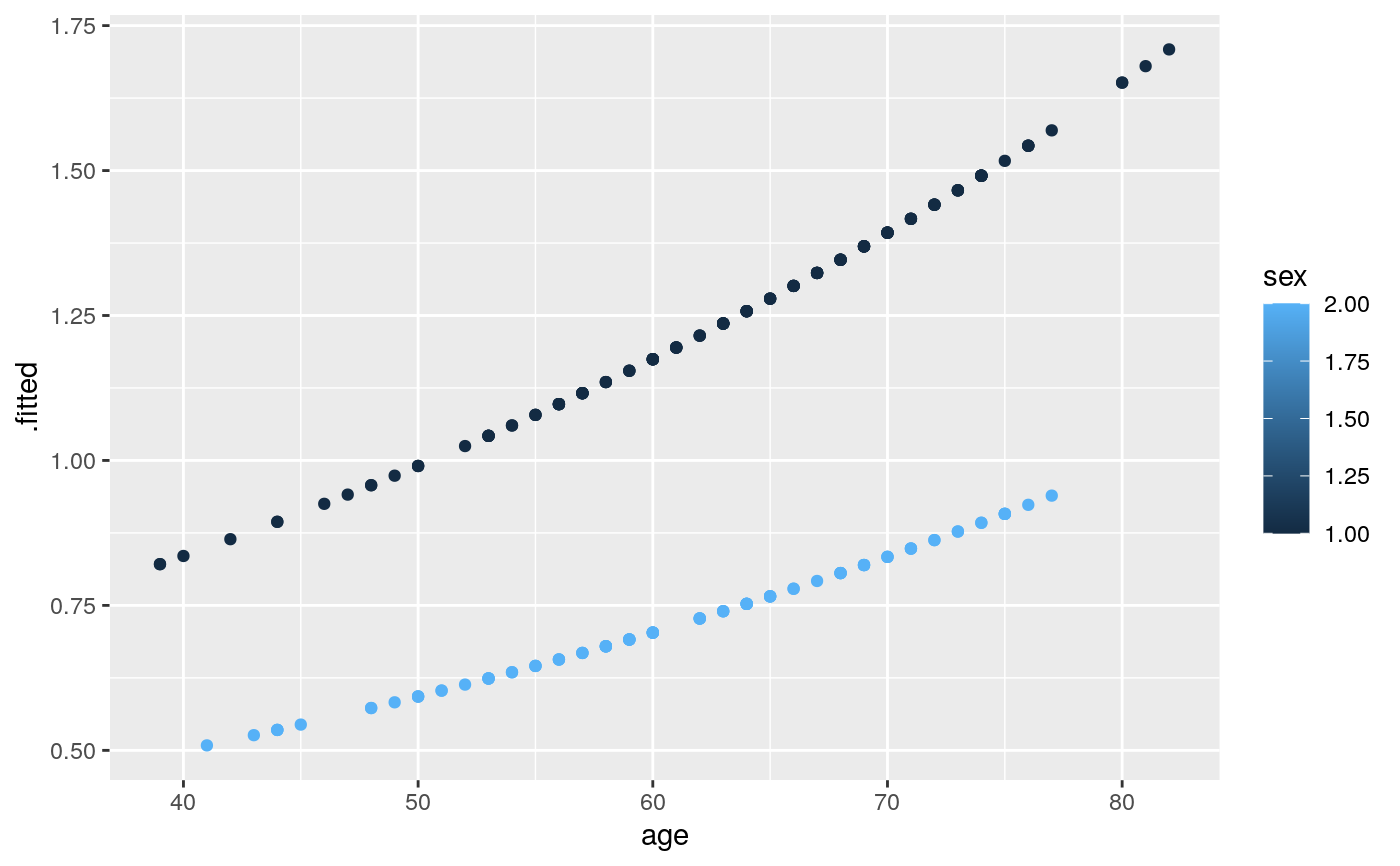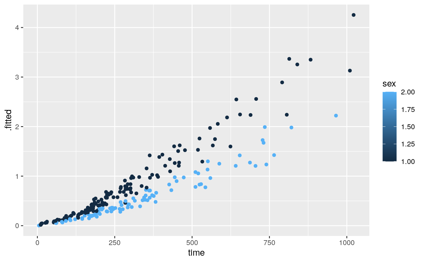 #> # A tibble: 2 x 5 #> term estimate std.error statistic p.value #> <chr> <dbl> <dbl> <dbl> <dbl> #> 1 age 0.0170 0.00922 1.85 0.0646 #> 2 sex -0.513 0.167 -3.06 0.00218#> # A tibble: 2 x 5 #> term estimate std.error statistic p.value #> <chr> <dbl> <dbl> <dbl> <dbl> #> 1 age 1.02 0.00922 1.85 0.0646 #> 2 sex 0.599 0.167 -3.06 0.00218lp <- augment(cfit, lung) risks <- augment(cfit, lung, type.predict = "risk") expected <- augment(cfit, lung, type.predict = "expected") glance(cfit)#> # A tibble: 1 x 18 #> n nevent statistic.log p.value.log statistic.sc p.value.sc statistic.wald #> <int> <dbl> <dbl> <dbl> <dbl> <dbl> <dbl> #> 1 228 165 14.1 0.000857 13.7 0.00105 13.5 #> # … with 11 more variables: p.value.wald <dbl>, statistic.robust <dbl>, #> # p.value.robust <dbl>, r.squared <dbl>, r.squared.max <dbl>, #> # concordance <dbl>, std.error.concordance <dbl>, logLik <dbl>, AIC <dbl>, #> # BIC <dbl>, nobs <int># also works on clogit models resp <- levels(logan$occupation) n <- nrow(logan) indx <- rep(1:n, length(resp)) logan2 <- data.frame( logan[indx, ], id = indx, tocc = factor(rep(resp, each = n)) ) logan2$case <- (logan2$occupation == logan2$tocc) cl <- clogit(case ~ tocc + tocc:education + strata(id), logan2) tidy(cl)#> # A tibble: 9 x 5 #> term estimate std.error statistic p.value #> <chr> <dbl> <dbl> <dbl> <dbl> #> 1 toccfarm -1.90 1.38 -1.37 1.70e- 1 #> 2 toccoperatives 1.17 0.566 2.06 3.91e- 2 #> 3 toccprofessional -8.10 0.699 -11.6 4.45e-31 #> 4 toccsales -5.03 0.770 -6.53 6.54e-11 #> 5 tocccraftsmen:education -0.332 0.0569 -5.84 5.13e- 9 #> 6 toccfarm:education -0.370 0.116 -3.18 1.47e- 3 #> 7 toccoperatives:education -0.422 0.0584 -7.23 4.98e-13 #> 8 toccprofessional:education 0.278 0.0510 5.45 4.94e- 8 #> 9 toccsales:education NA 0 NA NAglance(cl)#> # A tibble: 1 x 18 #> n nevent statistic.log p.value.log statistic.sc p.value.sc statistic.wald #> <int> <dbl> <dbl> <dbl> <dbl> <dbl> <dbl> #> 1 4190 838 666. 1.90e-138 682. 5.01e-142 414. #> # … with 11 more variables: p.value.wald <dbl>, statistic.robust <dbl>, #> # p.value.robust <dbl>, r.squared <dbl>, r.squared.max <dbl>, #> # concordance <dbl>, std.error.concordance <dbl>, logLik <dbl>, AIC <dbl>, #> # BIC <dbl>, nobs <int>