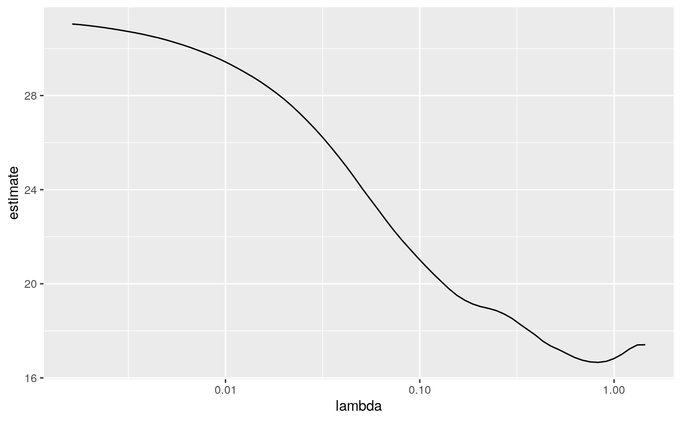 library(glmnet)#>set.seed(27) nobs <- 100 nvar <- 50 real <- 5 x <- matrix(rnorm(nobs * nvar), nobs, nvar) beta <- c(rnorm(real, 0, 1), rep(0, nvar - real)) y <- c(t(beta) %*% t(x)) + rnorm(nvar, sd = 3) cvfit1 <- cv.glmnet(x, y) tidy(cvfit1)#> # A tibble: 74 x 6 #> lambda estimate std.error conf.low conf.high nzero #> <dbl> <dbl> <dbl> <dbl> <dbl> <int> #> 1 1.45 17.4 2.28 15.1 19.7 0 #> 2 1.32 17.4 2.28 15.1 19.7 1 #> 3 1.20 17.2 2.22 15.0 19.5 1 #> 4 1.09 17.0 2.15 14.8 19.1 1 #> 5 0.997 16.8 2.09 14.7 18.9 1 #> 6 0.909 16.7 2.03 14.7 18.7 2 #> 7 0.828 16.7 1.99 14.7 18.6 3 #> 8 0.754 16.7 1.95 14.7 18.6 5 #> 9 0.687 16.8 1.93 14.8 18.7 7 #> 10 0.626 16.9 1.91 15.0 18.8 7 #> # … with 64 more rowsglance(cvfit1)#> # A tibble: 1 x 3 #> lambda.min lambda.1se nobs #> <dbl> <dbl> <int> #> 1 0.828 1.45 100library(ggplot2) tidied_cv <- tidy(cvfit1) glance_cv <- glance(cvfit1) # plot of MSE as a function of lambda g <- ggplot(tidied_cv, aes(lambda, estimate)) + geom_line() + scale_x_log10() g# plot of MSE as a function of lambda with confidence ribbon g <- g + geom_ribbon(aes(ymin = conf.low, ymax = conf.high), alpha = .25) g# plot of MSE as a function of lambda with confidence ribbon and choices # of minimum lambda marked g <- g + geom_vline(xintercept = glance_cv$lambda.min) + geom_vline(xintercept = glance_cv$lambda.1se, lty = 2) g# plot of number of zeros for each choice of lambda ggplot(tidied_cv, aes(lambda, nzero)) + geom_line() + scale_x_log10()# coefficient plot with min lambda shown tidied <- tidy(cvfit1$glmnet.fit) ggplot(tidied, aes(lambda, estimate, group = term)) + scale_x_log10() + geom_line() + geom_vline(xintercept = glance_cv$lambda.min) + geom_vline(xintercept = glance_cv$lambda.1se, lty = 2)