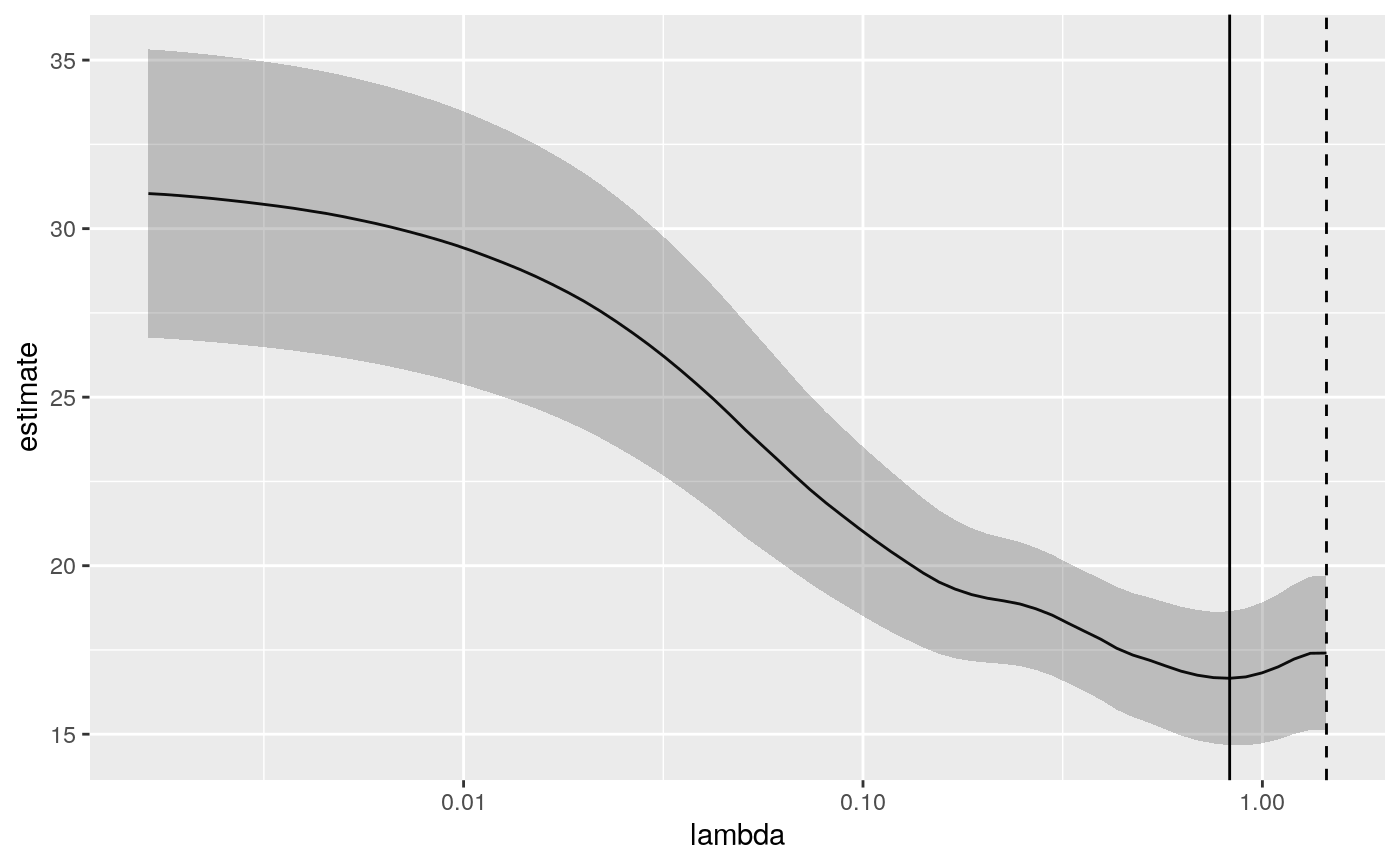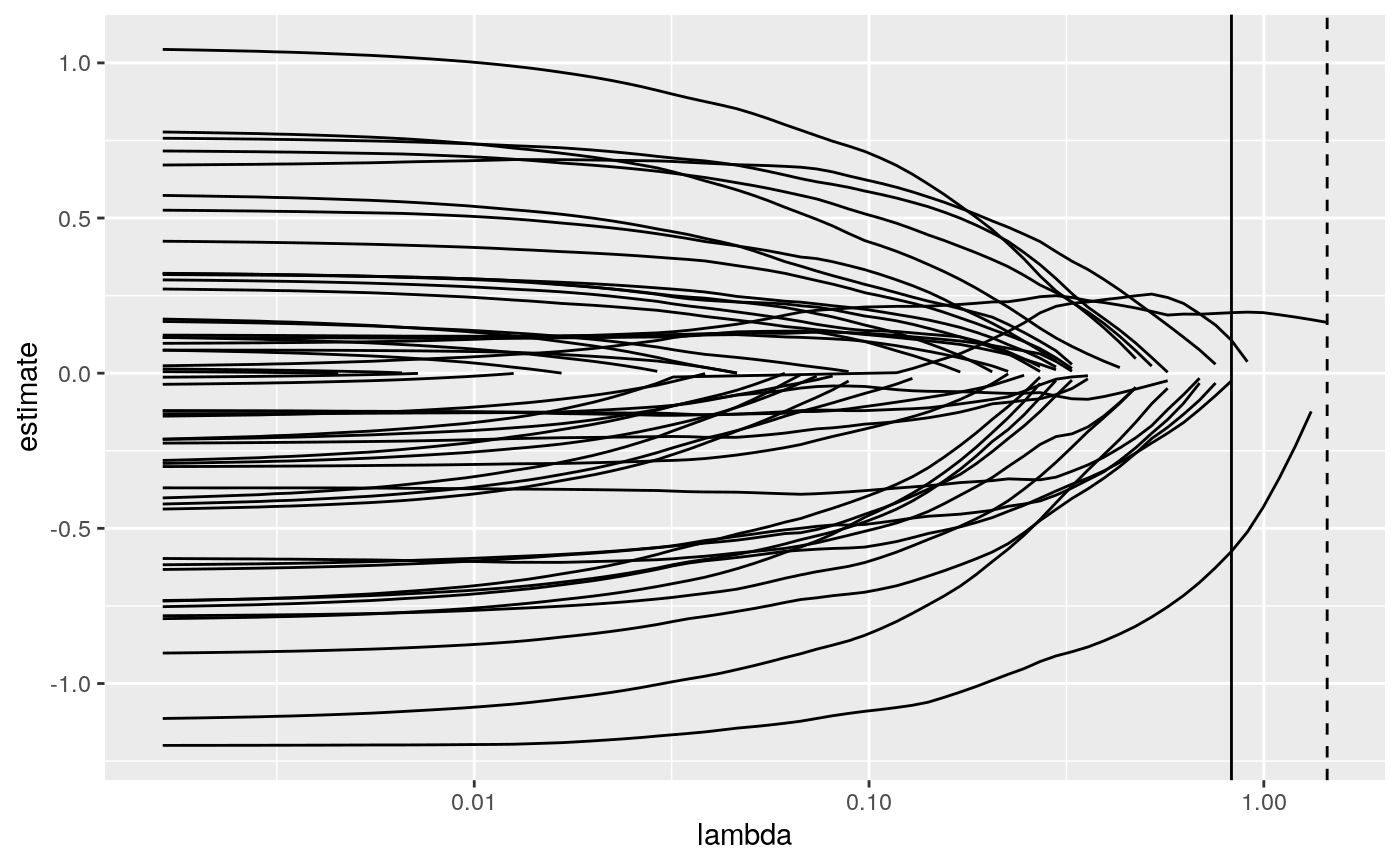 library(glmnet) set.seed(27) nobs <- 100 nvar <- 50 real <- 5 x <- matrix(rnorm(nobs * nvar), nobs, nvar) beta <- c(rnorm(real, 0, 1), rep(0, nvar - real)) y <- c(t(beta) %*% t(x)) + rnorm(nvar, sd = 3) cvfit1 <- cv.glmnet(x, y) tidy(cvfit1)#> # A tibble: 74 x 6 #> lambda estimate std.error conf.low conf.high nzero #> <dbl> <dbl> <dbl> <dbl> <dbl> <int> #> 1 1.45 17.4 2.28 15.1 19.7 0 #> 2 1.32 17.4 2.28 15.1 19.7 1 #> 3 1.20 17.2 2.22 15.0 19.5 1 #> 4 1.09 17.0 2.15 14.8 19.1 1 #> 5 0.997 16.8 2.09 14.7 18.9 1 #> 6 0.909 16.7 2.03 14.7 18.7 2 #> 7 0.828 16.7 1.99 14.7 18.6 3 #> 8 0.754 16.7 1.95 14.7 18.6 5 #> 9 0.687 16.8 1.93 14.8 18.7 7 #> 10 0.626 16.9 1.91 15.0 18.8 7 #> # … with 64 more rowsglance(cvfit1)#> # A tibble: 1 x 3 #> lambda.min lambda.1se nobs #> <dbl> <dbl> <int> #> 1 0.828 1.45 100library(ggplot2) tidied_cv <- tidy(cvfit1) glance_cv <- glance(cvfit1) # plot of MSE as a function of lambda g <- ggplot(tidied_cv, aes(lambda, estimate)) + geom_line() + scale_x_log10() g# plot of MSE as a function of lambda with confidence ribbon g <- g + geom_ribbon(aes(ymin = conf.low, ymax = conf.high), alpha = .25) g# plot of MSE as a function of lambda with confidence ribbon and choices # of minimum lambda marked g <- g + geom_vline(xintercept = glance_cv$lambda.min) + geom_vline(xintercept = glance_cv$lambda.1se, lty = 2) g# plot of number of zeros for each choice of lambda ggplot(tidied_cv, aes(lambda, nzero)) + geom_line() + scale_x_log10()# coefficient plot with min lambda shown tidied <- tidy(cvfit1$glmnet.fit) ggplot(tidied, aes(lambda, estimate, group = term)) + scale_x_log10() + geom_line() + geom_vline(xintercept = glance_cv$lambda.min) + geom_vline(xintercept = glance_cv$lambda.1se, lty = 2)