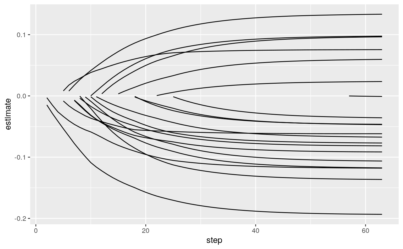 library(glmnet) set.seed(2014) x <- matrix(rnorm(100 * 20), 100, 20) y <- rnorm(100) fit1 <- glmnet(x, y) tidy(fit1)#> # A tibble: 1,086 x 5 #> term step estimate lambda dev.ratio #> <chr> <dbl> <dbl> <dbl> <dbl> #> 1 (Intercept) 1 -0.207 0.152 0 #> 2 (Intercept) 2 -0.208 0.139 0.00464 #> 3 (Intercept) 3 -0.209 0.127 0.0111 #> 4 (Intercept) 4 -0.210 0.115 0.0165 #> 5 (Intercept) 5 -0.210 0.105 0.0240 #> 6 (Intercept) 6 -0.210 0.0957 0.0321 #> 7 (Intercept) 7 -0.210 0.0872 0.0412 #> 8 (Intercept) 8 -0.210 0.0795 0.0497 #> 9 (Intercept) 9 -0.209 0.0724 0.0593 #> 10 (Intercept) 10 -0.208 0.0660 0.0682 #> # … with 1,076 more rowsglance(fit1)#> # A tibble: 1 x 3 #> nulldev npasses nobs #> <dbl> <int> <int> #> 1 104. 255 100library(dplyr) library(ggplot2) tidied <- tidy(fit1) %>% filter(term != "(Intercept)") ggplot(tidied, aes(step, estimate, group = term)) + geom_line()# works for other types of regressions as well, such as logistic g2 <- sample(1:2, 100, replace = TRUE) fit2 <- glmnet(x, g2, family = "binomial") tidy(fit2)#> # A tibble: 947 x 5 #> term step estimate lambda dev.ratio #> <chr> <dbl> <dbl> <dbl> <dbl> #> 1 (Intercept) 1 0.282 0.0906 -1.46e-15 #> 2 (Intercept) 2 0.281 0.0826 6.28e- 3 #> 3 (Intercept) 3 0.279 0.0753 1.55e- 2 #> 4 (Intercept) 4 0.277 0.0686 2.48e- 2 #> 5 (Intercept) 5 0.284 0.0625 4.17e- 2 #> 6 (Intercept) 6 0.293 0.0569 5.79e- 2 #> 7 (Intercept) 7 0.303 0.0519 7.39e- 2 #> 8 (Intercept) 8 0.314 0.0473 8.94e- 2 #> 9 (Intercept) 9 0.325 0.0431 1.03e- 1 #> 10 (Intercept) 10 0.336 0.0392 1.14e- 1 #> # … with 937 more rows