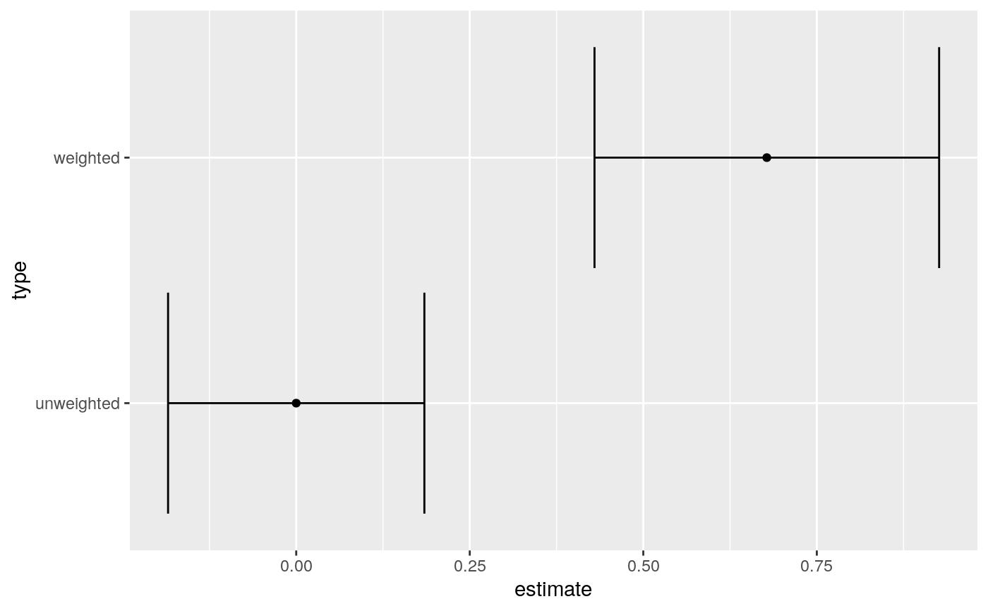 library(psych)#> #>#> #> #>#> #> #>#> #> #>#> #> #>#> #> #>#> #> #>rater1 <- 1:9 rater2 <- c(1, 3, 1, 6, 1, 5, 5, 6, 7) ck <- cohen.kappa(cbind(rater1, rater2)) tidy(ck)#> # A tibble: 2 x 4 #> type estimate conf.low conf.high #> <chr> <dbl> <dbl> <dbl> #> 1 unweighted 0 -0.185 0.185 #> 2 weighted 0.678 0.430 0.926# graph the confidence intervals library(ggplot2) ggplot(tidy(ck), aes(estimate, type)) + geom_point() + geom_errorbarh(aes(xmin = conf.low, xmax = conf.high))