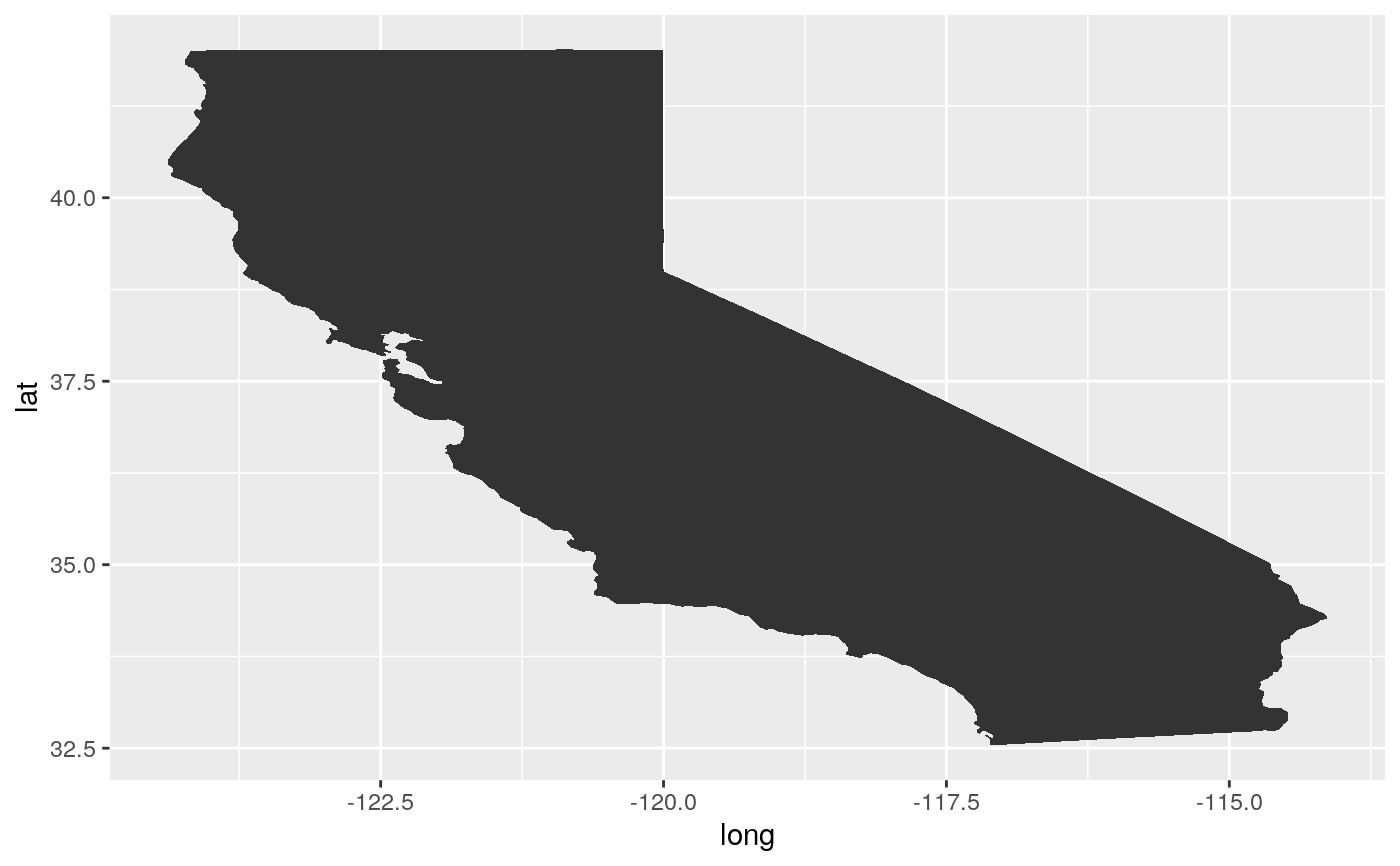 library(maps)#> #>#> #> #>#> # A tibble: 2,977 x 7 #> term long lat group order region subregion #> <chr> <dbl> <dbl> <dbl> <int> <chr> <chr> #> 1 1 -121. 37.5 1 1 california alameda #> 2 2 -122. 37.5 1 2 california alameda #> 3 3 -122. 37.5 1 3 california alameda #> 4 4 -122. 37.5 1 4 california alameda #> 5 5 -122. 37.5 1 5 california alameda #> 6 6 -122. 37.5 1 6 california alameda #> 7 7 -122. 37.5 1 7 california alameda #> 8 8 -122. 37.5 1 8 california alameda #> 9 9 -122. 37.5 1 9 california alameda #> 10 10 -122. 37.5 1 10 california alameda #> # … with 2,967 more rows#> # A tibble: 4,488 x 7 #> term long lat group order region subregion #> <chr> <dbl> <dbl> <dbl> <int> <chr> <chr> #> 1 1 -95.8 31.5 1 1 texas anderson #> 2 2 -95.8 31.6 1 2 texas anderson #> 3 3 -95.8 31.6 1 3 texas anderson #> 4 4 -95.7 31.6 1 4 texas anderson #> 5 5 -95.7 31.6 1 5 texas anderson #> 6 6 -95.7 31.6 1 6 texas anderson #> 7 7 -95.8 31.7 1 7 texas anderson #> 8 8 -95.8 31.7 1 8 texas anderson #> 9 9 -95.8 31.6 1 9 texas anderson #> 10 10 -95.8 31.6 1 10 texas anderson #> # … with 4,478 more rows