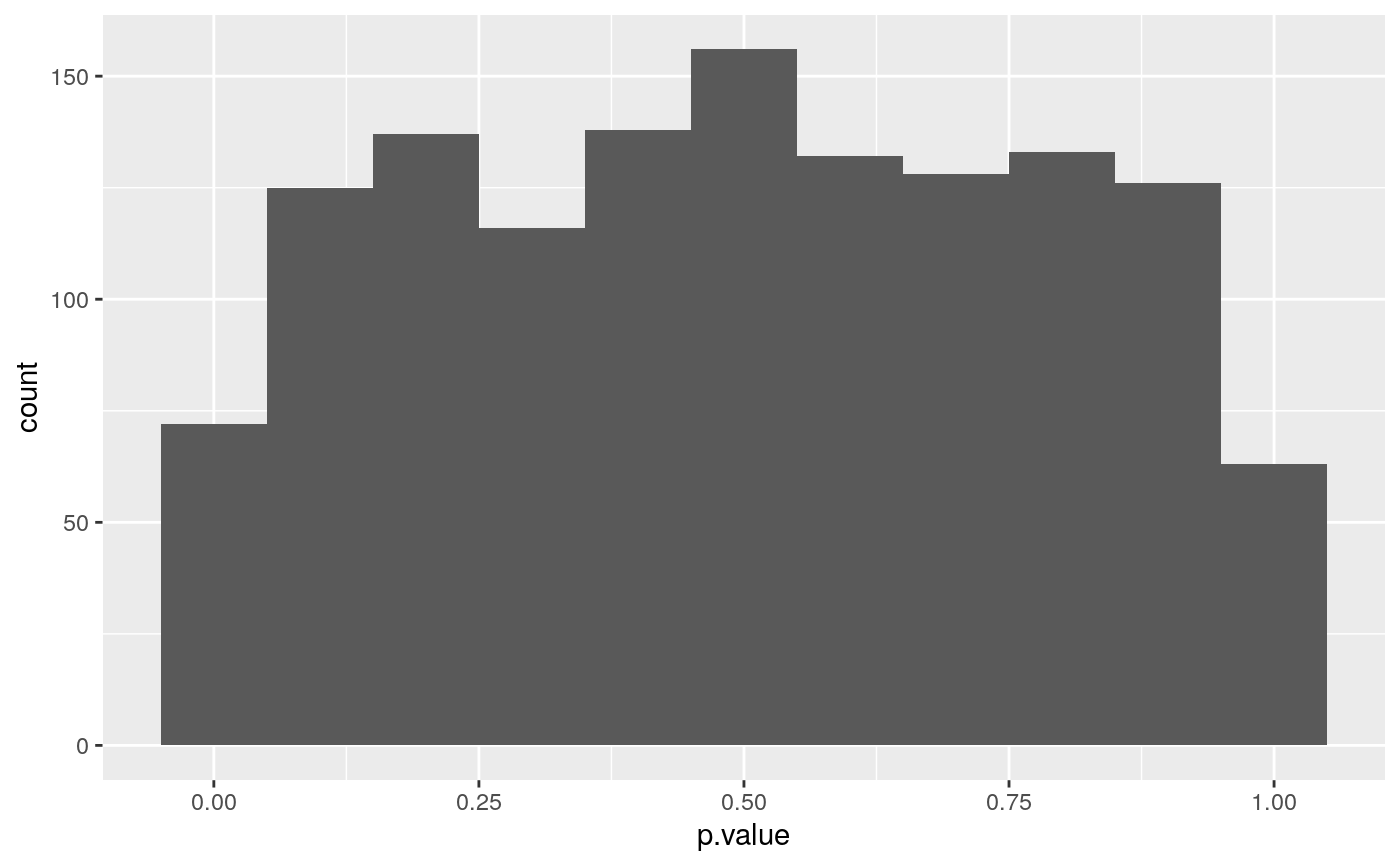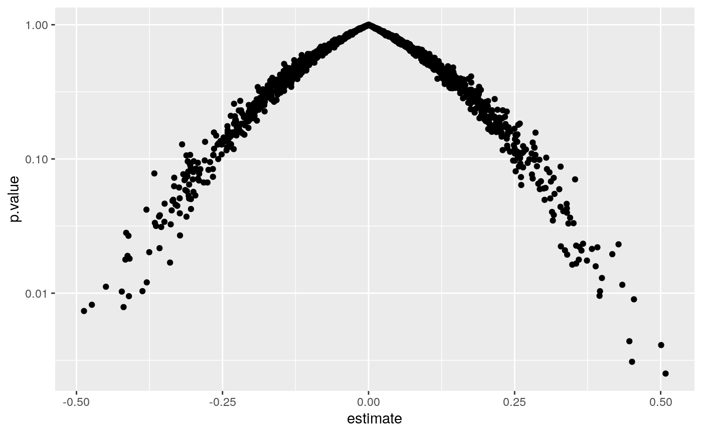 library(Hmisc)#>#> #>#> #> #>#> #> #>#> #> #>#> #> #>#> #> #>#> #> #>mat <- replicate(52, rnorm(100)) # add some NAs mat[sample(length(mat), 2000)] <- NA # also column names colnames(mat) <- c(LETTERS, letters) rc <- rcorr(mat) td <- tidy(rc) td#> # A tibble: 1,326 x 5 #> column1 column2 estimate n p.value #> <chr> <chr> <dbl> <int> <dbl> #> 1 B A 0.0670 36 0.698 #> 2 C A 0.196 38 0.239 #> 3 C B 0.172 37 0.309 #> 4 D A -0.0397 36 0.818 #> 5 D B -0.00762 31 0.968 #> 6 D C 0.250 42 0.110 #> 7 E A 0.224 36 0.189 #> 8 E B 0.0700 35 0.690 #> 9 E C 0.211 46 0.159 #> 10 E D 0.147 40 0.364 #> # … with 1,316 more rows