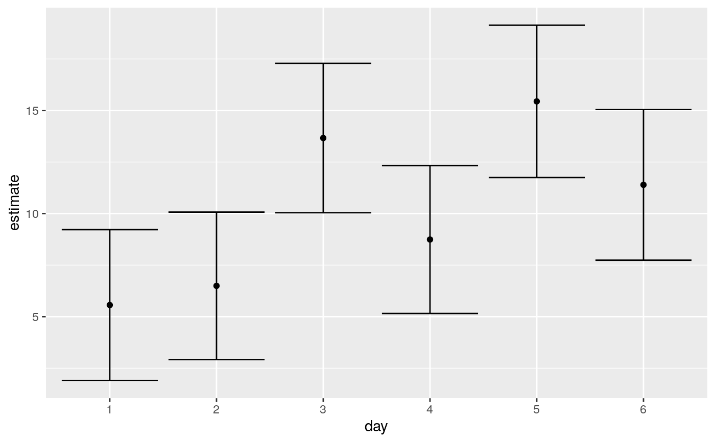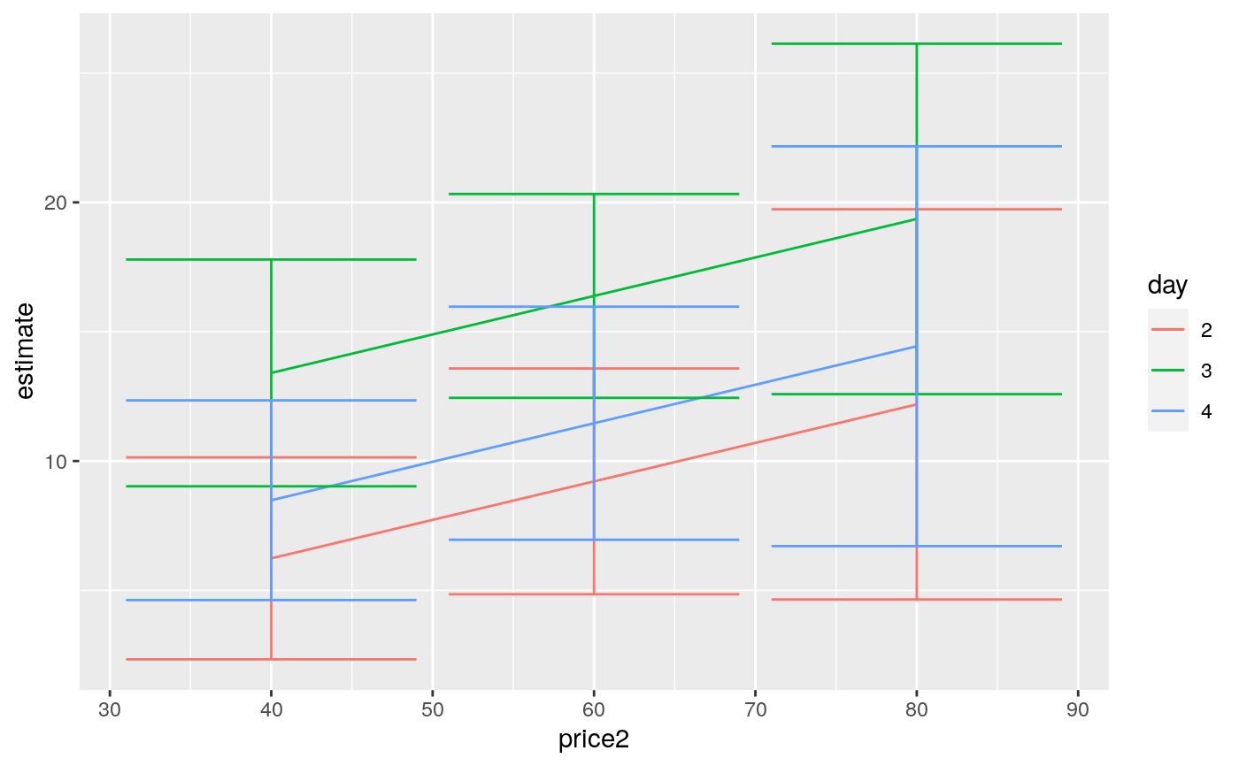 library(emmeans) # linear model for sales of oranges per day oranges_lm1 <- lm(sales1 ~ price1 + price2 + day + store, data = oranges) # reference grid; see vignette("basics", package = "emmeans") oranges_rg1 <- ref_grid(oranges_lm1) td <- tidy(oranges_rg1) td#> # A tibble: 36 x 9 #> price1 price2 day store estimate std.error df statistic p.value #> <dbl> <dbl> <chr> <chr> <dbl> <dbl> <dbl> <dbl> <dbl> #> 1 51.2 48.6 1 1 2.92 2.72 23 1.07 0.294 #> 2 51.2 48.6 2 1 3.85 2.70 23 1.42 0.168 #> 3 51.2 48.6 3 1 11.0 2.53 23 4.35 0.000237 #> 4 51.2 48.6 4 1 6.10 2.65 23 2.30 0.0309 #> 5 51.2 48.6 5 1 12.8 2.44 23 5.23 0.0000261 #> 6 51.2 48.6 6 1 8.75 2.79 23 3.14 0.00459 #> 7 51.2 48.6 1 2 4.96 2.38 23 2.09 0.0482 #> 8 51.2 48.6 2 2 5.89 2.34 23 2.52 0.0190 #> 9 51.2 48.6 3 2 13.1 2.42 23 5.41 0.0000172 #> 10 51.2 48.6 4 2 8.14 2.35 23 3.46 0.00212 #> # … with 26 more rows#> # A tibble: 6 x 6 #> day estimate std.error df statistic p.value #> <chr> <dbl> <dbl> <dbl> <dbl> <dbl> #> 1 1 5.56 1.77 23 3.15 0.00451 #> 2 2 6.49 1.73 23 3.76 0.00103 #> 3 3 13.7 1.75 23 7.80 0.0000000658 #> 4 4 8.74 1.73 23 5.04 0.0000420 #> 5 5 15.4 1.79 23 8.65 0.0000000110 #> 6 6 11.4 1.77 23 6.45 0.00000140#> # A tibble: 6 x 8 #> term contrast null.value estimate std.error df statistic adj.p.value #> <chr> <chr> <dbl> <dbl> <dbl> <dbl> <dbl> <dbl> #> 1 day 1 effect 0 -4.65 1.62 23 -2.87 0.0261 #> 2 day 2 effect 0 -3.72 1.58 23 -2.36 0.0547 #> 3 day 3 effect 0 3.45 1.60 23 2.15 0.0637 #> 4 day 4 effect 0 -1.47 1.59 23 -0.930 0.434 #> 5 day 5 effect 0 5.22 1.64 23 3.18 0.0249 #> 6 day 6 effect 0 1.18 1.62 23 0.726 0.475#> # A tibble: 15 x 8 #> term contrast null.value estimate std.error df statistic adj.p.value #> <chr> <chr> <dbl> <dbl> <dbl> <dbl> <dbl> <dbl> #> 1 day 1 - 2 0 -0.930 2.47 23 -0.377 0.999 #> 2 day 1 - 3 0 -8.10 2.47 23 -3.29 0.0337 #> 3 day 1 - 4 0 -3.18 2.51 23 -1.27 0.799 #> 4 day 1 - 5 0 -9.88 2.56 23 -3.86 0.00913 #> 5 day 1 - 6 0 -5.83 2.52 23 -2.31 0.229 #> 6 day 2 - 3 0 -7.17 2.48 23 -2.89 0.0777 #> 7 day 2 - 4 0 -2.25 2.44 23 -0.920 0.937 #> 8 day 2 - 5 0 -8.95 2.52 23 -3.56 0.0184 #> 9 day 2 - 6 0 -4.90 2.45 23 -2.00 0.371 #> 10 day 3 - 4 0 4.92 2.49 23 1.98 0.385 #> 11 day 3 - 5 0 -1.78 2.47 23 -0.719 0.978 #> 12 day 3 - 6 0 2.27 2.54 23 0.894 0.944 #> 13 day 4 - 5 0 -6.70 2.49 23 -2.69 0.115 #> 14 day 4 - 6 0 -2.65 2.45 23 -1.08 0.883 #> 15 day 5 - 6 0 4.05 2.56 23 1.58 0.617# plot confidence intervals library(ggplot2) ggplot(tidy(marginal, conf.int = TRUE), aes(day, estimate)) + geom_point() + geom_errorbar(aes(ymin = conf.low, ymax = conf.high))# by multiple prices by_price <- emmeans(oranges_lm1, "day", by = "price2", at = list( price1 = 50, price2 = c(40, 60, 80), day = c("2", "3", "4") ) ) by_price#> price2 = 40: #> day emmean SE df lower.CL upper.CL #> 2 6.24 1.89 23 2.33 10.1 #> 3 13.41 2.12 23 9.02 17.8 #> 4 8.48 1.87 23 4.62 12.3 #> #> price2 = 60: #> day emmean SE df lower.CL upper.CL #> 2 9.21 2.11 23 4.85 13.6 #> 3 16.38 1.91 23 12.44 20.3 #> 4 11.46 2.18 23 6.96 16.0 #> #> price2 = 80: #> day emmean SE df lower.CL upper.CL #> 2 12.19 3.65 23 4.65 19.7 #> 3 19.36 3.27 23 12.59 26.1 #> 4 14.44 3.74 23 6.71 22.2 #> #> Results are averaged over the levels of: store #> Confidence level used: 0.95tidy(by_price)#> # A tibble: 9 x 7 #> day price2 estimate std.error df statistic p.value #> <chr> <dbl> <dbl> <dbl> <dbl> <dbl> <dbl> #> 1 2 40 6.24 1.89 23 3.30 0.00310 #> 2 3 40 13.4 2.12 23 6.33 0.00000187 #> 3 4 40 8.48 1.87 23 4.55 0.000145 #> 4 2 60 9.21 2.11 23 4.37 0.000225 #> 5 3 60 16.4 1.91 23 8.60 0.0000000122 #> 6 4 60 11.5 2.18 23 5.26 0.0000244 #> 7 2 80 12.2 3.65 23 3.34 0.00282 #> 8 3 80 19.4 3.27 23 5.91 0.00000502 #> 9 4 80 14.4 3.74 23 3.86 0.000788ggplot(tidy(by_price, conf.int = TRUE), aes(price2, estimate, color = day)) + geom_line() + geom_errorbar(aes(ymin = conf.low, ymax = conf.high))#> # A tibble: 2 x 5 #> term num.df den.df statistic p.value #> <chr> <dbl> <dbl> <dbl> <dbl> #> 1 day 5 23 4.88 0.00346 #> 2 store 5 23 2.52 0.0583