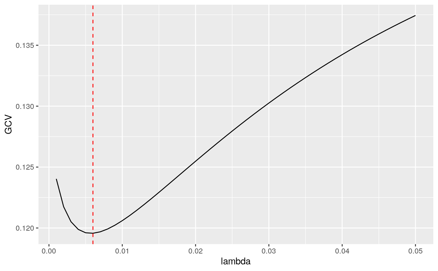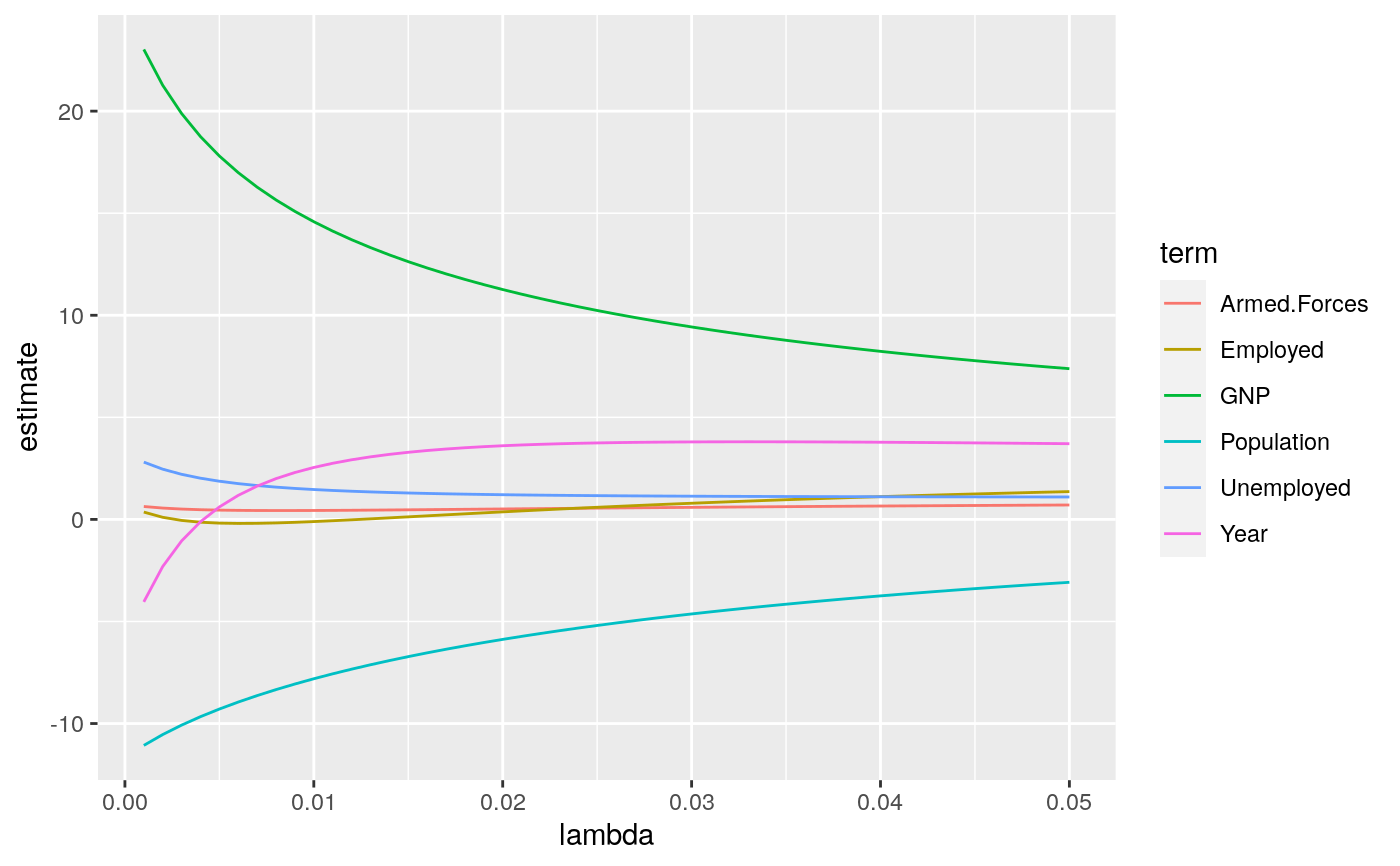 #> # A tibble: 6 x 5 #> lambda GCV term estimate scale #> <dbl> <dbl> <chr> <dbl> <dbl> #> 1 0 0.128 GNP 25.4 96.2 #> 2 0 0.128 Unemployed 3.30 90.5 #> 3 0 0.128 Armed.Forces 0.752 67.4 #> 4 0 0.128 Population -11.7 6.74 #> 5 0 0.128 Year -6.54 4.61 #> 6 0 0.128 Employed 0.786 3.40fit2 <- MASS::lm.ridge(y ~ ., longley, lambda = seq(0.001, .05, .001)) td2 <- tidy(fit2) g2 <- glance(fit2) # coefficient plot library(ggplot2) ggplot(td2, aes(lambda, estimate, color = term)) + geom_line()# add line for the GCV minimizing estimate ggplot(td2, aes(lambda, GCV)) + geom_line() + geom_vline(xintercept = g2$lambdaGCV, col = "red", lty = 2)