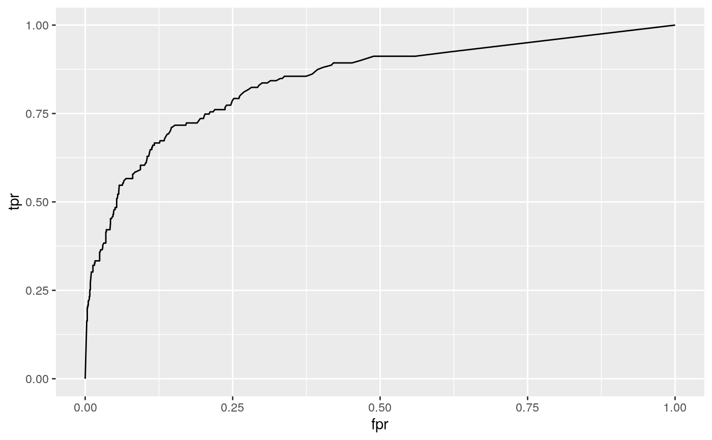 library(AUC)#>#>#> #>#> #> #>#> # A tibble: 220 x 3 #> cutoff fpr tpr #> <dbl> <dbl> <dbl> #> 1 1 0 0 #> 2 1 0.00262 0.164 #> 3 0.972 0.00350 0.164 #> 4 0.968 0.00350 0.182 #> 5 0.964 0.00350 0.189 #> 6 0.96 0.00350 0.201 #> 7 0.932 0.00437 0.201 #> 8 0.91 0.00437 0.208 #> 9 0.908 0.00525 0.208 #> 10 0.902 0.00525 0.214 #> # … with 210 more rows# compare the ROC curves for two prediction algorithms library(dplyr) library(tidyr) rocs <- churn %>% pivot_longer(contains("predictions"), names_to = "algorithm", values_to = "value" ) %>% nest(data = -algorithm) %>% mutate(tidy_roc = purrr::map(data, ~ tidy(roc(.x$value, .x$labels)))) %>% unnest(tidy_roc) ggplot(rocs, aes(fpr, tpr, color = algorithm)) + geom_line()
