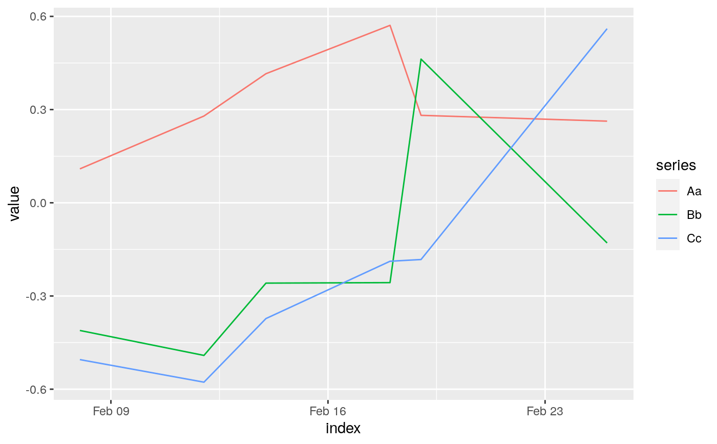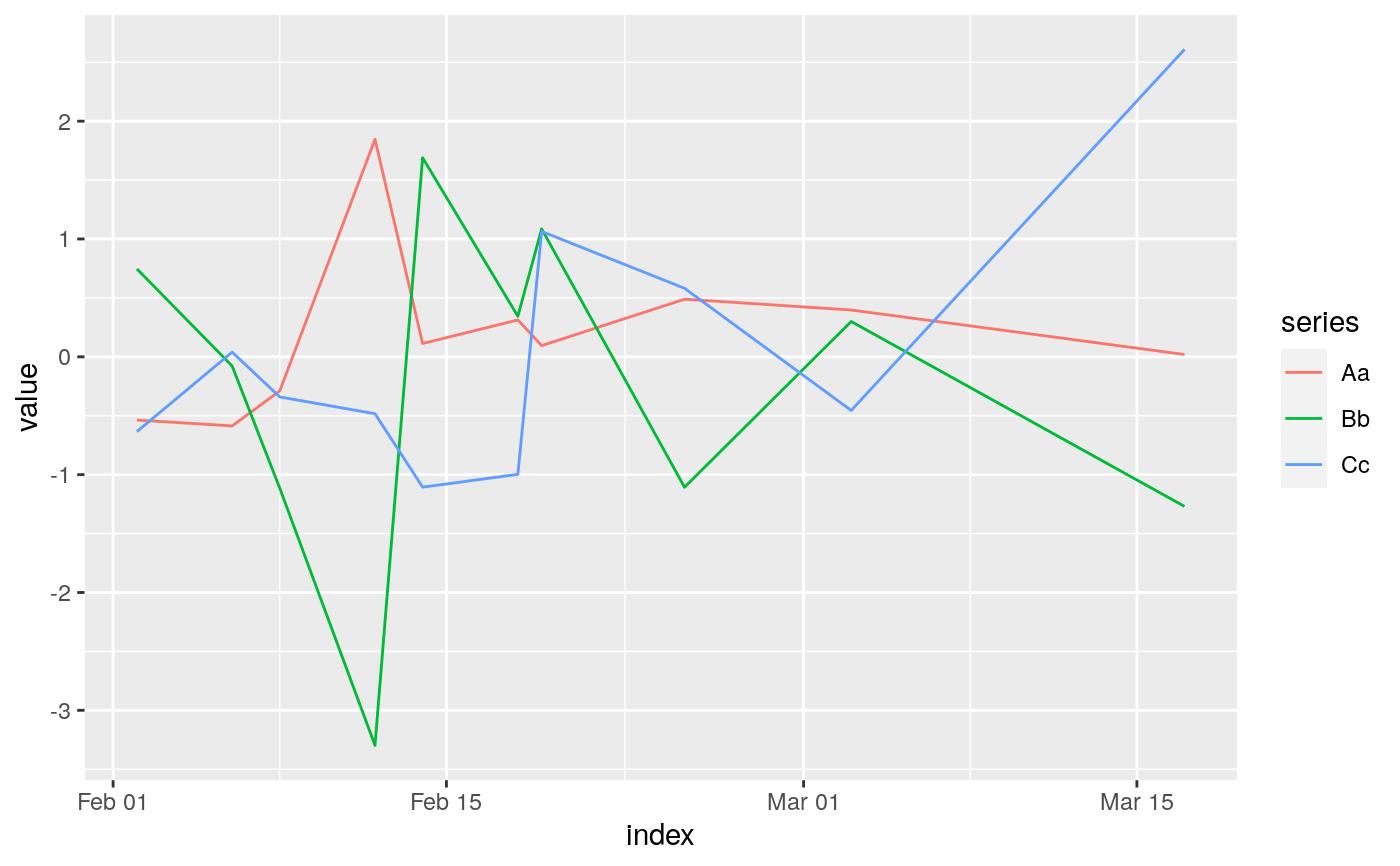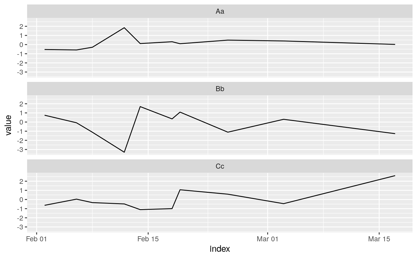 library(zoo) library(ggplot2) set.seed(1071) # data generated as shown in the zoo vignette Z.index <- as.Date(sample(12450:12500, 10)) Z.data <- matrix(rnorm(30), ncol = 3) colnames(Z.data) <- c("Aa", "Bb", "Cc") Z <- zoo(Z.data, Z.index) tidy(Z)#> # A tibble: 30 x 3 #> index series value #> <date> <chr> <dbl> #> 1 2004-02-02 Aa -0.537 #> 2 2004-02-02 Bb 0.746 #> 3 2004-02-02 Cc -0.634 #> 4 2004-02-06 Aa -0.586 #> 5 2004-02-06 Bb -0.0779 #> 6 2004-02-06 Cc 0.0397 #> 7 2004-02-08 Aa -0.289 #> 8 2004-02-08 Bb -1.11 #> 9 2004-02-08 Cc -0.341 #> 10 2004-02-12 Aa 1.85 #> # … with 20 more rows