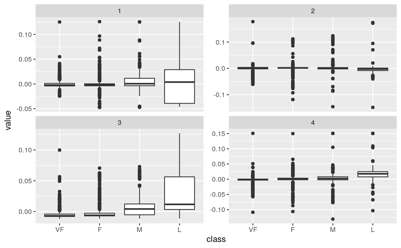 library(modeldata) data(hpc_data) mat <- scale(as.matrix(hpc_data[, 2:5])) s <- svd(mat) tidy_u <- tidy(s, matrix = "u")#> #> #> #> #>tidy_u#> # A tibble: 17,324 x 3 #> row PC value #> <int> <dbl> <dbl> #> 1 1 1 0.00403 #> 2 2 1 -0.00436 #> 3 3 1 -0.00196 #> 4 4 1 -0.00444 #> 5 5 1 -0.00437 #> 6 6 1 -0.00437 #> 7 7 1 -0.00431 #> 8 8 1 -0.00436 #> 9 9 1 -0.00434 #> 10 10 1 -0.00440 #> # … with 17,314 more rows#> # A tibble: 4 x 4 #> PC std.dev percent cumulative #> <int> <dbl> <dbl> <dbl> #> 1 1 69.5 0.279 0.279 #> 2 2 67.0 0.259 0.538 #> 3 3 63.9 0.235 0.774 #> 4 4 62.6 0.226 1.00#> #> #> #> #>tidy_v#> # A tibble: 16 x 3 #> column PC value #> <int> <dbl> <dbl> #> 1 1 1 0.657 #> 2 2 1 0.409 #> 3 3 1 -0.577 #> 4 4 1 0.262 #> 5 1 2 -0.0142 #> 6 2 2 -0.650 #> 7 3 2 -0.137 #> 8 4 2 0.747 #> 9 1 3 0.302 #> 10 2 3 0.332 #> 11 3 3 0.779 #> 12 4 3 0.438 #> 13 1 4 0.690 #> 14 2 4 -0.548 #> 15 3 4 0.205 #> 16 4 4 -0.426library(ggplot2) library(dplyr) ggplot(tidy_d, aes(PC, percent)) + geom_point() + ylab("% of variance explained")tidy_u %>% mutate(class = hpc_data$class[row]) %>% ggplot(aes(class, value)) + geom_boxplot() + facet_wrap(~PC, scale = "free_y")