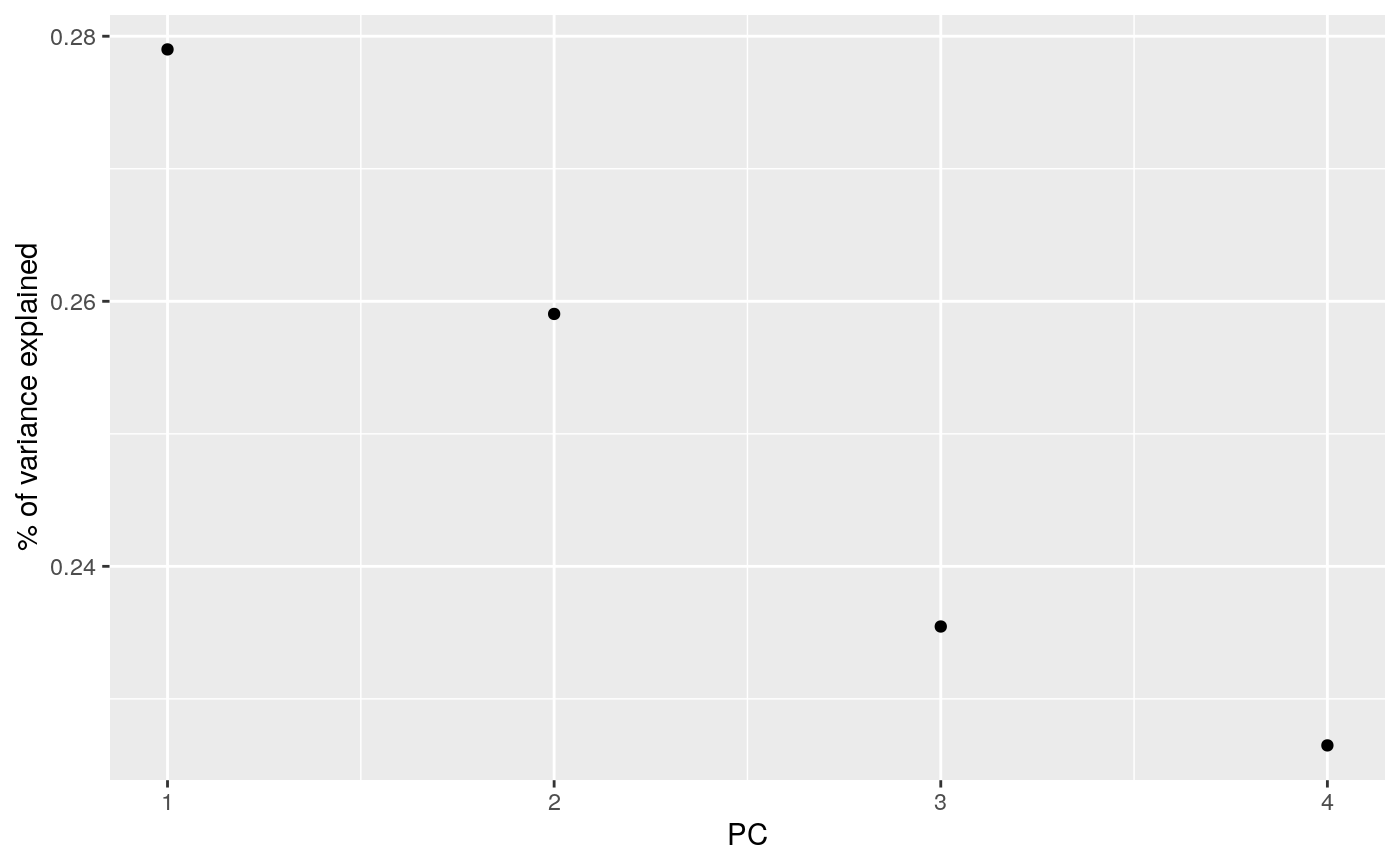 library(modeldata) data(hpc_data) mat <- scale(as.matrix(hpc_data[, 2:5])) s <- svd(mat) tidy_u <- tidy(s, matrix = "u")#> #> #> #> #>tidy_u#> # A tibble: 17,324 x 3 #> row PC value #> <int> <dbl> <dbl> #> 1 1 1 0.00403 #> 2 2 1 -0.00436 #> 3 3 1 -0.00196 #> 4 4 1 -0.00444 #> 5 5 1 -0.00437 #> 6 6 1 -0.00437 #> 7 7 1 -0.00431 #> 8 8 1 -0.00436 #> 9 9 1 -0.00434 #> 10 10 1 -0.00440 #> # … with 17,314 more rows#> # A tibble: 4 x 4 #> PC std.dev percent cumulative #> <int> <dbl> <dbl> <dbl> #> 1 1 69.5 0.279 0.279 #> 2 2 67.0 0.259 0.538 #> 3 3 63.9 0.235 0.774 #> 4 4 62.6 0.226 1.00#> #> #> #> #>tidy_v#> # A tibble: 16 x 3 #> column PC value #> <int> <dbl> <dbl> #> 1 1 1 0.657 #> 2 2 1 0.409 #> 3 3 1 -0.577 #> 4 4 1 0.262 #> 5 1 2 -0.0142 #> 6 2 2 -0.650 #> 7 3 2 -0.137 #> 8 4 2 0.747 #> 9 1 3 0.302 #> 10 2 3 0.332 #> 11 3 3 0.779 #> 12 4 3 0.438 #> 13 1 4 0.690 #> 14 2 4 -0.548 #> 15 3 4 0.205 #> 16 4 4 -0.426library(ggplot2) library(dplyr) ggplot(tidy_d, aes(PC, percent)) + geom_point() + ylab("% of variance explained")tidy_u %>% mutate(class = hpc_data$class[row]) %>% ggplot(aes(class, value)) + geom_boxplot() + facet_wrap(~PC, scale = "free_y")