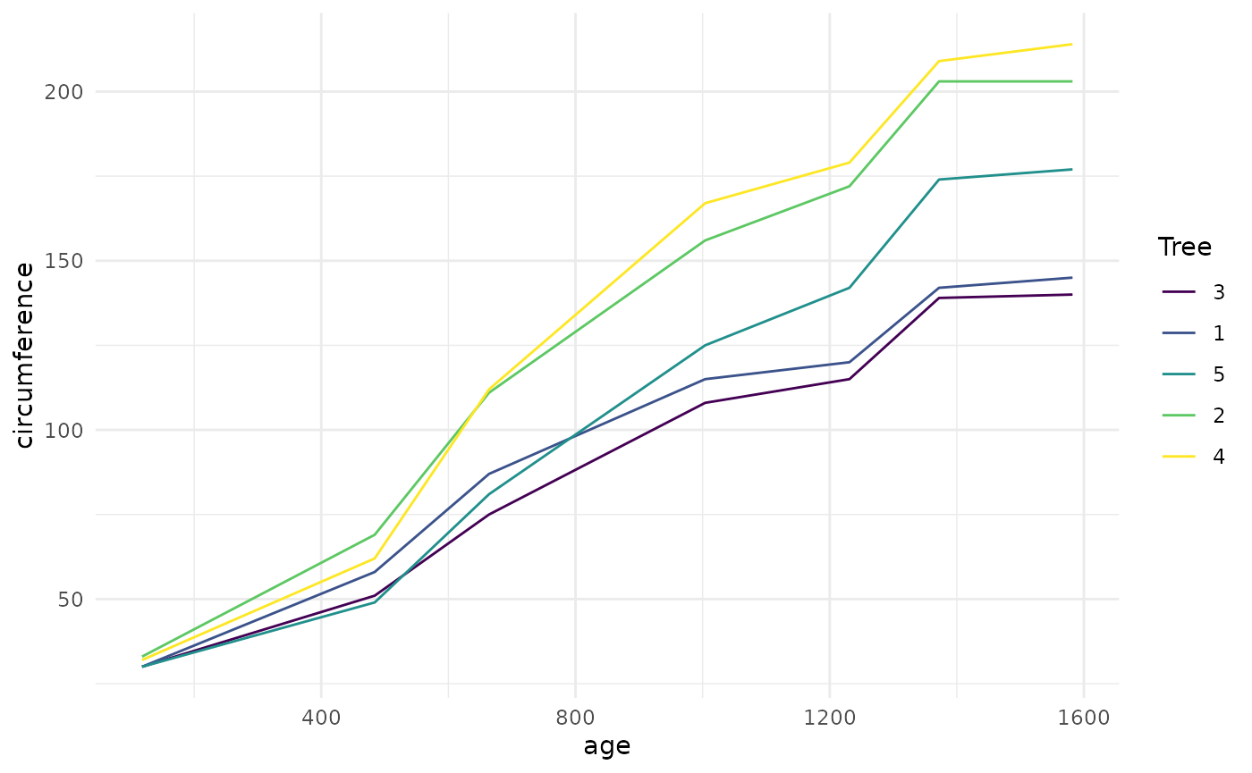 This contains 35 observations of three variables: Tree, age, and circumference. Tree is a factor with five levels describing five trees. As might be expected, age and circumference are correlated: