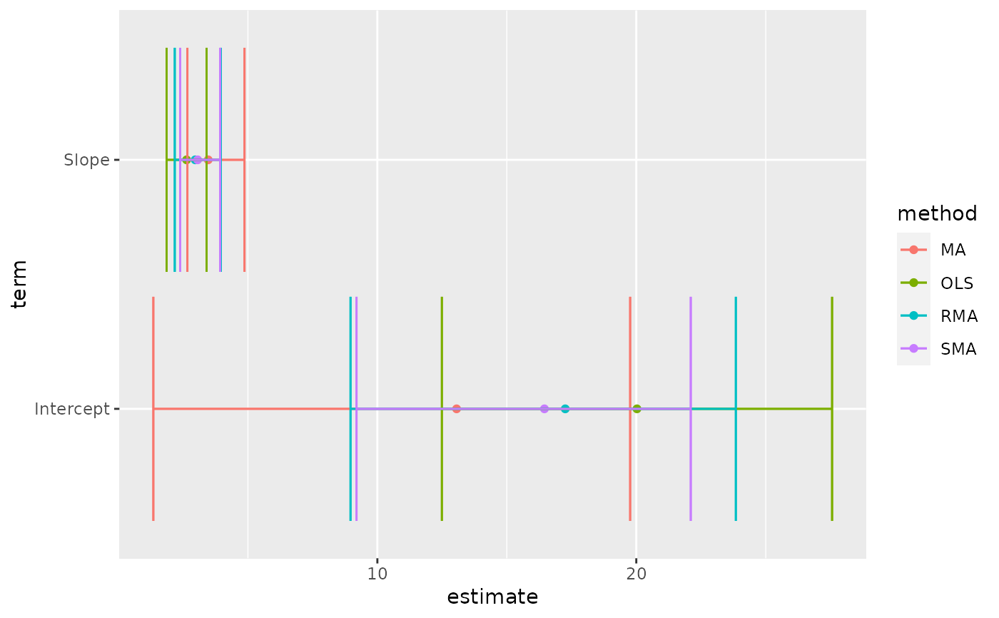 #> # A tibble: 8 x 6 #> method term estimate conf.low conf.high p.value #> <fct> <chr> <dbl> <dbl> <dbl> <dbl> #> 1 MA Intercept 13.1 1.35 19.8 0.01 #> 2 MA Slope 3.47 2.66 4.87 0.01 #> 3 OLS Intercept 20.0 12.5 27.6 0.01 #> 4 OLS Slope 2.63 1.86 3.40 0.01 #> 5 RMA Intercept 17.3 8.96 23.8 0.01 #> 6 RMA Slope 2.96 2.17 3.96 0.01 #> 7 SMA Intercept 16.5 9.20 22.1 NA #> 8 SMA Slope 3.06 2.38 3.93 NA