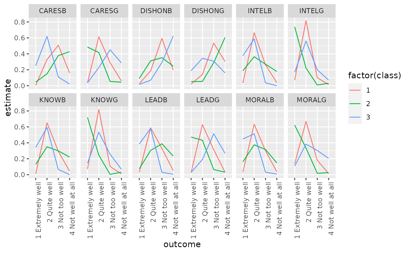 library(poLCA) library(dplyr) data(values) f <- cbind(A, B, C, D) ~ 1 M1 <- poLCA(f, values, nclass = 2, verbose = FALSE) M1#> Conditional item response (column) probabilities, #> by outcome variable, for each class (row) #> #> $A #> Pr(1) Pr(2) #> class 1: 0.0068 0.9932 #> class 2: 0.2864 0.7136 #> #> $B #> Pr(1) Pr(2) #> class 1: 0.0602 0.9398 #> class 2: 0.6704 0.3296 #> #> $C #> Pr(1) Pr(2) #> class 1: 0.0735 0.9265 #> class 2: 0.6460 0.3540 #> #> $D #> Pr(1) Pr(2) #> class 1: 0.2309 0.7691 #> class 2: 0.8676 0.1324 #> #> Estimated class population shares #> 0.2792 0.7208 #> #> Predicted class memberships (by modal posterior prob.) #> 0.3287 0.6713 #> #> ========================================================= #> Fit for 2 latent classes: #> ========================================================= #> number of observations: 216 #> number of estimated parameters: 9 #> residual degrees of freedom: 6 #> maximum log-likelihood: -504.4677 #> #> AIC(2): 1026.935 #> BIC(2): 1057.313 #> G^2(2): 2.719922 (Likelihood ratio/deviance statistic) #> X^2(2): 2.719764 (Chi-square goodness of fit) #>#> # A tibble: 16 x 5 #> variable class outcome estimate std.error #> <chr> <int> <dbl> <dbl> <dbl> #> 1 A 1 1 0.00681 0.0254 #> 2 A 2 1 0.286 0.0393 #> 3 A 1 2 0.993 0.0254 #> 4 A 2 2 0.714 0.0393 #> 5 B 1 1 0.0602 0.0649 #> 6 B 2 1 0.670 0.0489 #> 7 B 1 2 0.940 0.0649 #> 8 B 2 2 0.330 0.0489 #> 9 C 1 1 0.0735 0.0642 #> 10 C 2 1 0.646 0.0482 #> 11 C 1 2 0.927 0.0642 #> 12 C 2 2 0.354 0.0482 #> 13 D 1 1 0.231 0.0929 #> 14 D 2 1 0.868 0.0379 #> 15 D 1 2 0.769 0.0929 #> 16 D 2 2 0.132 0.0379#> # A tibble: 216 x 7 #> A B C D X.Intercept. .class .probability #> <dbl> <dbl> <dbl> <dbl> <dbl> <int> <dbl> #> 1 2 2 2 2 1 1 0.959 #> 2 2 2 2 2 1 1 0.959 #> 3 2 2 2 2 1 1 0.959 #> 4 2 2 2 2 1 1 0.959 #> 5 2 2 2 2 1 1 0.959 #> 6 2 2 2 2 1 1 0.959 #> 7 2 2 2 2 1 1 0.959 #> 8 2 2 2 2 1 1 0.959 #> 9 2 2 2 2 1 1 0.959 #> 10 2 2 2 2 1 1 0.959 #> # … with 206 more rows#> # A tibble: 1 x 8 #> logLik AIC BIC g.squared chi.squared df df.residual nobs #> <dbl> <dbl> <dbl> <dbl> <dbl> <dbl> <dbl> <int> #> 1 -504. 1027. 1057. 2.72 2.72 9 6 216library(ggplot2) ggplot(tidy(M1), aes(factor(class), estimate, fill = factor(outcome))) + geom_bar(stat = "identity", width = 1) + facet_wrap(~variable)## Three-class model with a single covariate. data(election) f2a <- cbind( MORALG, CARESG, KNOWG, LEADG, DISHONG, INTELG, MORALB, CARESB, KNOWB, LEADB, DISHONB, INTELB ) ~ PARTY nes2a <- poLCA(f2a, election, nclass = 3, nrep = 5, verbose = FALSE) td <- tidy(nes2a) td#> # A tibble: 144 x 5 #> variable class outcome estimate std.error #> <chr> <int> <fct> <dbl> <dbl> #> 1 MORALG 1 1 Extremely well 0.137 0.0182 #> 2 MORALG 2 1 Extremely well 0.622 0.0309 #> 3 MORALG 3 1 Extremely well 0.108 0.0175 #> 4 MORALG 1 2 Quite well 0.668 0.0247 #> 5 MORALG 2 2 Quite well 0.335 0.0293 #> 6 MORALG 3 2 Quite well 0.383 0.0274 #> 7 MORALG 1 3 Not too well 0.180 0.0208 #> 8 MORALG 2 3 Not too well 0.0172 0.00841 #> 9 MORALG 3 3 Not too well 0.304 0.0253 #> 10 MORALG 1 4 Not well at all 0.0143 0.00680 #> # … with 134 more rows# show ggplot(td, aes(outcome, estimate, color = factor(class), group = class)) + geom_line() + facet_wrap(~variable, nrow = 2) + theme(axis.text.x = element_text(angle = 90, hjust = 1))#> # A tibble: 1,300 x 16 #> MORALG CARESG KNOWG LEADG DISHONG INTELG MORALB CARESB KNOWB LEADB DISHONB #> <fct> <fct> <fct> <fct> <fct> <fct> <fct> <fct> <fct> <fct> <fct> #> 1 3 Not… 1 Ext… 2 Qu… 2 Qu… 3 Not … 2 Qui… 1 Ext… 1 Ext… 2 Qu… 2 Qu… 4 Not … #> 2 1 Ext… 2 Qui… 2 Qu… 1 Ex… 3 Not … 2 Qui… 2 Qui… 2 Qui… 2 Qu… 3 No… 3 Not … #> 3 2 Qui… 2 Qui… 2 Qu… 2 Qu… 2 Quit… 2 Qui… 2 Qui… 3 Not… 2 Qu… 2 Qu… 3 Not … #> 4 2 Qui… 4 Not… 2 Qu… 3 No… 2 Quit… 2 Qui… 1 Ext… 1 Ext… 2 Qu… 2 Qu… 3 Not … #> 5 2 Qui… 2 Qui… 2 Qu… 2 Qu… 3 Not … 2 Qui… 3 Not… 4 Not… 4 No… 4 No… 3 Not … #> 6 2 Qui… 2 Qui… 2 Qu… 3 No… 4 Not … 2 Qui… 2 Qui… 3 Not… 2 Qu… 2 Qu… 3 Not … #> 7 1 Ext… 1 Ext… 1 Ex… 1 Ex… 4 Not … 1 Ext… 2 Qui… 4 Not… 2 Qu… 3 No… 3 Not … #> 8 2 Qui… 2 Qui… 2 Qu… 2 Qu… 3 Not … 2 Qui… 3 Not… 2 Qui… 2 Qu… 2 Qu… 3 Not … #> 9 2 Qui… 2 Qui… 2 Qu… 2 Qu… 3 Not … 2 Qui… 2 Qui… 2 Qui… 2 Qu… 3 No… 2 Quit… #> 10 2 Qui… 3 Not… 2 Qu… 2 Qu… 3 Not … 2 Qui… 2 Qui… 4 Not… 2 Qu… 4 No… 2 Quit… #> # … with 1,290 more rows, and 5 more variables: INTELB <fct>, #> # X.Intercept. <dbl>, PARTY <dbl>, .class <int>, .probability <dbl>#> # A tibble: 3 x 2 #> .class n #> <int> <int> #> 1 1 496 #> 2 2 360 #> 3 3 444# if the original data is provided, it leads to NAs in new columns # for rows that weren't predicted au2 <- augment(nes2a, data = election) au2#> # A tibble: 1,785 x 20 #> MORALG CARESG KNOWG LEADG DISHONG INTELG MORALB CARESB KNOWB LEADB DISHONB #> <fct> <fct> <fct> <fct> <fct> <fct> <fct> <fct> <fct> <fct> <fct> #> 1 3 Not… 1 Ext… 2 Qu… 2 Qu… 3 Not … 2 Qui… 1 Ext… 1 Ext… 2 Qu… 2 Qu… 4 Not … #> 2 4 Not… 3 Not… 4 No… 3 No… 2 Quit… 2 Qui… NA NA 2 Qu… 3 No… NA #> 3 1 Ext… 2 Qui… 2 Qu… 1 Ex… 3 Not … 2 Qui… 2 Qui… 2 Qui… 2 Qu… 3 No… 3 Not … #> 4 2 Qui… 2 Qui… 2 Qu… 2 Qu… 2 Quit… 2 Qui… 2 Qui… 3 Not… 2 Qu… 2 Qu… 3 Not … #> 5 2 Qui… 4 Not… 2 Qu… 3 No… 2 Quit… 2 Qui… 1 Ext… 1 Ext… 2 Qu… 2 Qu… 3 Not … #> 6 2 Qui… 3 Not… 3 No… 2 Qu… 2 Quit… 2 Qui… 2 Qui… NA 3 No… 2 Qu… 2 Quit… #> 7 2 Qui… NA 2 Qu… 2 Qu… 4 Not … 2 Qui… NA 3 Not… 2 Qu… 2 Qu… 4 Not … #> 8 2 Qui… 2 Qui… 2 Qu… 2 Qu… 3 Not … 2 Qui… 3 Not… 4 Not… 4 No… 4 No… 3 Not … #> 9 2 Qui… 2 Qui… 2 Qu… 3 No… 4 Not … 2 Qui… 2 Qui… 3 Not… 2 Qu… 2 Qu… 3 Not … #> 10 1 Ext… 1 Ext… 1 Ex… 1 Ex… 4 Not … 1 Ext… 2 Qui… 4 Not… 2 Qu… 3 No
