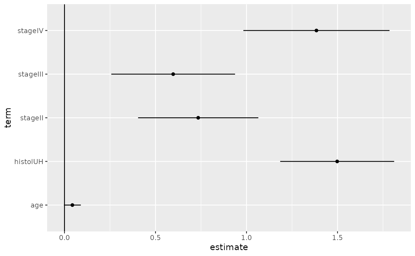 #> # A tibble: 5 x 7 #> term estimate std.error statistic p.value conf.low conf.high #> <chr> <dbl> <dbl> <dbl> <dbl> <dbl> <dbl> #> 1 stageII 0.735 0.168 4.36 1.30e- 5 0.404 1.06 #> 2 stageIII 0.597 0.173 3.44 5.77e- 4 0.257 0.937 #> 3 stageIV 1.38 0.205 6.76 1.40e-11 0.983 1.79 #> 4 histolUH 1.50 0.160 9.38 0. 1.19 1.81 #> 5 age 0.0433 0.0237 1.82 6.83e- 2 -0.00324 0.0898
