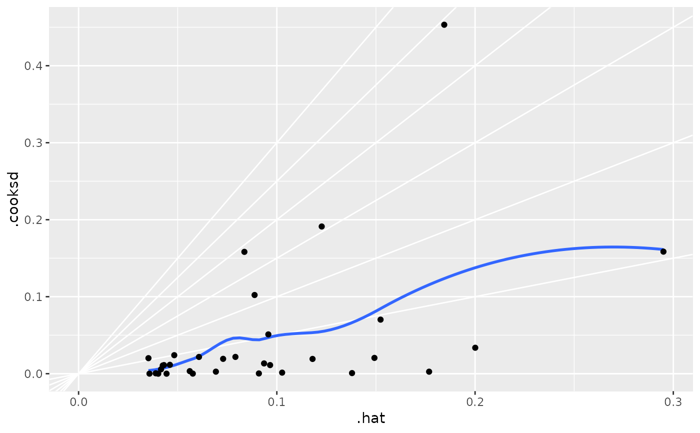#> # A tibble: 3 x 5 #> term estimate std.error statistic p.value #> <chr> <dbl> <dbl> <dbl> <dbl> #> 1 (Intercept) 19.7 5.25 3.76 7.65e- 4 #> 2 wt -5.05 0.484 -10.4 2.52e-11 #> 3 qsec 0.929 0.265 3.51 1.50e- 3#> # A tibble: 1 x 12 #> r.squared adj.r.squared sigma statistic p.value df logLik AIC BIC #> <dbl> <dbl> <dbl> <dbl> <dbl> <dbl> <dbl> <dbl> <dbl> #> 1 0.826 0.814 2.60 69.0 9.39e-12 2 -74.4 157. 163. #> # … with 3 more variables: deviance <dbl>, df.residual <int>, nobs <int># coefficient plot d <- tidy(mod, conf.int = TRUE) ggplot(d, aes(estimate, term, xmin = conf.low, xmax = conf.high, height = 0)) + geom_point() + geom_vline(xintercept = 0, lty = 4) + geom_errorbarh()#> # A tibble: 32 x 10 #> .rownames mpg wt qsec .fitted .resid .std.resid .hat .sigma .cooksd #> <chr> <dbl> <dbl> <dbl> <dbl> <dbl> <dbl> <dbl> <dbl> <dbl> #> 1 Mazda RX4 21 2.62 16.5 21.8 -0.815 -0.325 0.0693 2.64 2.63e-3 #> 2 Mazda RX4… 21 2.88 17.0 21.0 -0.0482 -0.0190 0.0444 2.64 5.59e-6 #> 3 Datsun 710 22.8 2.32 18.6 25.3 -2.53 -1.00 0.0607 2.60 2.17e-2 #> 4 Hornet 4 … 21.4 3.22 19.4 21.6 -0.181 -0.0716 0.0576 2.64 1.05e-4 #> 5 Hornet Sp… 18.7 3.44 17.0 18.2 0.504 0.198 0.0389 2.64 5.29e-4 #> 6 Valiant 18.1 3.46 20.2 21.1 -2.97 -1.20 0.0957 2.58 5.10e-2 #> 7 Duster 360 14.3 3.57 15.8 16.4 -2.14 -0.857 0.0729 2.61 1.93e-2 #> 8 Merc 240D 24.4 3.19 20 22.2 2.17 0.872 0.0791 2.61 2.18e-2 #> 9 Merc 230 22.8 3.15 22.9 25.1 -2.32 -1.07 0.295 2.59 1.59e-1 #> 10 Merc 280 19.2 3.44 18.3 19.4 -0.185 -0.0728 0.0358 2.64 6.55e-5 #> # … with 22 more rows#> # A tibble: 32 x 20 #> .rownames mpg cyl disp hp drat wt qsec vs am gear carb #> <chr> <dbl> <dbl> <dbl> <dbl> <dbl> <dbl> <dbl> <dbl> <dbl> <dbl> <dbl> #> 1 Mazda RX4 21 6 160 110 3.9 2.62 16.5 0 1 4 4 #> 2 Mazda RX… 21 6 160 110 3.9 2.88 17.0 0 1 4 4 #> 3 Datsun 7… 22.8 4 108 93 3.85 2.32 18.6 1 1 4 1 #> 4 Hornet 4… 21.4 6 258 110 3.08 3.22 19.4 1 0 3 1 #> 5 Hornet S… 18.7 8 360 175 3.15 3.44 17.0 0 0 3 2 #> 6 Valiant 18.1 6 225 105 2.76 3.46 20.2 1 0 3 1 #> 7 Duster 3… 14.3 8 360 245 3.21 3.57 15.8 0 0 3 4 #> 8 Merc 240D 24.4 4 147. 62 3.69 3.19 20 1 0 4 2 #> 9 Merc 230 22.8 4 141. 95 3.92 3.15 22.9 1 0 4 2 #> 10 Merc 280 19.2 6 168. 123 3.92 3.44 18.3 1 0 4 4 #> # … with 22 more rows, and 8 more variables: .fitted <dbl>, .lower <dbl>, #> # .upper <dbl>, .resid <dbl>, .std.resid <dbl>, .hat <dbl>, .sigma <dbl>, #> # .cooksd <dbl># predict on new data newdata <- mtcars %>% head(6) %>% mutate(wt = wt + 1) augment(mod, newdata = newdata)#> # A tibble: 6 x 13 #> mpg cyl disp hp drat wt qsec vs am gear carb .fitted #> <dbl> <dbl> <dbl> <dbl> <dbl> <dbl> <dbl> <dbl> <dbl> <dbl> <dbl> <dbl> #> 1 21 6 160 110 3.9 3.62 16.5 0 1 4 4 16.8 #> 2 21 6 160 110 3.9 3.88 17.0 0 1 4 4 16.0 #> 3 22.8 4 108 93 3.85 3.32 18.6 1 1 4 1 20.3 #> 4 21.4 6 258 110 3.08 4.22 19.4 1 0 3 1 16.5 #> 5 18.7 8 360 175 3.15 4.44 17.0 0 0 3 2 13.1 #> 6 18.1 6 225 105 2.76 4.46 20.2 1 0 3 1 16.0 #> # … with 1 more variable: .resid <dbl># ggplot2 example where we also construct 95% prediction interval mod2 <- lm(mpg ~ wt, data = mtcars) ## simpler bivariate model since we're plotting in 2D au <- augment(mod2, newdata = newdata, interval = "prediction") ggplot(au, aes(wt, mpg)) + geom_point() + geom_line(aes(y = .fitted)) + geom_ribbon(aes(ymin = .lower, ymax = .upper), col = NA, alpha = 0.3)# predict on new data without outcome variable. Output does not include .resid newdata <- newdata %>% select(-mpg)#> Error in select(., -mpg): unused argument (-mpg)#> # A tibble: 6 x 13 #> mpg cyl disp hp drat wt qsec vs am gear carb .fitted #> <dbl> <dbl> <dbl> <dbl> <dbl> <dbl> <dbl> <dbl> <dbl> <dbl> <dbl> <dbl> #> 1 21 6 160 110 3.9 3.62 16.5 0 1 4 4 16.8 #> 2 21 6 160 110 3.9 3.88 17.0 0 1 4 4 16.0 #> 3 22.8 4 108 93 3.85 3.32 18.6 1 1 4 1 20.3 #> 4 21.4 6 258 110 3.08 4.22 19.4 1 0 3 1 16.5 #> 5 18.7 8 360 175 3.15 4.44 17.0 0 0 3 2 13.1 #> 6 18.1 6 225 105 2.76 4.46 20.2 1 0 3 1 16.0 #> # … with 1 more variable: .resid <dbl>au <- augment(mod, data = mtcars) ggplot(au, aes(.hat, .std.resid)) + geom_vline(size = 2, colour = "white", xintercept = 0) + geom_hline(size = 2, colour = "white", yintercept = 0) + geom_point() + geom_smooth(se = FALSE)#>ggplot(au, aes(.hat, .cooksd)) + geom_vline(xintercept = 0, colour = NA) + geom_abline(slope = seq(0, 3, by = 0.5), colour = "white") + geom_smooth(se = FALSE) + geom_point()#># column-wise models a <- matrix(rnorm(20), nrow = 10) b <- a + rnorm(length(a)) result <- lm(b ~ a) tidy(result)#> # A tibble: 6 x 6 #> response term estimate std.error statistic p.value #> <chr> <chr> <dbl> <dbl> <dbl> <dbl> #> 1 Y1 (Intercept) 0.120 0.460 0.260 0.802 #> 2 Y1 a1 1.40 0.400 3.51 0.00987 #> 3 Y1 a2 0.00979 0.337 0.0291 0.978 #> 4 Y2 (Intercept) -0.300 0.320 -0.940 0.379 #> 5 Y2 a1 0.160 0.278 0.578 0.582 #> 6 Y2 a2 0.913 0.234 3.90 0.00589