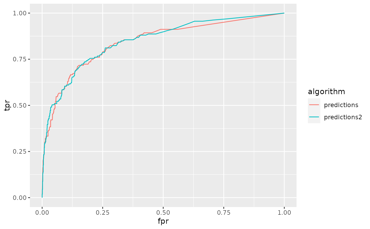 # compare the ROC curves for two prediction algorithms library(dplyr) library(tidyr) rocs <- churn %>% pivot_longer(contains("predictions"), names_to = "algorithm", values_to = "value" ) %>% nest(data = -algorithm) %>% mutate(tidy_roc = purrr::map(data, ~ tidy(roc(.x$value, .x$labels)))) %>% unnest(tidy_roc) ggplot(rocs, aes(fpr, tpr, color = algorithm)) + geom_line()