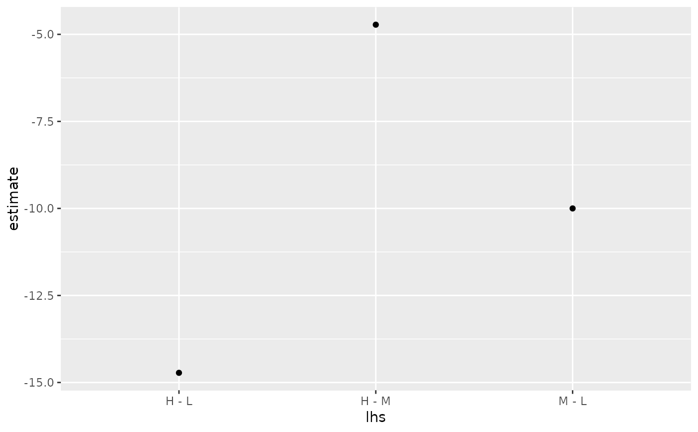 library(multcomp) library(ggplot2) amod <- aov(breaks ~ wool + tension, data = warpbreaks) wht <- glht(amod, linfct = mcp(tension = "Tukey")) tidy(wht)#> # A tibble: 3 x 7 #> term contrast null.value estimate std.error statistic adj.p.value #> <chr> <chr> <dbl> <dbl> <dbl> <dbl> <dbl> #> 1 tension M - L 0 -10. 3.87 -2.58 0.0335 #> 2 tension H - L 0 -14.7 3.87 -3.80 0.00109 #> 3 tension H - M 0 -4.72 3.87 -1.22 0.447#> # A tibble: 3 x 5 #> term contrast estimate conf.low conf.high #> <chr> <chr> <dbl> <dbl> <dbl> #> 1 tension M - L -10. -19.4 -0.644 #> 2 tension H - L -14.7 -24.1 -5.37 #> 3 tension H - M -4.72 -14.1 4.63#> # A tibble: 3 x 7 #> term contrast null.value estimate std.error statistic adj.p.value #> <chr> <chr> <dbl> <dbl> <dbl> <dbl> <dbl> #> 1 tension M - L 0 -10. 3.87 -2.58 0.0337 #> 2 tension H - L 0 -14.7 3.87 -3.80 0.00119 #> 3 tension H - M 0 -4.72 3.87 -1.22 0.447ggplot(mapping = aes(lhs, estimate)) + geom_linerange(aes(ymin = lwr, ymax = upr), data = CI) + geom_point(aes(size = p), data = summary(wht)) + scale_size(trans = "reverse")#> # A tibble: 3 x 2 #> tension letters #> <chr> <chr> #> 1 L b #> 2 M a #> 3 H a