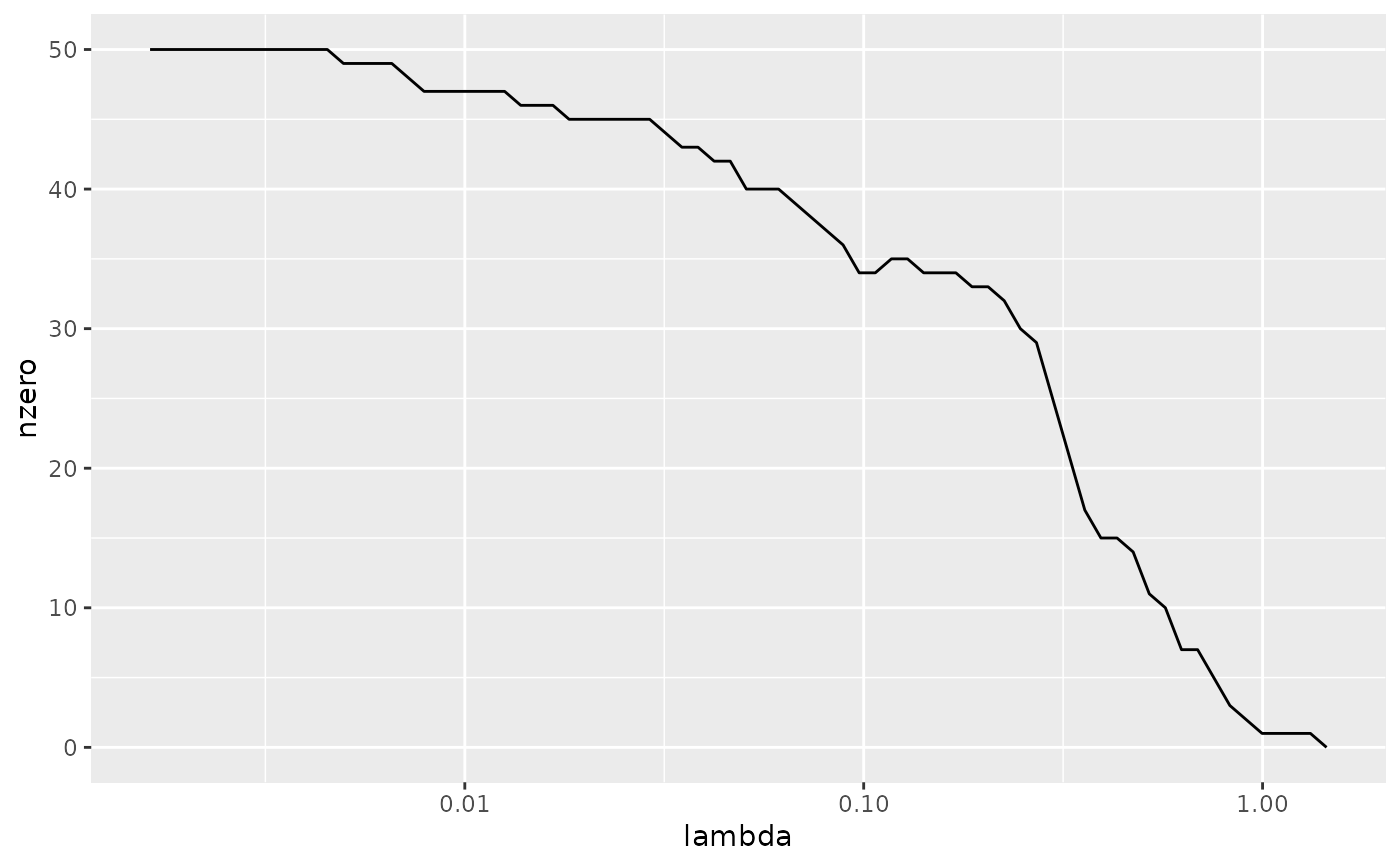 #>set.seed(27) nobs <- 100 nvar <- 50 real <- 5 x <- matrix(rnorm(nobs * nvar), nobs, nvar) beta <- c(rnorm(real, 0, 1), rep(0, nvar - real)) y <- c(t(beta) %*% t(x)) + rnorm(nvar, sd = 3) cvfit1 <- cv.glmnet(x, y) tidy(cvfit1)#> # A tibble: 74 x 6 #> lambda estimate std.error conf.low conf.high nzero #> <dbl> <dbl> <dbl> <dbl> <dbl> <int> #> 1 1.45 17.4 2.28 15.1 19.7 0 #> 2 1.32 17.4 2.28 15.1 19.7 1 #> 3 1.20 17.2 2.22 15.0 19.5 1 #> 4 1.09 17.0 2.15 14.8 19.1 1 #> 5 0.997 16.8 2.09 14.7 18.9 1 #> 6 0.909 16.7 2.03 14.7 18.7 2 #> 7 0.828 16.7 1.99 14.7 18.6 3 #> 8 0.754 16.7 1.95 14.7 18.6 5 #> 9 0.687 16.8 1.93 14.8 18.7 7 #> 10 0.626 16.9 1.91 15.0 18.8 7 #> # … with 64 more rows#> # A tibble: 1 x 3 #> lambda.min lambda.1se nobs #> <dbl> <dbl> <int> #> 1 0.828 1.45 100library(ggplot2) tidied_cv <- tidy(cvfit1) glance_cv <- glance(cvfit1) # plot of MSE as a function of lambda g <- ggplot(tidied_cv, aes(lambda, estimate)) + geom_line() + scale_x_log10() g# plot of MSE as a function of lambda with confidence ribbon g <- g + geom_ribbon(aes(ymin = conf.low, ymax = conf.high), alpha = .25) g# plot of MSE as a function of lambda with confidence ribbon and choices # of minimum lambda marked g <- g + geom_vline(xintercept = glance_cv$lambda.min) + geom_vline(xintercept = glance_cv$lambda.1se, lty = 2) g# plot of number of zeros for each choice of lambda ggplot(tidied_cv, aes(lambda, nzero)) + geom_line() + scale_x_log10()# coefficient plot with min lambda shown tidied <- tidy(cvfit1$glmnet.fit) ggplot(tidied, aes(lambda, estimate, group = term)) + scale_x_log10() + geom_line() + geom_vline(xintercept = glance_cv$lambda.min) + geom_vline(xintercept = glance_cv$lambda.1se, lty = 2)