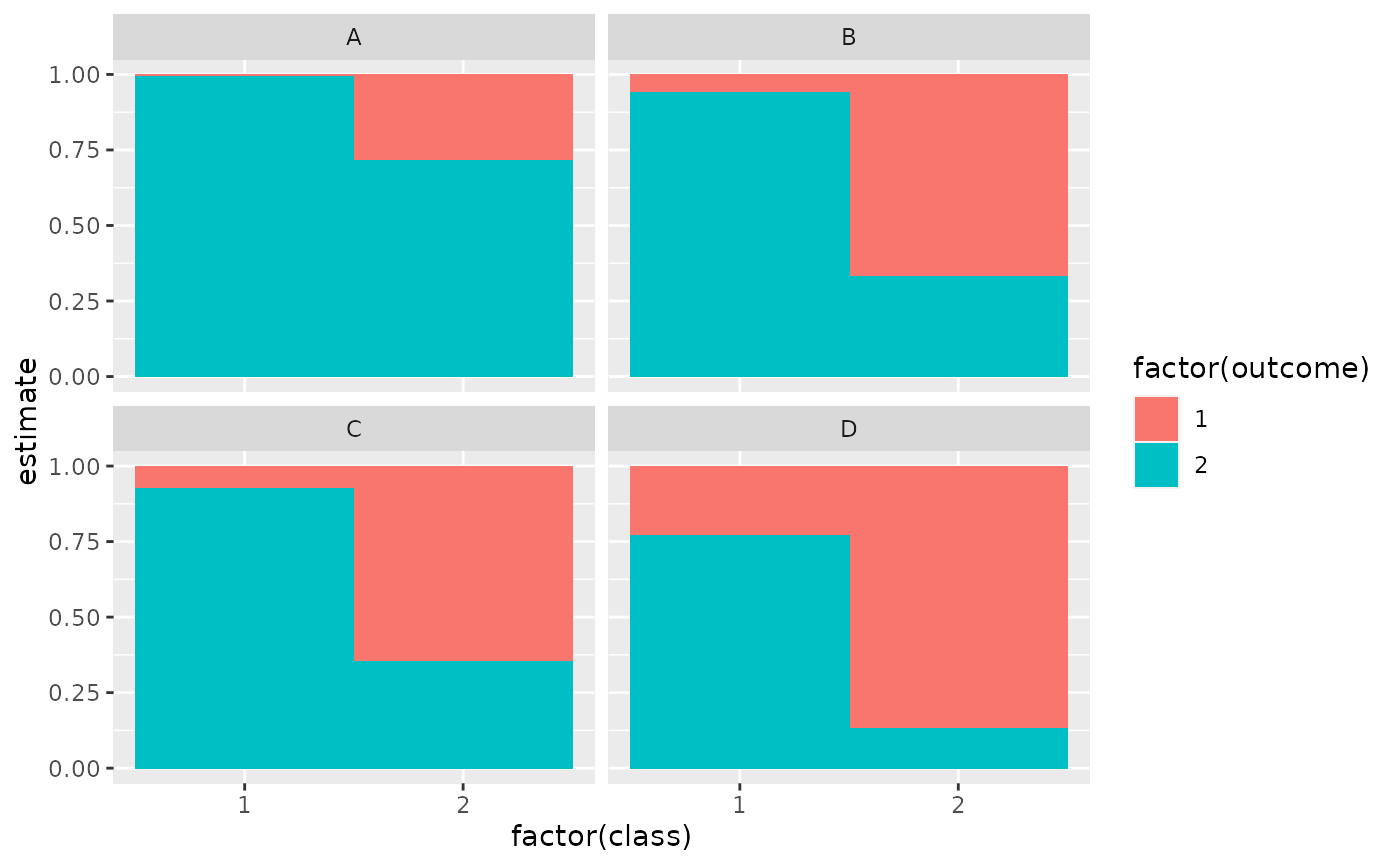 library(poLCA) library(dplyr) data(values) f <- cbind(A, B, C, D) ~ 1 M1 <- poLCA(f, values, nclass = 2, verbose = FALSE) M1#> Conditional item response (column) probabilities, #> by outcome variable, for each class (row) #> #> $A #> Pr(1) Pr(2) #> class 1: 0.0068 0.9932 #> class 2: 0.2864 0.7136 #> #> $B #> Pr(1) Pr(2) #> class 1: 0.0602 0.9398 #> class 2: 0.6704 0.3296 #> #> $C #> Pr(1) Pr(2) #> class 1: 0.0735 0.9265 #> class 2: 0.6460 0.3540 #> #> $D #> Pr(1) Pr(2) #> class 1: 0.2309 0.7691 #> class 2: 0.8676 0.1324 #> #> Estimated class population shares #> 0.2792 0.7208 #> #> Predicted class memberships (by modal posterior prob.) #> 0.3287 0.6713 #> #> ========================================================= #> Fit for 2 latent classes: #> ========================================================= #> number of observations: 216 #> number of estimated parameters: 9 #> residual degrees of freedom: 6 #> maximum log-likelihood: -504.4677 #> #> AIC(2): 1026.935 #> BIC(2): 1057.313 #> G^2(2): 2.719922 (Likelihood ratio/deviance statistic) #> X^2(2): 2.719764 (Chi-square goodness of fit) #>#> # A tibble: 16 x 5 #> variable class outcome estimate std.error #> <chr> <int> <dbl> <dbl> <dbl> #> 1 A 1 1 0.00681 0.0254 #> 2 A 2 1 0.286 0.0393 #> 3 A 1 2 0.993 0.0254 #> 4 A 2 2 0.714 0.0393 #> 5 B 1 1 0.0602 0.0649 #> 6 B 2 1 0.670 0.0489 #> 7 B 1 2 0.940 0.0649 #> 8 B 2 2 0.330 0.0489 #> 9 C 1 1 0.0735 0.0642 #> 10 C 2 1 0.646 0.0482 #> 11 C 1 2 0.927 0.0642 #> 12 C 2 2 0.354 0.0482 #> 13 D 1 1 0.231 0.0929 #> 14 D 2 1 0.868 0.0379 #> 15 D 1 2 0.769 0.0929 #> 16 D 2 2 0.132 0.0379#> # A tibble: 216 x 7 #> A B C D X.Intercept. .class .probability #> <dbl> <dbl> <dbl> <dbl> <dbl> <int> <dbl> #> 1 2 2 2 2 1 1 0.959 #> 2 2 2 2 2 1 1 0.959 #> 3 2 2 2 2 1 1 0.959 #> 4 2 2 2 2 1 1 0.959 #> 5 2 2 2 2 1 1 0.959 #> 6 2 2 2 2 1 1 0.959 #> 7 2 2 2 2 1 1 0.959 #> 8 2 2 2 2 1 1 0.959 #> 9 2 2 2 2 1 1 0.959 #> 10 2 2 2 2 1 1 0.959 #> # … with 206 more rows#> # A tibble: 1 x 8 #> logLik AIC BIC g.squared chi.squared df df.residual nobs #> <dbl> <dbl> <dbl> <dbl> <dbl> <dbl> <dbl> <int> #> 1 -504. 1027. 1057. 2.72 2.72 9 6 216library(ggplot2) ggplot(tidy(M1), aes(factor(class), estimate, fill = factor(outcome))) + geom_bar(stat = "identity", width = 1) + facet_wrap(~variable)## Three-class model with a single covariate. data(election) f2a <- cbind( MORALG, CARESG, KNOWG, LEADG, DISHONG, INTELG, MORALB, CARESB, KNOWB, LEADB, DISHONB, INTELB ) ~ PARTY nes2a <- poLCA(f2a, election, nclass = 3, nrep = 5, verbose = FALSE) td <- tidy(nes2a) td#> # A tibble: 144 x 5 #> variable class outcome estimate std.error #> <chr> <int> <fct> <dbl> <dbl> #> 1 MORALG 1 1 Extremely well 0.137 0.0182 #> 2 MORALG 2 1 Extremely well 0.622 0.0309 #> 3 MORALG 3 1 Extremely well 0.108 0.0175 #> 4 MORALG 1 2 Quite well 0.668 0.0247 #> 5 MORALG 2 2 Quite well 0.335 0.0293 #> 6 MORALG 3 2 Quite well 0.383 0.0274 #> 7 MORALG 1 3 Not too well 0.180 0.0208 #> 8 MORALG 2 3 Not too well 0.0172 0.00841 #> 9 MORALG 3 3 Not too well 0.304 0.0253 #> 10 MORALG 1 4 Not well at all 0.0143 0.00680 #> # … with 134 more rows# show ggplot(td, aes(outcome, estimate, color = factor(class), group = class)) + geom_line() + facet_wrap(~variable, nrow = 2) + theme(axis.text.x = element_text(angle = 90, hjust = 1))#> # A tibble: 1,300 x 16 #> MORALG CARESG KNOWG LEADG DISHONG INTELG MORALB CARESB KNOWB LEADB DISHONB #> <fct> <fct> <fct> <fct> <fct> <fct> <fct> <fct> <fct> <fct> <fct> #> 1 3 Not… 1 Ext… 2 Qu… 2 Qu… 3 Not … 2 Qui… 1 Ext… 1 Ext… 2 Qu… 2 Qu… 4 Not … #> 2 1 Ext… 2 Qui… 2 Qu… 1 Ex… 3 Not … 2 Qui… 2 Qui… 2 Qui… 2 Qu… 3 No… 3 Not … #> 3 2 Qui… 2 Qui… 2 Qu… 2 Qu… 2 Quit… 2 Qui… 2 Qui… 3 Not… 2 Qu… 2 Qu… 3 Not … #> 4 2 Qui… 4 Not… 2 Qu… 3 No… 2 Quit… 2 Qui… 1 Ext… 1 Ext… 2 Qu… 2 Qu… 3 Not … #> 5 2 Qui… 2 Qui… 2 Qu… 2 Qu… 3 Not … 2 Qui… 3 Not… 4 Not… 4 No… 4 No… 3 Not … #> 6 2 Qui… 2 Qui… 2 Qu… 3 No… 4 Not … 2 Qui… 2 Qui… 3 Not… 2 Qu… 2 Qu… 3 Not … #> 7 1 Ext… 1 Ext… 1 Ex… 1 Ex… 4 Not … 1 Ext… 2 Qui… 4 Not… 2 Qu… 3 No… 3 Not … #> 8 2 Qui… 2 Qui… 2 Qu… 2 Qu… 3 Not … 2 Qui… 3 Not… 2 Qui… 2 Qu… 2 Qu… 3 Not … #> 9 2 Qui… 2 Qui… 2 Qu… 2 Qu… 3 Not … 2 Qui… 2 Qui… 2 Qui… 2 Qu… 3 No… 2 Quit… #> 10 2 Qui… 3 Not… 2 Qu… 2 Qu… 3 Not … 2 Qui… 2 Qui… 4 Not… 2 Qu… 4 No… 2 Quit… #> # … with 1,290 more rows, and 5 more variables: INTELB <fct>, #> # X.Intercept. <dbl>, PARTY <dbl>, .class <int>, .probability <dbl>#> # A tibble: 3 x 2 #> .class n #> * <int> <int> #> 1 1 496 #> 2 2 360 #> 3 3 444# if the original data is provided, it leads to NAs in new columns # for rows that weren't predicted au2 <- augment(nes2a, data = election) au2#> # A tibble: 1,785 x 20 #> MORALG CARESG KNOWG LEADG DISHONG INTELG MORALB CARESB KNOWB LEADB DISHONB #> <fct> <fct> <fct> <fct> <fct> <fct> <fct> <fct> <fct> <fct> <fct> #> 1 3 Not… 1 Ext… 2 Qu… 2 Qu… 3 Not … 2 Qui… 1 Ext… 1 Ext… 2 Qu… 2 Qu… 4 Not … #> 2 4 Not… 3 Not… 4 No… 3 No… 2 Quit… 2 Qui… NA NA 2 Qu… 3 No… NA #> 3 1 Ext… 2 Qui… 2 Qu… 1 Ex… 3 Not … 2 Qui… 2 Qui… 2 Qui… 2 Qu… 3 No… 3 Not … #> 4 2 Qui… 2 Qui… 2 Qu… 2 Qu… 2 Quit… 2 Qui… 2 Qui… 3 Not… 2 Qu… 2 Qu… 3 Not … #> 5 2 Qui… 4 Not… 2 Qu… 3 No… 2 Quit… 2 Qui… 1 Ext… 1 Ext… 2 Qu… 2 Qu… 3 Not … #> 6 2 Qui… 3 Not… 3 No… 2 Qu… 2 Quit… 2 Qui… 2 Qui… NA 3 No… 2 Qu… 2 Quit… #> 7 2 Qui… NA 2 Qu… 2 Qu… 4 Not … 2 Qui… NA 3 Not… 2 Qu… 2 Qu… 4 Not … #> 8 2 Qui… 2 Qui… 2 Qu… 2 Qu… 3 Not … 2 Qui… 3 Not… 4 Not… 4 No… 4 No… 3 Not … #> 9 2 Qui… 2 Qui… 2 Qu… 3 No… 4 Not … 2 Qui… 2 Qui… 3 Not… 2 Qu… 2 Qu… 3 Not … #> 10 1 Ext… 1 Ext… 1 Ex… 1 Ex… 4 Not … 1 Ext… 2 Qui… 4 Not… 2 Qu… 3 