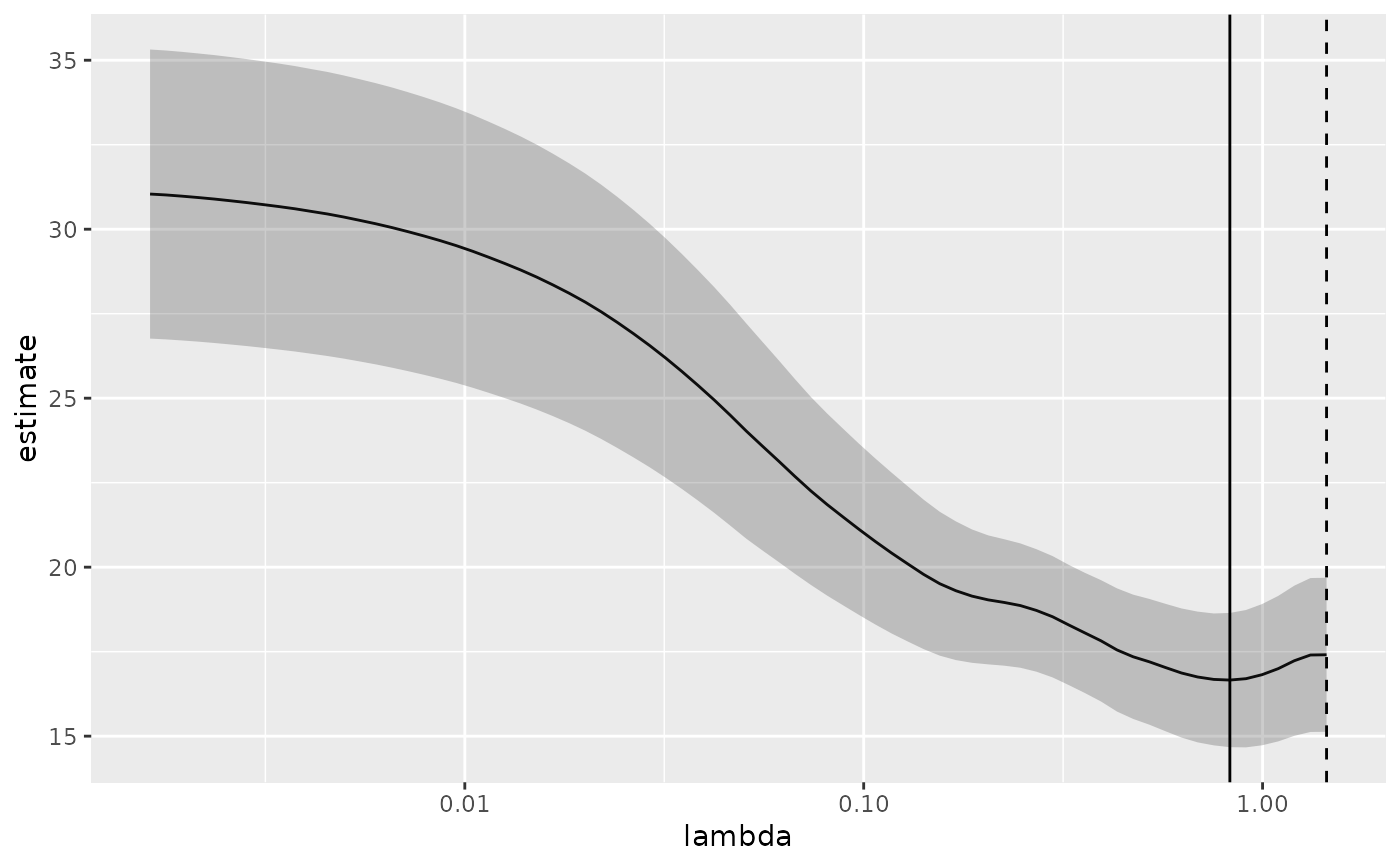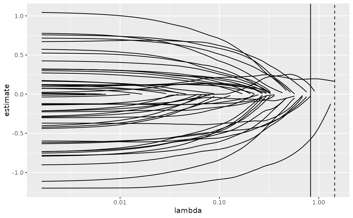 library(glmnet) set.seed(27) nobs <- 100 nvar <- 50 real <- 5 x <- matrix(rnorm(nobs * nvar), nobs, nvar) beta <- c(rnorm(real, 0, 1), rep(0, nvar - real)) y <- c(t(beta) %*% t(x)) + rnorm(nvar, sd = 3) cvfit1 <- cv.glmnet(x, y) tidy(cvfit1)#> # A tibble: 74 x 6 #> lambda estimate std.error conf.low conf.high nzero #> <dbl> <dbl> <dbl> <dbl> <dbl> <int> #> 1 1.45 17.4 2.28 15.1 19.7 0 #> 2 1.32 17.4 2.28 15.1 19.7 1 #> 3 1.20 17.2 2.22 15.0 19.5 1 #> 4 1.09 17.0 2.15 14.8 19.1 1 #> 5 0.997 16.8 2.09 14.7 18.9 1 #> 6 0.909 16.7 2.03 14.7 18.7 2 #> 7 0.828 16.7 1.99 14.7 18.6 3 #> 8 0.754 16.7 1.95 14.7 18.6 5 #> 9 0.687 16.8 1.93 14.8 18.7 7 #> 10 0.626 16.9 1.91 15.0 18.8 7 #> # … with 64 more rows#> # A tibble: 1 x 3 #> lambda.min lambda.1se nobs #> <dbl> <dbl> <int> #> 1 0.828 1.45 100library(ggplot2) tidied_cv <- tidy(cvfit1) glance_cv <- glance(cvfit1) # plot of MSE as a function of lambda g <- ggplot(tidied_cv, aes(lambda, estimate)) + geom_line() + scale_x_log10() g# plot of MSE as a function of lambda with confidence ribbon g <- g + geom_ribbon(aes(ymin = conf.low, ymax = conf.high), alpha = .25) g# plot of MSE as a function of lambda with confidence ribbon and choices # of minimum lambda marked g <- g + geom_vline(xintercept = glance_cv$lambda.min) + geom_vline(xintercept = glance_cv$lambda.1se, lty = 2) g# plot of number of zeros for each choice of lambda ggplot(tidied_cv, aes(lambda, nzero)) + geom_line() + scale_x_log10()# coefficient plot with min lambda shown tidied <- tidy(cvfit1$glmnet.fit) ggplot(tidied, aes(lambda, estimate, group = term)) + scale_x_log10() + geom_line() + geom_vline(xintercept = glance_cv$lambda.min) + geom_vline(xintercept = glance_cv$lambda.1se, lty = 2)