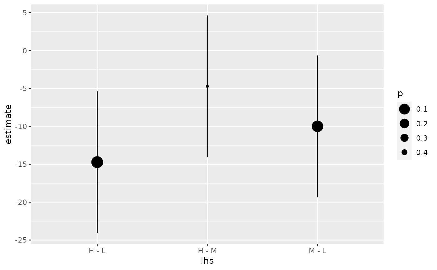 library(multcomp) library(ggplot2) amod <- aov(breaks ~ wool + tension, data = warpbreaks) wht <- glht(amod, linfct = mcp(tension = "Tukey")) tidy(wht)#> # A tibble: 3 x 7 #> term contrast null.value estimate std.error statistic adj.p.value #> <chr> <chr> <dbl> <dbl> <dbl> <dbl> <dbl> #> 1 tension M - L 0 -10. 3.87 -2.58 0.0336 #> 2 tension H - L 0 -14.7 3.87 -3.80 0.00110 #> 3 tension H - M 0 -4.72 3.87 -1.22 0.447#> # A tibble: 3 x 5 #> term contrast estimate conf.low conf.high #> <chr> <chr> <dbl> <dbl> <dbl> #> 1 tension M - L -10. -19.3 -0.651 #> 2 tension H - L -14.7 -24.1 -5.37 #> 3 tension H - M -4.72 -14.1 4.63#> # A tibble: 3 x 7 #> term contrast null.value estimate std.error statistic adj.p.value #> <chr> <chr> <dbl> <dbl> <dbl> <dbl> <dbl> #> 1 tension M - L 0 -10. 3.87 -2.58 0.0336 #> 2 tension H - L 0 -14.7 3.87 -3.80 0.00110 #> 3 tension H - M 0 -4.72 3.87 -1.22 0.447ggplot(mapping = aes(lhs, estimate)) + geom_linerange(aes(ymin = lwr, ymax = upr), data = CI) + geom_point(aes(size = p), data = summary(wht)) + scale_size(trans = "reverse")#> # A tibble: 3 x 2 #> tension letters #> <chr> <chr> #> 1 L b #> 2 M a #> 3 H a