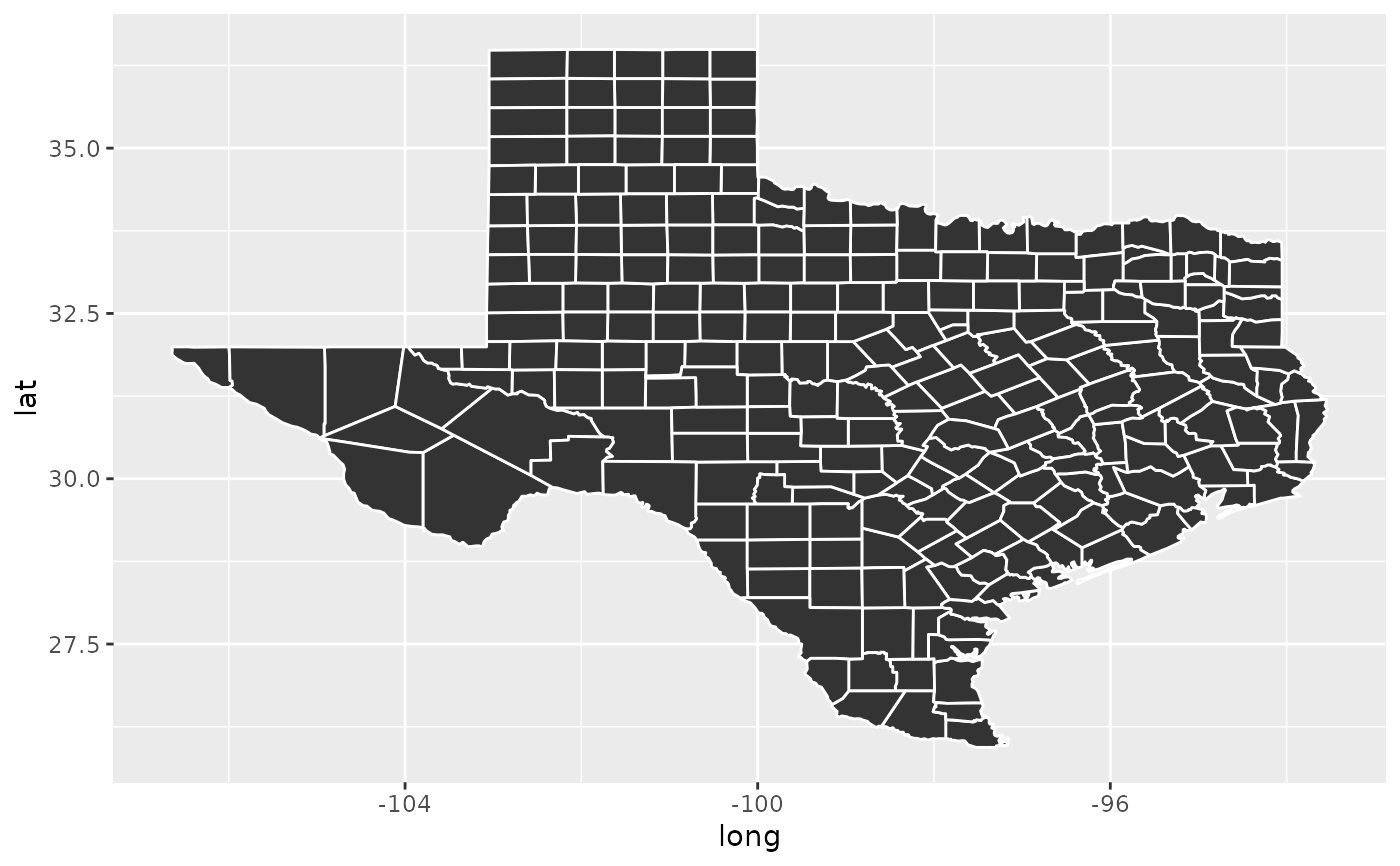 #> #>#> #> #>#> # A tibble: 2,977 x 7 #> term long lat group order region subregion #> <chr> <dbl> <dbl> <dbl> <int> <chr> <chr> #> 1 1 -121. 37.5 1 1 california alameda #> 2 2 -122. 37.5 1 2 california alameda #> 3 3 -122. 37.5 1 3 california alameda #> 4 4 -122. 37.5 1 4 california alameda #> 5 5 -122. 37.5 1 5 california alameda #> 6 6 -122. 37.5 1 6 california alameda #> 7 7 -122. 37.5 1 7 california alameda #> 8 8 -122. 37.5 1 8 california alameda #> 9 9 -122. 37.5 1 9 california alameda #> 10 10 -122. 37.5 1 10 california alameda #> # … with 2,967 more rows#> # A tibble: 4,488 x 7 #> term long lat group order region subregion #> <chr> <dbl> <dbl> <dbl> <int> <chr> <chr> #> 1 1 -95.8 31.5 1 1 texas anderson #> 2 2 -95.8 31.6 1 2 texas anderson #> 3 3 -95.8 31.6 1 3 texas anderson #> 4 4 -95.7 31.6 1 4 texas anderson #> 5 5 -95.7 31.6 1 5 texas anderson #> 6 6 -95.7 31.6 1 6 texas anderson #> 7 7 -95.8 31.7 1 7 texas anderson #> 8 8 -95.8 31.7 1 8 texas anderson #> 9 9 -95.8 31.6 1 9 texas anderson #> 10 10 -95.8 31.6 1 10 texas anderson #> # … with 4,478 more rows