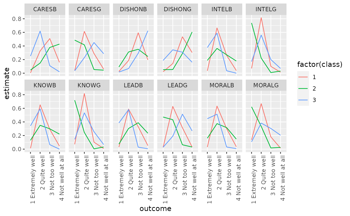 library(poLCA) library(dplyr) data(values) f <- cbind(A, B, C, D) ~ 1 M1 <- poLCA(f, values, nclass = 2, verbose = FALSE) M1#> Conditional item response (column) probabilities, #> by outcome variable, for each class (row) #> #> $A #> Pr(1) Pr(2) #> class 1: 0.0068 0.9932 #> class 2: 0.2864 0.7136 #> #> $B #> Pr(1) Pr(2) #> class 1: 0.0602 0.9398 #> class 2: 0.6704 0.3296 #> #> $C #> Pr(1) Pr(2) #> class 1: 0.0735 0.9265 #> class 2: 0.6460 0.3540 #> #> $D #> Pr(1) Pr(2) #> class 1: 0.2309 0.7691 #> class 2: 0.8676 0.1324 #> #> Estimated class population shares #> 0.2792 0.7208 #> #> Predicted class memberships (by modal posterior prob.) #> 0.3287 0.6713 #> #> ========================================================= #> Fit for 2 latent classes: #> ========================================================= #> number of observations: 216 #> number of estimated parameters: 9 #> residual degrees of freedom: 6 #> maximum log-likelihood: -504.4677 #> #> AIC(2): 1026.935 #> BIC(2): 1057.313 #> G^2(2): 2.719922 (Likelihood ratio/deviance statistic) #> X^2(2): 2.719764 (Chi-square goodness of fit) #>#> # A tibble: 16 x 5 #> variable class outcome estimate std.error #> <chr> <int> <dbl> <dbl> <dbl> #> 1 A 1 1 0.00681 0.0254 #> 2 A 2 1 0.286 0.0393 #> 3 A 1 2 0.993 0.0254 #> 4 A 2 2 0.714 0.0393 #> 5 B 1 1 0.0602 0.0649 #> 6 B 2 1 0.670 0.0489 #> 7 B 1 2 0.940 0.0649 #> 8 B 2 2 0.330 0.0489 #> 9 C 1 1 0.0735 0.0642 #> 10 C 2 1 0.646 0.0482 #> 11 C 1 2 0.927 0.0642 #> 12 C 2 2 0.354 0.0482 #> 13 D 1 1 0.231 0.0929 #> 14 D 2 1 0.868 0.0379 #> 15 D 1 2 0.769 0.0929 #> 16 D 2 2 0.132 0.0379#> # A tibble: 216 x 7 #> A B C D X.Intercept. .class .probability #> <dbl> <dbl> <dbl> <dbl> <dbl> <int> <dbl> #> 1 2 2 2 2 1 1 0.959 #> 2 2 2 2 2 1 1 0.959 #> 3 2 2 2 2 1 1 0.959 #> 4 2 2 2 2 1 1 0.959 #> 5 2 2 2 2 1 1 0.959 #> 6 2 2 2 2 1 1 0.959 #> 7 2 2 2 2 1 1 0.959 #> 8 2 2 2 2 1 1 0.959 #> 9 2 2 2 2 1 1 0.959 #> 10 2 2 2 2 1 1 0.959 #> # … with 206 more rows#> # A tibble: 1 x 8 #> logLik AIC BIC g.squared chi.squared df df.residual nobs #> <dbl> <dbl> <dbl> <dbl> <dbl> <dbl> <dbl> <int> #> 1 -504. 1027. 1057. 2.72 2.72 9 6 216library(ggplot2) ggplot(tidy(M1), aes(factor(class), estimate, fill = factor(outcome))) + geom_bar(stat = "identity", width = 1) + facet_wrap(~variable)## Three-class model with a single covariate. data(election) f2a <- cbind( MORALG, CARESG, KNOWG, LEADG, DISHONG, INTELG, MORALB, CARESB, KNOWB, LEADB, DISHONB, INTELB ) ~ PARTY nes2a <- poLCA(f2a, election, nclass = 3, nrep = 5, verbose = FALSE) td <- tidy(nes2a) td#> # A tibble: 144 x 5 #> variable class outcome estimate std.error #> <chr> <int> <fct> <dbl> <dbl> #> 1 MORALG 1 1 Extremely well 0.137 0.0182 #> 2 MORALG 2 1 Extremely well 0.622 0.0309 #> 3 MORALG 3 1 Extremely well 0.108 0.0175 #> 4 MORALG 1 2 Quite well 0.668 0.0247 #> 5 MORALG 2 2 Quite well 0.335 0.0293 #> 6 MORALG 3 2 Quite well 0.383 0.0274 #> 7 MORALG 1 3 Not too well 0.180 0.0208 #> 8 MORALG 2 3 Not too well 0.0172 0.00841 #> 9 MORALG 3 3 Not too well 0.304 0.0253 #> 10 MORALG 1 4 Not well at all 0.0143 0.00680 #> # … with 134 more rows# show ggplot(td, aes(outcome, estimate, color = factor(class), group = class)) + geom_line() + facet_wrap(~variable, nrow = 2) + theme(axis.text.x = element_text(angle = 90, hjust = 1))#> # A tibble: 1,300 x 16 #> MORALG CARESG KNOWG LEADG DISHONG INTELG MORALB CARESB KNOWB LEADB DISHONB #> <fct> <fct> <fct> <fct> <fct> <fct> <fct> <fct> <fct> <fct> <fct> #> 1 3 Not … 1 Extr… 2 Qui… 2 Qu… 3 Not … 2 Qui… 1 Ext… 1 Ext… 2 Qu… 2 Qu… 4 Not … #> 2 1 Extr… 2 Quit… 2 Qui… 1 Ex… 3 Not … 2 Qui… 2 Qui… 2 Qui… 2 Qu… 3 No… 3 Not … #> 3 2 Quit… 2 Quit… 2 Qui… 2 Qu… 2 Quit… 2 Qui… 2 Qui… 3 Not… 2 Qu… 2 Qu… 3 Not … #> 4 2 Quit… 4 Not … 2 Qui… 3 No… 2 Quit… 2 Qui… 1 Ext… 1 Ext… 2 Qu… 2 Qu… 3 Not … #> 5 2 Quit… 2 Quit… 2 Qui… 2 Qu… 3 Not … 2 Qui… 3 Not… 4 Not… 4 No… 4 No… 3 Not … #> 6 2 Quit… 2 Quit… 2 Qui… 3 No… 4 Not … 2 Qui… 2 Qui… 3 Not… 2 Qu… 2 Qu… 3 Not … #> 7 1 Extr… 1 Extr… 1 Ext… 1 Ex… 4 Not … 1 Ext… 2 Qui… 4 Not… 2 Qu… 3 No… 3 Not … #> 8 2 Quit… 2 Quit… 2 Qui… 2 Qu… 3 Not … 2 Qui… 3 Not… 2 Qui… 2 Qu… 2 Qu… 3 Not … #> 9 2 Quit… 2 Quit… 2 Qui… 2 Qu… 3 Not … 2 Qui… 2 Qui… 2 Qui… 2 Qu… 3 No… 2 Quit… #> 10 2 Quit… 3 Not … 2 Qui… 2 Qu… 3 Not … 2 Qui… 2 Qui… 4 Not… 2 Qu… 4 No… 2 Quit… #> # … with 1,290 more rows, and 5 more variables: INTELB <fct>, #> # X.Intercept. <dbl>, PARTY <dbl>, .class <int>, .probability <dbl>#> # A tibble: 3 x 2 #> .class n #> <int> <int> #> 1 1 496 #> 2 2 360 #> 3 3 444# if the original data is provided, it leads to NAs in new columns # for rows that weren't predicted au2 <- augment(nes2a, data = election) au2#> # A tibble: 1,785 x 20 #> MORALG CARESG KNOWG LEADG DISHONG INTELG MORALB CARESB KNOWB LEADB DISHONB #> <fct> <fct> <fct> <fct> <fct> <fct> <fct> <fct> <fct> <fct> <fct> #> 1 3 Not … 1 Extr… 2 Qui… 2 Qu… 3 Not … 2 Qui… 1 Ext… 1 Ext… 2 Qu… 2 Qu… 4 Not … #> 2 4 Not … 3 Not … 4 Not… 3 No… 2 Quit… 2 Qui… NA NA 2 Qu… 3 No… NA #> 3 1 Extr… 2 Quit… 2 Qui… 1 Ex… 3 Not … 2 Qui… 2 Qui… 2 Qui… 2 Qu… 3 No… 3 Not … #> 4 2 Quit… 2 Quit… 2 Qui… 2 Qu… 2 Quit… 2 Qui… 2 Qui… 3 Not… 2 Qu… 2 Qu… 3 Not … #> 5 2 Quit… 4 Not … 2 Qui… 3 No… 2 Quit… 2 Qui… 1 Ext… 1 Ext… 2 Qu… 2 Qu… 3 Not … #> 6 2 Quit… 3 Not … 3 Not… 2 Qu… 2 Quit… 2 Qui… 2 Qui… NA 3 No… 2 Qu… 2 Quit… #> 7 2 Quit… NA 2 Qui… 2 Qu… 4 Not … 2 Qui… NA 3 Not… 2 Qu… 2 Qu… 4 Not … #> 8 2 Quit… 2 Quit… 2 Qui… 2 Qu… 3 Not … 2 Qui… 3 Not… 4 Not… 4 No… 4 No… 3 Not … #> 9 2 Quit… 2 Quit… 2 Qui… 3 No… 4 Not … 2 Qui… 2 Qui… 3 Not… 2 Qu… 2 Qu… 3 Not … #> 10 1 Extr… 1 Extr… 1 Ext