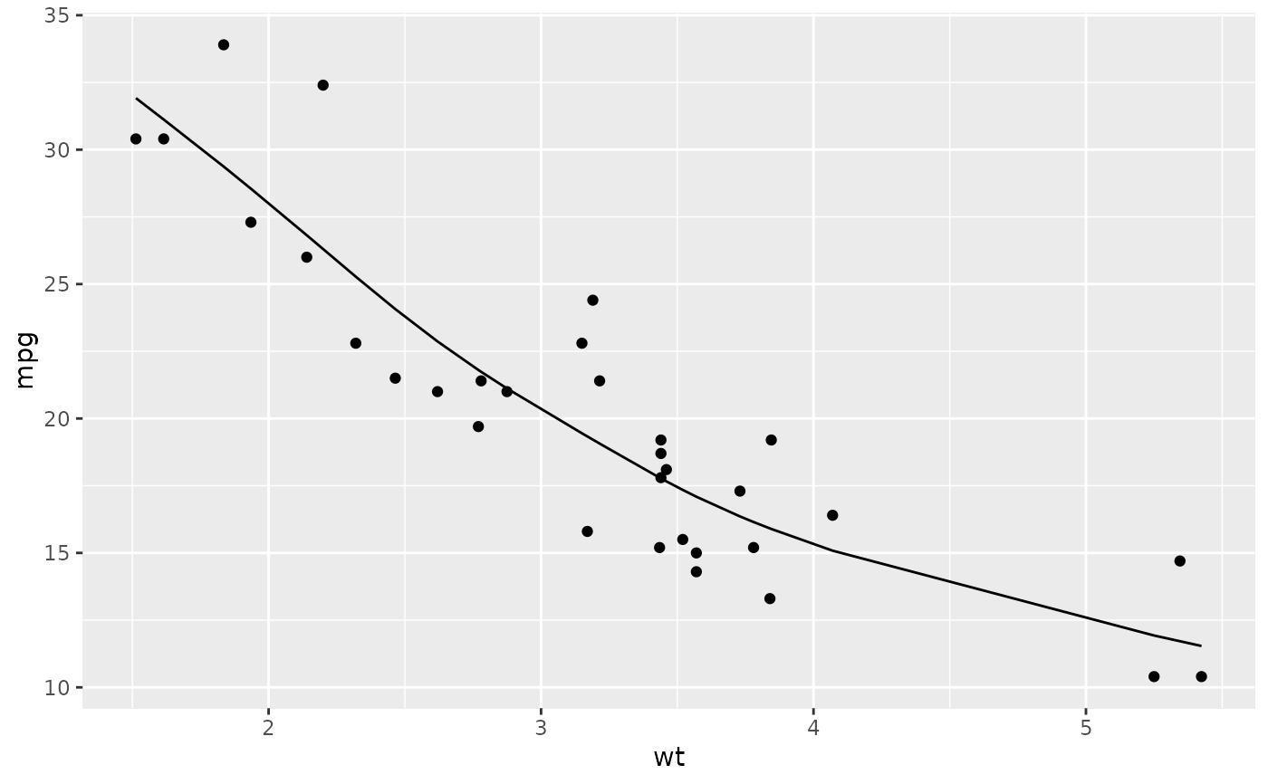 library(ggplot2) ggplot(augment(spl, mtcars), aes(wt, mpg)) + geom_point() + geom_line(aes(y = .fitted))