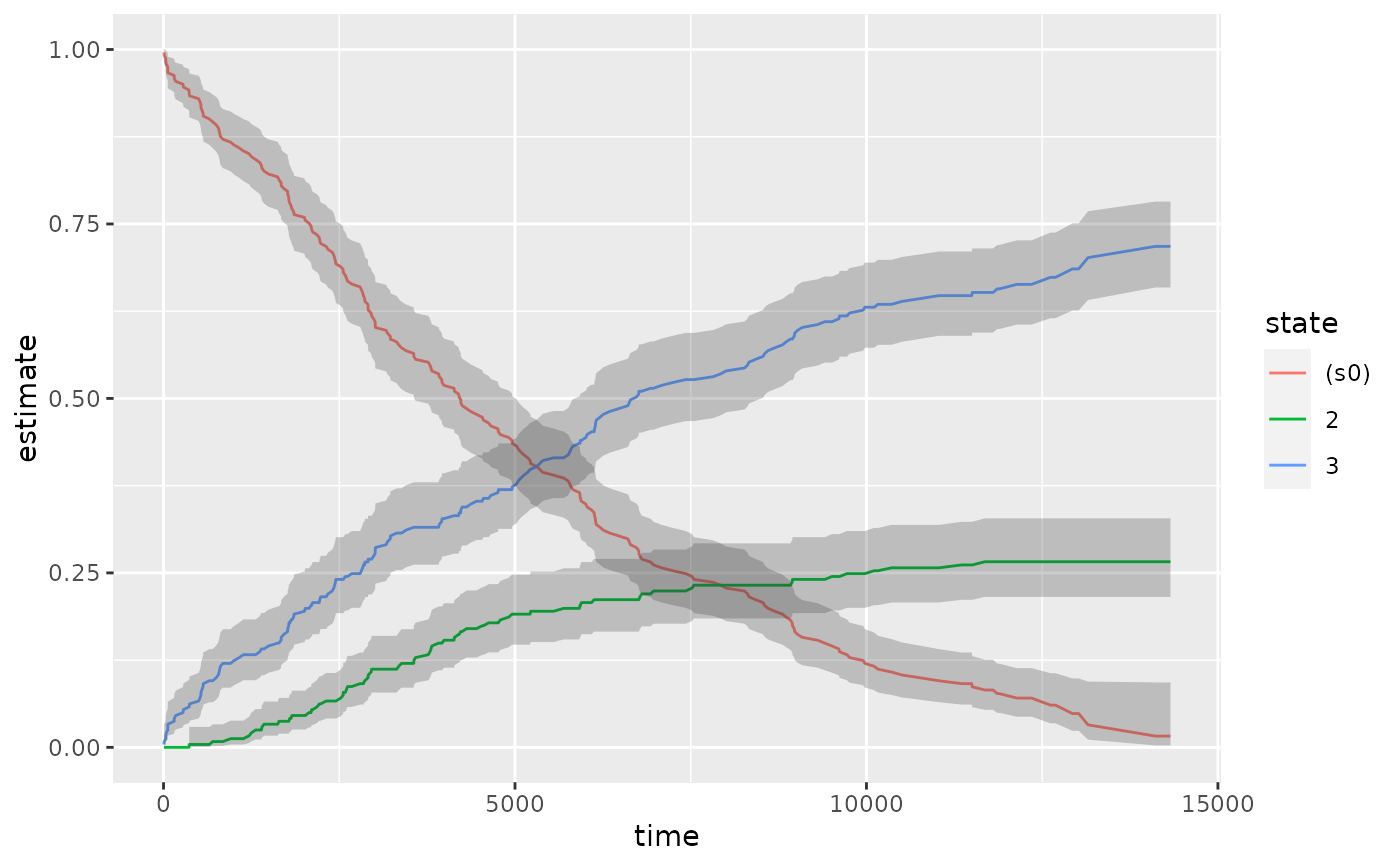 library(survival) cfit <- coxph(Surv(time, status) ~ age + sex, lung) sfit <- survfit(cfit) tidy(sfit)#> # A tibble: 186 x 8 #> time n.risk n.event n.censor estimate std.error conf.high conf.low #> <dbl> <dbl> <dbl> <dbl> <dbl> <dbl> <dbl> <dbl> #> 1 5 228 1 0 0.996 0.00419 1 0.988 #> 2 11 227 3 0 0.983 0.00845 1.00 0.967 #> 3 12 224 1 0 0.979 0.00947 0.997 0.961 #> 4 13 223 2 0 0.971 0.0113 0.992 0.949 #> 5 15 221 1 0 0.966 0.0121 0.990 0.944 #> 6 26 220 1 0 0.962 0.0129 0.987 0.938 #> 7 30 219 1 0 0.958 0.0136 0.984 0.933 #> 8 31 218 1 0 0.954 0.0143 0.981 0.927 #> 9 53 217 2 0 0.945 0.0157 0.975 0.917 #> 10 54 215 1 0 0.941 0.0163 0.972 0.911 #> # … with 176 more rows#> # A tibble: 1 x 10 #> records n.max n.start events rmean rmean.std.error median conf.low conf.high #> <dbl> <dbl> <dbl> <dbl> <dbl> <dbl> <dbl> <dbl> <dbl> #> 1 228 228 228 165 381. 20.3 320 285 363 #> # … with 1 more variable: nobs <int>library(ggplot2) ggplot(tidy(sfit), aes(time, estimate)) + geom_line() + geom_ribbon(aes(ymin = conf.low, ymax = conf.high), alpha = .25)# multi-state fitCI <- survfit(Surv(stop, status * as.numeric(event), type = "mstate") ~ 1, data = mgus1, subset = (start == 0) ) td_multi <- tidy(fitCI) td_multi#> # A tibble: 711 x 9 #> time n.risk n.event n.censor estimate std.error conf.high conf.low state #> <dbl> <int> <int> <int> <dbl> <dbl> <dbl> <dbl> <fct> #> 1 6 241 0 0 0.996 0.00414 1 0.988 (s0) #> 2 7 240 0 0 0.992 0.00584 1 0.980 (s0) #> 3 31 239 0 0 0.988 0.00714 1 0.974 (s0) #> 4 32 238 0 0 0.983 0.00823 1.00 0.967 (s0) #> 5 39 237 0 0 0.979 0.00918 0.997 0.961 (s0) #> 6 60 236 0 0 0.975 0.0100 0.995 0.956 (s0) #> 7 61 235 0 0 0.967 0.0115 0.990 0.944 (s0) #> 8 152 233 0 0 0.963 0.0122 0.987 0.939 (s0) #> 9 153 232 0 0 0.959 0.0128 0.984 0.934 (s0) #> 10 174 231 0 0 0.954 0.0134 0.981 0.928 (s0) #> # … with 701 more rowsggplot(td_multi, aes(time, estimate, group = state)) + geom_line(aes(color = state)) + geom_ribbon(aes(ymin = conf.low, ymax = conf.high), alpha = .25)