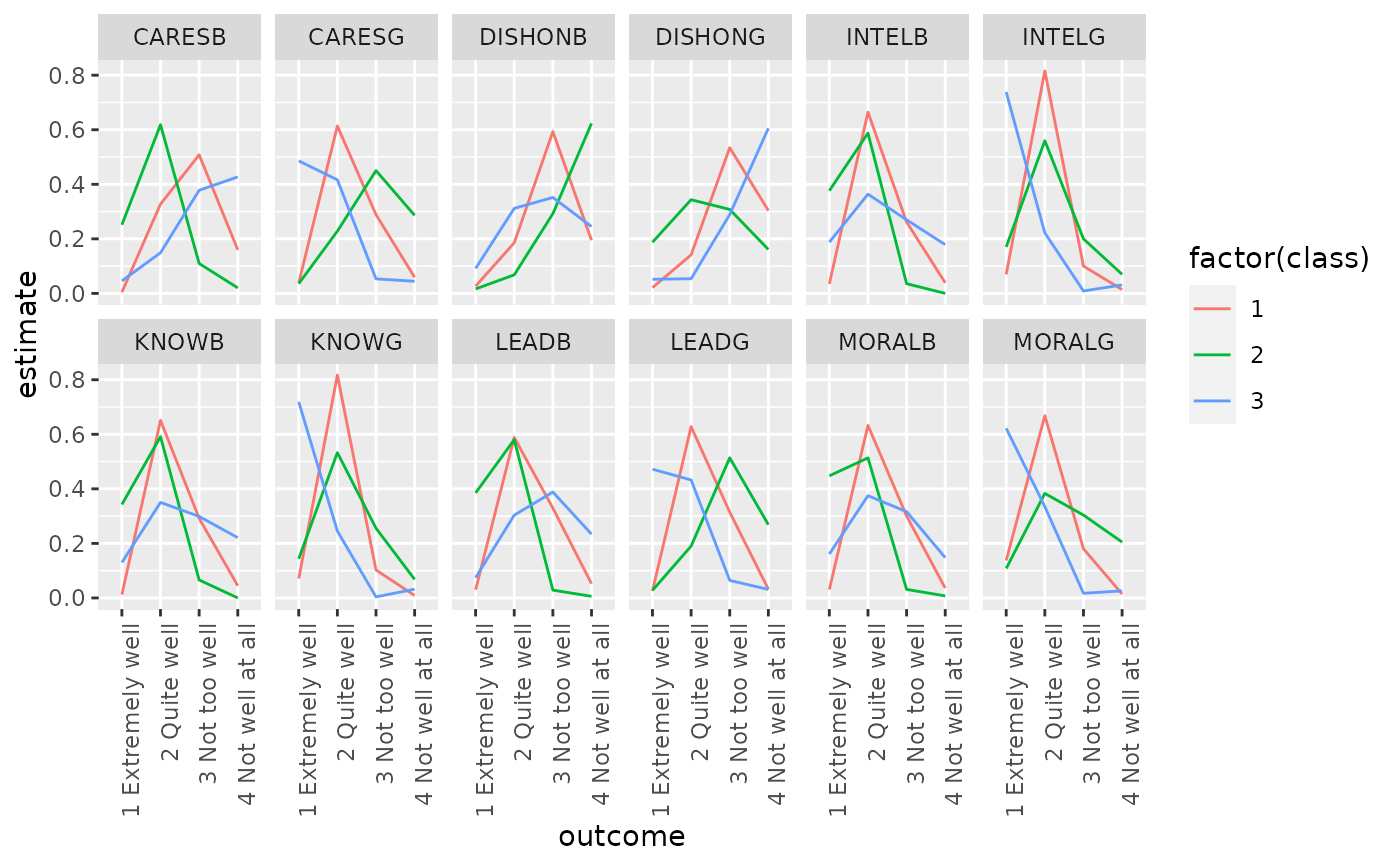 #>library(dplyr) data(values) f <- cbind(A, B, C, D) ~ 1 M1 <- poLCA(f, values, nclass = 2, verbose = FALSE) M1#> Conditional item response (column) probabilities, #> by outcome variable, for each class (row) #> #> $A #> Pr(1) Pr(2) #> class 1: 0.2864 0.7136 #> class 2: 0.0068 0.9932 #> #> $B #> Pr(1) Pr(2) #> class 1: 0.6704 0.3296 #> class 2: 0.0602 0.9398 #> #> $C #> Pr(1) Pr(2) #> class 1: 0.6460 0.3540 #> class 2: 0.0735 0.9265 #> #> $D #> Pr(1) Pr(2) #> class 1: 0.8676 0.1324 #> class 2: 0.2309 0.7691 #> #> Estimated class population shares #> 0.7208 0.2792 #> #> Predicted class memberships (by modal posterior prob.) #> 0.6713 0.3287 #> #> ========================================================= #> Fit for 2 latent classes: #> ========================================================= #> number of observations: 216 #> number of estimated parameters: 9 #> residual degrees of freedom: 6 #> maximum log-likelihood: -504.4677 #> #> AIC(2): 1026.935 #> BIC(2): 1057.313 #> G^2(2): 2.719922 (Likelihood ratio/deviance statistic) #> X^2(2): 2.719764 (Chi-square goodness of fit) #>#> # A tibble: 16 x 5 #> variable class outcome estimate std.error #> <chr> <int> <dbl> <dbl> <dbl> #> 1 A 1 1 0.286 0.0393 #> 2 A 2 1 0.00681 0.0254 #> 3 A 1 2 0.714 0.0393 #> 4 A 2 2 0.993 0.0254 #> 5 B 1 1 0.670 0.0489 #> 6 B 2 1 0.0602 0.0649 #> 7 B 1 2 0.330 0.0489 #> 8 B 2 2 0.940 0.0649 #> 9 C 1 1 0.646 0.0482 #> 10 C 2 1 0.0735 0.0642 #> 11 C 1 2 0.354 0.0482 #> 12 C 2 2 0.927 0.0642 #> 13 D 1 1 0.868 0.0379 #> 14 D 2 1 0.231 0.0929 #> 15 D 1 2 0.132 0.0379 #> 16 D 2 2 0.769 0.0929#> # A tibble: 216 x 7 #> A B C D X.Intercept. .class .probability #> <dbl> <dbl> <dbl> <dbl> <dbl> <int> <dbl> #> 1 2 2 2 2 1 2 0.959 #> 2 2 2 2 2 1 2 0.959 #> 3 2 2 2 2 1 2 0.959 #> 4 2 2 2 2 1 2 0.959 #> 5 2 2 2 2 1 2 0.959 #> 6 2 2 2 2 1 2 0.959 #> 7 2 2 2 2 1 2 0.959 #> 8 2 2 2 2 1 2 0.959 #> 9 2 2 2 2 1 2 0.959 #> 10 2 2 2 2 1 2 0.959 #> # … with 206 more rows#> # A tibble: 1 x 8 #> logLik AIC BIC g.squared chi.squared df df.residual nobs #> <dbl> <dbl> <dbl> <dbl> <dbl> <dbl> <dbl> <int> #> 1 -504. 1027. 1057. 2.72 2.72 9 6 216library(ggplot2) ggplot(tidy(M1), aes(factor(class), estimate, fill = factor(outcome))) + geom_bar(stat = "identity", width = 1) + facet_wrap(~variable)## Three-class model with a single covariate. data(election) f2a <- cbind( MORALG, CARESG, KNOWG, LEADG, DISHONG, INTELG, MORALB, CARESB, KNOWB, LEADB, DISHONB, INTELB ) ~ PARTY nes2a <- poLCA(f2a, election, nclass = 3, nrep = 5, verbose = FALSE) td <- tidy(nes2a) td#> # A tibble: 144 x 5 #> variable class outcome estimate std.error #> <chr> <int> <fct> <dbl> <dbl> #> 1 MORALG 1 1 Extremely well 0.137 0.0182 #> 2 MORALG 2 1 Extremely well 0.108 0.0175 #> 3 MORALG 3 1 Extremely well 0.622 0.0309 #> 4 MORALG 1 2 Quite well 0.668 0.0247 #> 5 MORALG 2 2 Quite well 0.383 0.0274 #> 6 MORALG 3 2 Quite well 0.335 0.0293 #> 7 MORALG 1 3 Not too well 0.180 0.0208 #> 8 MORALG 2 3 Not too well 0.304 0.0253 #> 9 MORALG 3 3 Not too well 0.0172 0.00841 #> 10 MORALG 1 4 Not well at all 0.0143 0.00680 #> # … with 134 more rows# show ggplot(td, aes(outcome, estimate, color = factor(class), group = class)) + geom_line() + facet_wrap(~variable, nrow = 2) + theme(axis.text.x = element_text(angle = 90, hjust = 1))#> # A tibble: 1,300 x 16 #> MORALG CARESG KNOWG LEADG DISHONG INTELG MORALB CARESB KNOWB LEADB DISHONB #> <fct> <fct> <fct> <fct> <fct> <fct> <fct> <fct> <fct> <fct> <fct> #> 1 3 Not … 1 Extr… 2 Qui… 2 Qu… 3 Not … 2 Qui… 1 Ext… 1 Ext… 2 Qu… 2 Qu… 4 Not … #> 2 1 Extr… 2 Quit… 2 Qui… 1 Ex… 3 Not … 2 Qui… 2 Qui… 2 Qui… 2 Qu… 3 No… 3 Not … #> 3 2 Quit… 2 Quit… 2 Qui… 2 Qu… 2 Quit… 2 Qui… 2 Qui… 3 Not… 2 Qu… 2 Qu… 3 Not … #> 4 2 Quit… 4 Not … 2 Qui… 3 No… 2 Quit… 2 Qui… 1 Ext… 1 Ext… 2 Qu… 2 Qu… 3 Not … #> 5 2 Quit… 2 Quit… 2 Qui… 2 Qu… 3 Not … 2 Qui… 3 Not… 4 Not… 4 No… 4 No… 3 Not … #> 6 2 Quit… 2 Quit… 2 Qui… 3 No… 4 Not … 2 Qui… 2 Qui… 3 Not… 2 Qu… 2 Qu… 3 Not … #> 7 1 Extr… 1 Extr… 1 Ext… 1 Ex… 4 Not … 1 Ext… 2 Qui… 4 Not… 2 Qu… 3 No… 3 Not … #> 8 2 Quit… 2 Quit… 2 Qui… 2 Qu… 3 Not … 2 Qui… 3 Not… 2 Qui… 2 Qu… 2 Qu… 3 Not … #> 9 2 Quit… 2 Quit… 2 Qui… 2 Qu… 3 Not … 2 Qui… 2 Qui… 2 Qui… 2 Qu… 3 No… 2 Quit… #> 10 2 Quit… 3 Not … 2 Qui… 2 Qu… 3 Not … 2 Qui… 2 Qui… 4 Not… 2 Qu… 4 No… 2 Quit… #> # … with 1,290 more rows, and 5 more variables: INTELB <fct>, #> # X.Intercept. <dbl>, PARTY <dbl>, .class <int>, .probability <dbl>#> # A tibble: 3 x 2 #> .class n #> <int> <int> #> 1 1 496 #> 2 2 444 #> 3 3 360# if the original data is provided, it leads to NAs in new columns # for rows that weren't predicted au2 <- augment(nes2a, data = election) au2#> # A tibble: 1,785 x 20 #> MORALG CARESG KNOWG LEADG DISHONG INTELG MORALB CARESB KNOWB LEADB DISHONB #> <fct> <fct> <fct> <fct> <fct> <fct> <fct> <fct> <fct> <fct> <fct> #> 1 3 Not … 1 Extr… 2 Qui… 2 Qu… 3 Not … 2 Qui… 1 Ext… 1 Ext… 2 Qu… 2 Qu… 4 Not … #> 2 4 Not … 3 Not … 4 Not… 3 No… 2 Quit… 2 Qui… NA NA 2 Qu… 3 No… NA #> 3 1 Extr… 2 Quit… 2 Qui… 1 Ex… 3 Not … 2 Qui… 2 Qui… 2 Qui… 2 Qu… 3 No… 3 Not … #> 4 2 Quit… 2 Quit… 2 Qui… 2 Qu… 2 Quit… 2 Qui… 2 Qui… 3 Not… 2 Qu… 2 Qu… 3 Not … #> 5 2 Quit… 4 Not … 2 Qui… 3 No… 2 Quit… 2 Qui… 1 Ext… 1 Ext… 2 Qu… 2 Qu… 3 Not … #> 6 2 Quit… 3 Not … 3 Not… 2 Qu… 2 Quit… 2 Qui… 2 Qui… NA 3 No… 2 Qu… 2 Quit… #> 7 2 Quit… NA 2 Qui… 2 Qu… 4 Not … 2 Qui… NA 3 Not… 2 Qu… 2 Qu… 4 Not … #> 8 2 Quit… 2 Quit… 2 Qui… 2 Qu… 3 Not … 2 Qui… 3 Not… 4 Not… 4 No… 4 No… 3 Not … #> 9 2 Quit… 2 Quit… 2 Qui… 3 No… 4 Not … 2 Qui… 2 Qui… 3 Not… 2 Qu… 2 Qu… 3 Not … #> 10 1 Extr… 1 Extr… 1 Ext… 1 Ex… 4 N