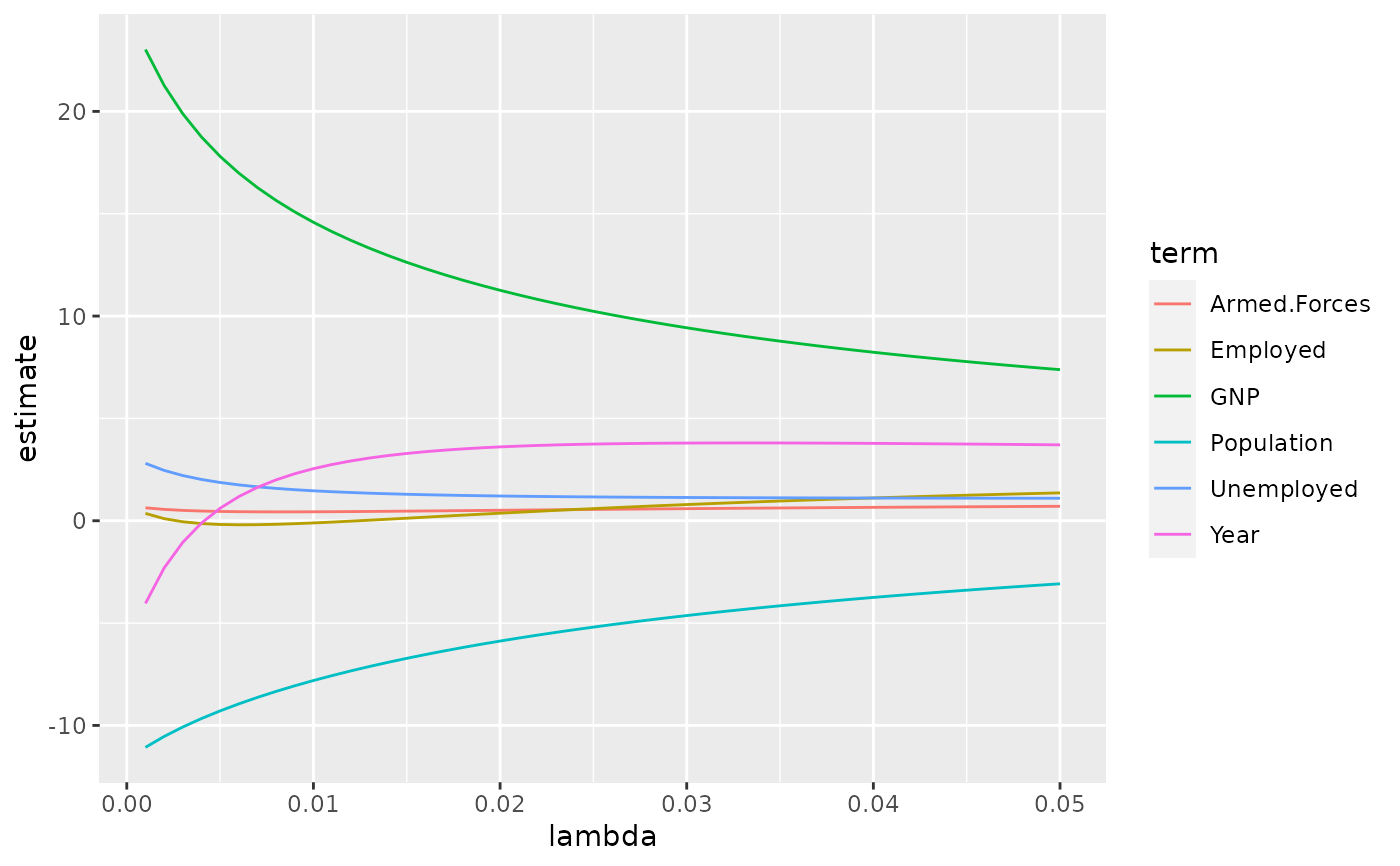 #> # A tibble: 6 x 5 #> lambda GCV term estimate scale #> <dbl> <dbl> <chr> <dbl> <dbl> #> 1 0 0.128 GNP 25.4 96.2 #> 2 0 0.128 Unemployed 3.30 90.5 #> 3 0 0.128 Armed.Forces 0.752 67.4 #> 4 0 0.128 Population -11.7 6.74 #> 5 0 0.128 Year -6.54 4.61 #> 6 0 0.128 Employed 0.786 3.40