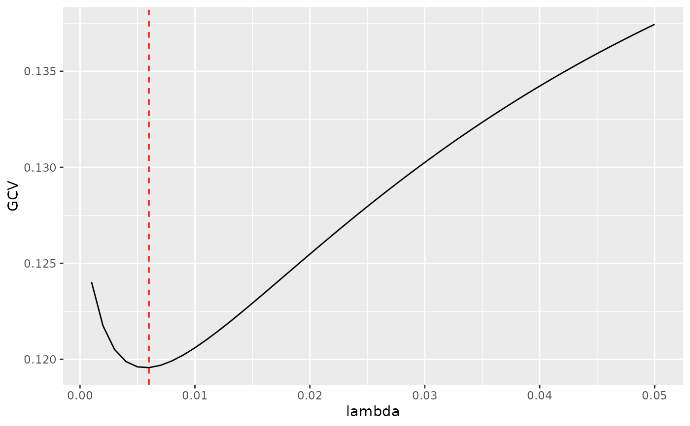 # add line for the GCV minimizing estimate ggplot(td2, aes(lambda, GCV)) + geom_line() + geom_vline(xintercept = g2$lambdaGCV, col = "red", lty = 2)