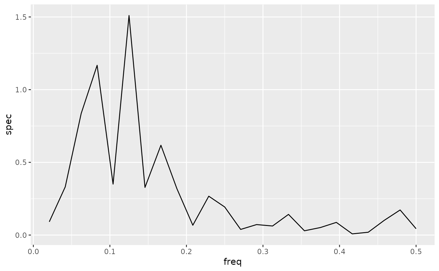 #> # A tibble: 24 x 2 #> freq spec #> <dbl> <dbl> #> 1 0.0208 0.0912 #> 2 0.0417 0.331 #> 3 0.0625 0.836 #> 4 0.0833 1.17 #> 5 0.104 0.350 #> 6 0.125 1.51 #> 7 0.146 0.328 #> 8 0.167 0.618 #> 9 0.188 0.320 #> 10 0.208 0.0675 #> # … with 14 more rows