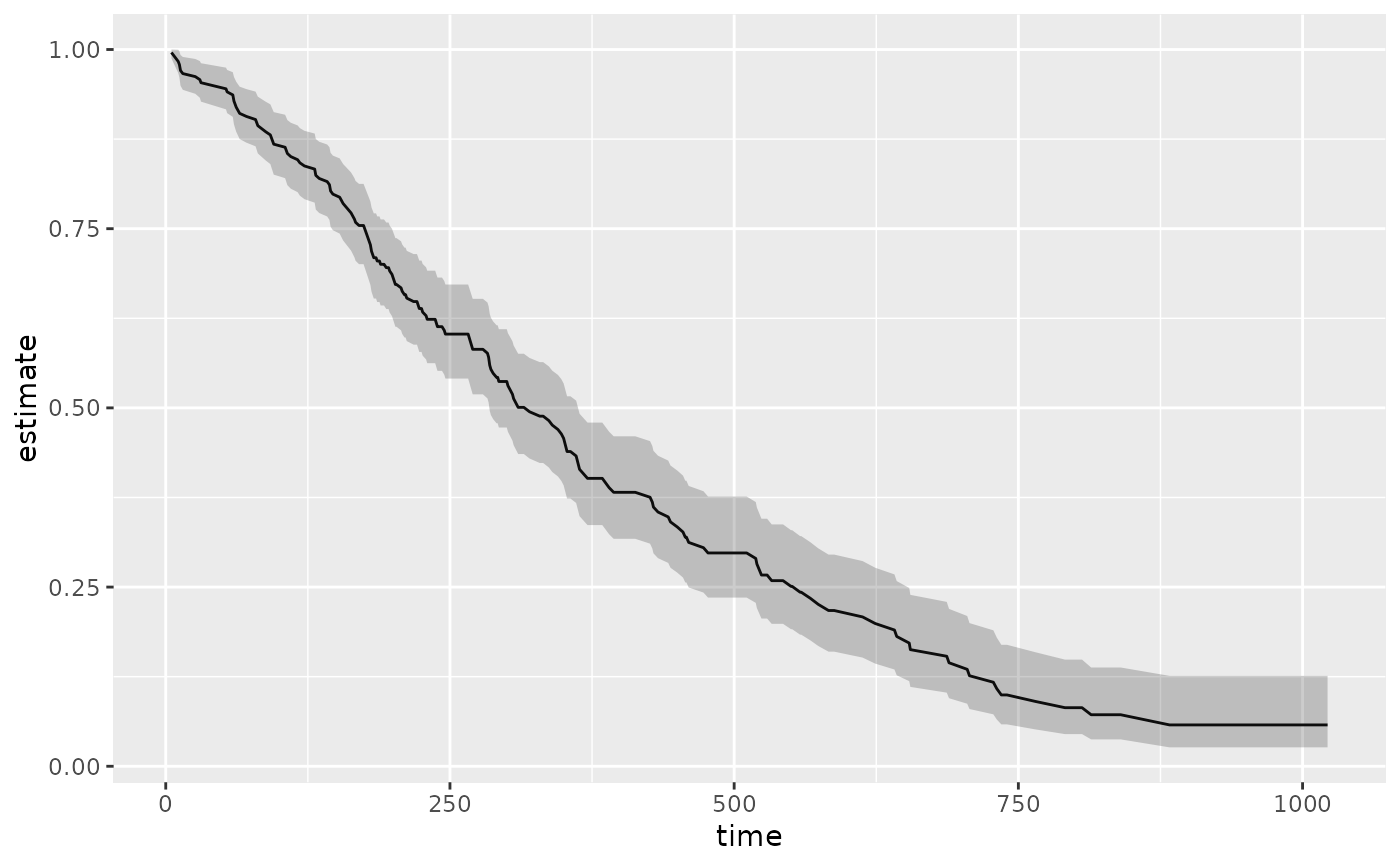 library(survival) cfit <- coxph(Surv(time, status) ~ age + sex, lung) sfit <- survfit(cfit) tidy(sfit)#> # A tibble: 186 x 8 #> time n.risk n.event n.censor estimate std.error conf.high conf.low #> <dbl> <dbl> <dbl> <dbl> <dbl> <dbl> <dbl> <dbl> #> 1 5 228 1 0 0.996 0.00419 1 0.988 #> 2 11 227 3 0 0.983 0.00845 1.00 0.967 #> 3 12 224 1 0 0.979 0.00947 0.997 0.961 #> 4 13 223 2 0 0.971 0.0113 0.992 0.949 #> 5 15 221 1 0 0.966 0.0121 0.990 0.944 #> 6 26 220 1 0 0.962 0.0129 0.987 0.938 #> 7 30 219 1 0 0.958 0.0136 0.984 0.933 #> 8 31 218 1 0 0.954 0.0143 0.981 0.927 #> 9 53 217 2 0 0.945 0.0157 0.975 0.917 #> 10 54 215 1 0 0.941 0.0163 0.972 0.911 #> # … with 176 more rows#> # A tibble: 1 x 10 #> records n.max n.start events rmean rmean.std.error median conf.low conf.high #> <dbl> <dbl> <dbl> <dbl> <dbl> <dbl> <dbl> <dbl> <dbl> #> 1 228 228 228 165 381. 20.3 320 285 363 #> # … with 1 more variable: nobs <int>library(ggplot2) ggplot(tidy(sfit), aes(time, estimate)) + geom_line() + geom_ribbon(aes(ymin = conf.low, ymax = conf.high), alpha = .25)# multi-state fitCI <- survfit(Surv(stop, status * as.numeric(event), type = "mstate") ~ 1, data = mgus1, subset = (start == 0) ) td_multi <- tidy(fitCI) td_multi#> # A tibble: 711 x 9 #> time n.risk n.event n.censor estimate std.error conf.high conf.low state #> <dbl> <int> <int> <int> <dbl> <dbl> <dbl> <dbl> <chr> #> 1 6 241 0 0 0.996 0.00414 1 0.988 (s0) #> 2 7 240 0 0 0.992 0.00584 1 0.980 (s0) #> 3 31 239 0 0 0.988 0.00714 1 0.974 (s0) #> 4 32 238 0 0 0.983 0.00823 1.00 0.967 (s0) #> 5 39 237 0 0 0.979 0.00918 0.997 0.961 (s0) #> 6 60 236 0 0 0.975 0.0100 0.995 0.956 (s0) #> 7 61 235 0 0 0.967 0.0115 0.990 0.944 (s0) #> 8 152 233 0 0 0.963 0.0122 0.987 0.939 (s0) #> 9 153 232 0 0 0.959 0.0128 0.984 0.934 (s0) #> 10 174 231 0 0 0.954 0.0134 0.981 0.928 (s0) #> # … with 701 more rowsggplot(td_multi, aes(time, estimate, group = state)) + geom_line(aes(color = state)) + geom_ribbon(aes(ymin = conf.low, ymax = conf.high), alpha = .25)