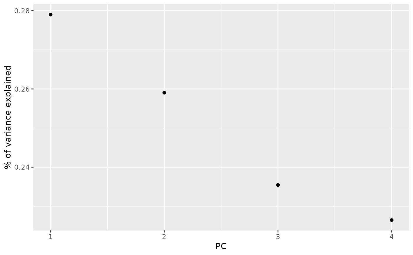 library(modeldata) data(hpc_data) mat <- scale(as.matrix(hpc_data[, 2:5])) s <- svd(mat) tidy_u <- tidy(s, matrix = "u")#> #> #> #> #>tidy_u#> # A tibble: 17,324 x 3 #> row PC value #> <int> <dbl> <dbl> #> 1 1 1 0.00403 #> 2 2 1 -0.00436 #> 3 3 1 -0.00196 #> 4 4 1 -0.00444 #> 5 5 1 -0.00437 #> 6 6 1 -0.00437 #> 7 7 1 -0.00431 #> 8 8 1 -0.00436 #> 9 9 1 -0.00434 #> 10 10 1 -0.00440 #> # … with 17,314 more rows#> # A tibble: 4 x 4 #> PC std.dev percent cumulative #> <int> <dbl> <dbl> <dbl> #> 1 1 69.5 0.279 0.279 #> 2 2 67.0 0.259 0.538 #> 3 3 63.9 0.235 0.774 #> 4 4 62.6 0.226 1#> #> #> #> #>tidy_v#> # A tibble: 16 x 3 #> column PC value #> <int> <dbl> <dbl> #> 1 1 1 0.657 #> 2 2 1 0.409 #> 3 3 1 -0.577 #> 4 4 1 0.262 #> 5 1 2 -0.0142 #> 6 2 2 -0.650 #> 7 3 2 -0.137 #> 8 4 2 0.747 #> 9 1 3 0.302 #> 10 2 3 0.332 #> 11 3 3 0.779 #> 12 4 3 0.438 #> 13 1 4 0.690 #> 14 2 4 -0.548 #> 15 3 4 0.205 #> 16 4 4 -0.426library(ggplot2) library(dplyr) ggplot(tidy_d, aes(PC, percent)) + geom_point() + ylab("% of variance explained")tidy_u %>% mutate(class = hpc_data$class[row]) %>% ggplot(aes(class, value)) + geom_boxplot() + facet_wrap(~PC, scale = "free_y")