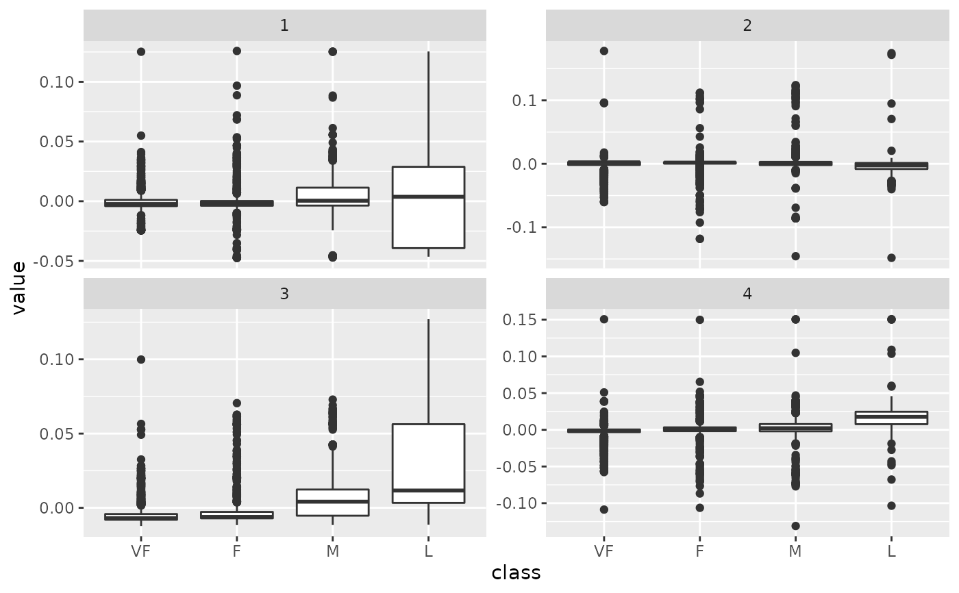 library(modeldata) data(hpc_data) mat <- scale(as.matrix(hpc_data[, 2:5])) s <- svd(mat) tidy_u <- tidy(s, matrix = "u")#> #> #> #> #>tidy_u#> # A tibble: 17,324 x 3 #> row PC value #> <int> <dbl> <dbl> #> 1 1 1 0.00403 #> 2 2 1 -0.00436 #> 3 3 1 -0.00196 #> 4 4 1 -0.00444 #> 5 5 1 -0.00437 #> 6 6 1 -0.00437 #> 7 7 1 -0.00431 #> 8 8 1 -0.00436 #> 9 9 1 -0.00434 #> 10 10 1 -0.00440 #> # … with 17,314 more rows#> # A tibble: 4 x 4 #> PC std.dev percent cumulative #> <int> <dbl> <dbl> <dbl> #> 1 1 69.5 0.279 0.279 #> 2 2 67.0 0.259 0.538 #> 3 3 63.9 0.235 0.774 #> 4 4 62.6 0.226 1#> #> #> #> #>tidy_v#> # A tibble: 16 x 3 #> column PC value #> <int> <dbl> <dbl> #> 1 1 1 0.657 #> 2 2 1 0.409 #> 3 3 1 -0.577 #> 4 4 1 0.262 #> 5 1 2 -0.0142 #> 6 2 2 -0.650 #> 7 3 2 -0.137 #> 8 4 2 0.747 #> 9 1 3 0.302 #> 10 2 3 0.332 #> 11 3 3 0.779 #> 12 4 3 0.438 #> 13 1 4 0.690 #> 14 2 4 -0.548 #> 15 3 4 0.205 #> 16 4 4 -0.426library(ggplot2) library(dplyr) ggplot(tidy_d, aes(PC, percent)) + geom_point() + ylab("% of variance explained")tidy_u %>% mutate(class = hpc_data$class[row]) %>% ggplot(aes(class, value)) + geom_boxplot() + facet_wrap(~PC, scale = "free_y")