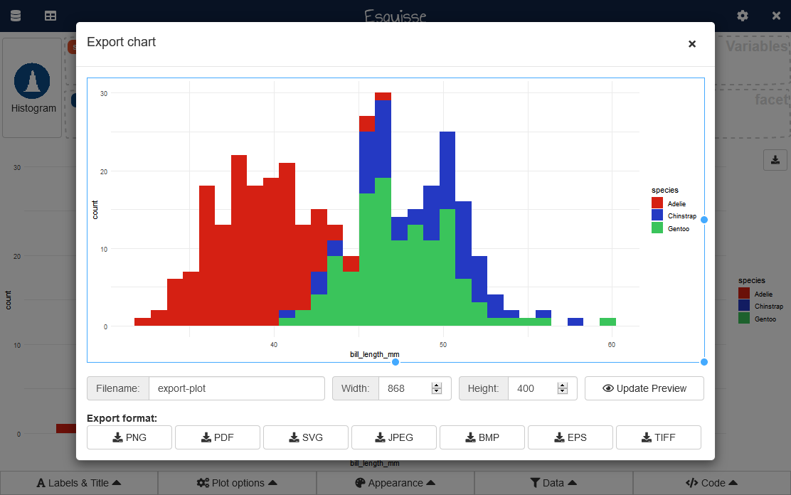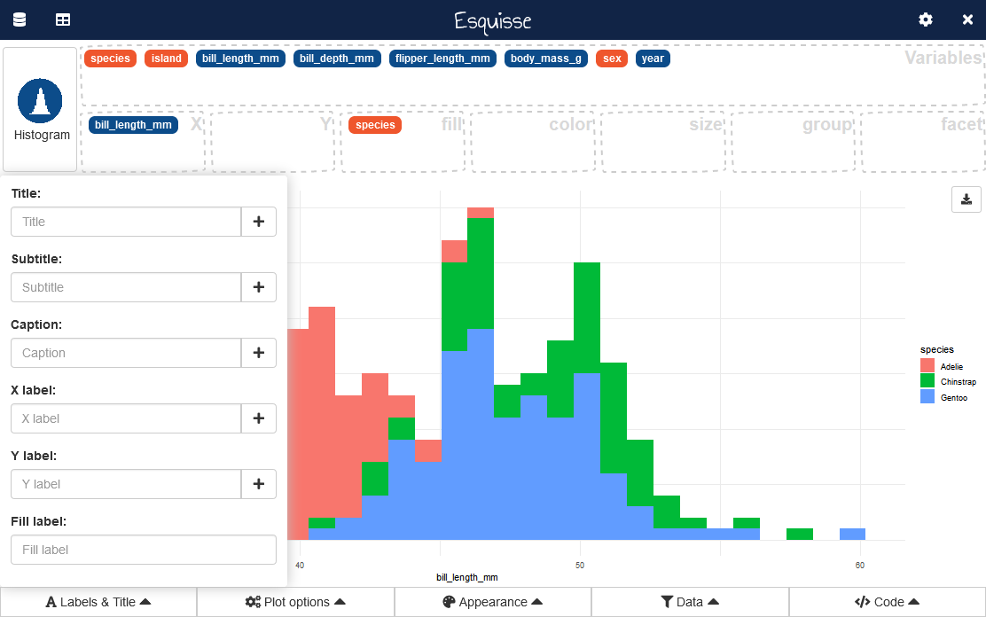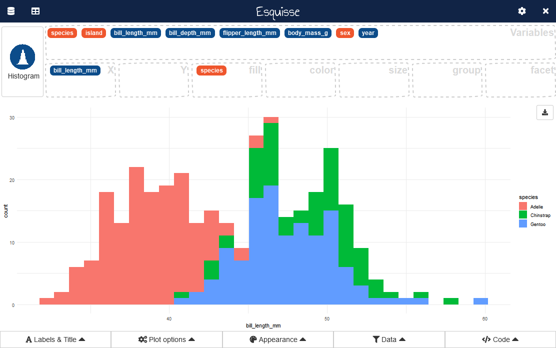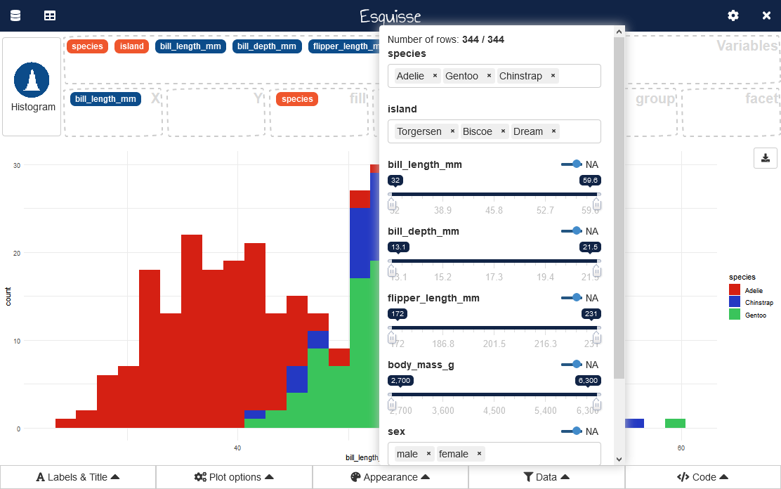 This is the main interface and the most interesting part of the addin (in example below, we use penguins dataset from {palmerpenguins}) :