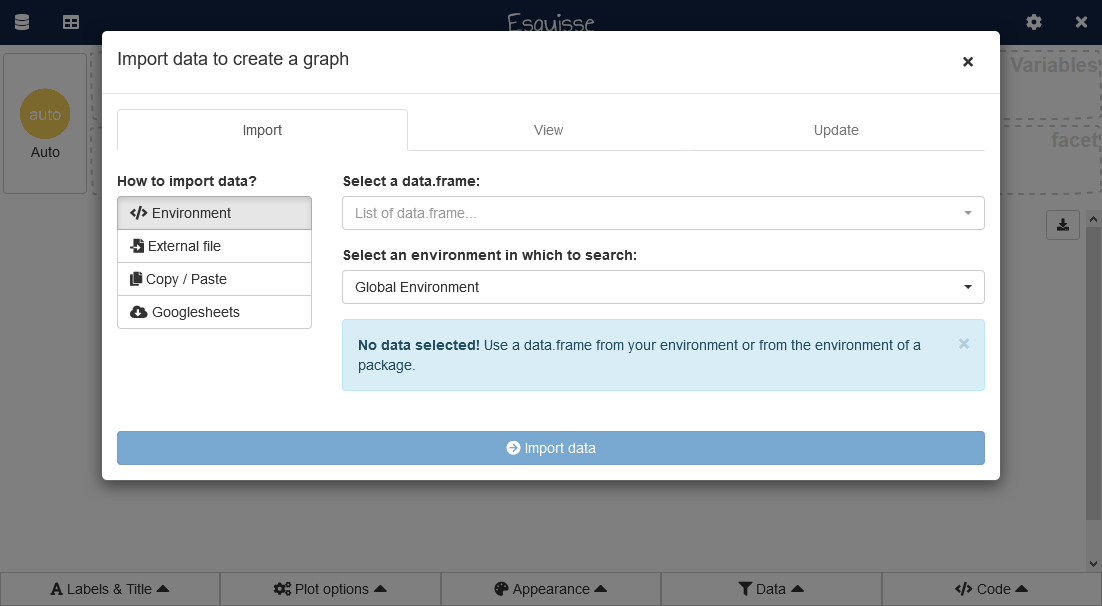 esquisser(mtcars)If you don’t have used a data.frame when launching the addin, a window to import data will appear.