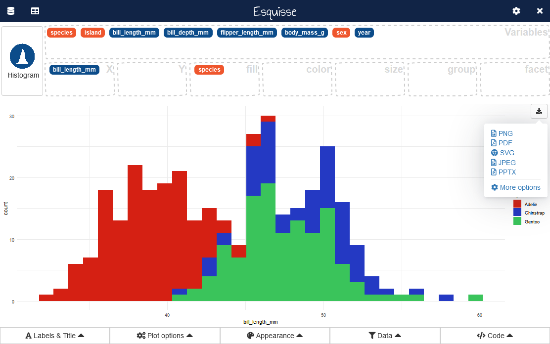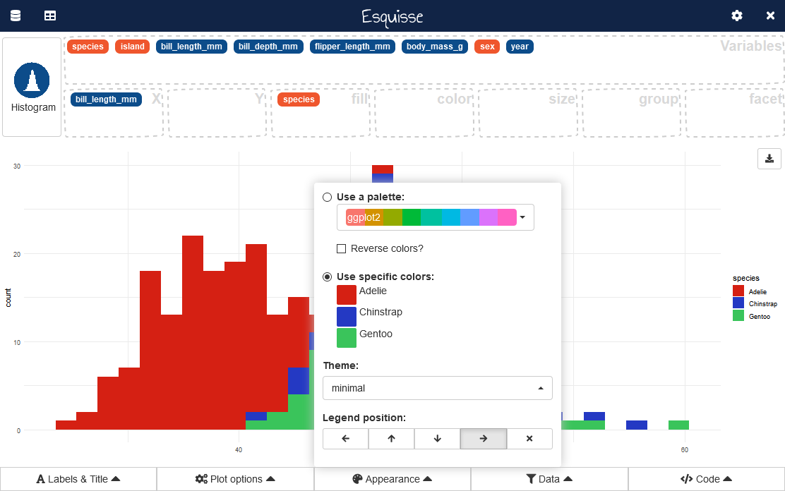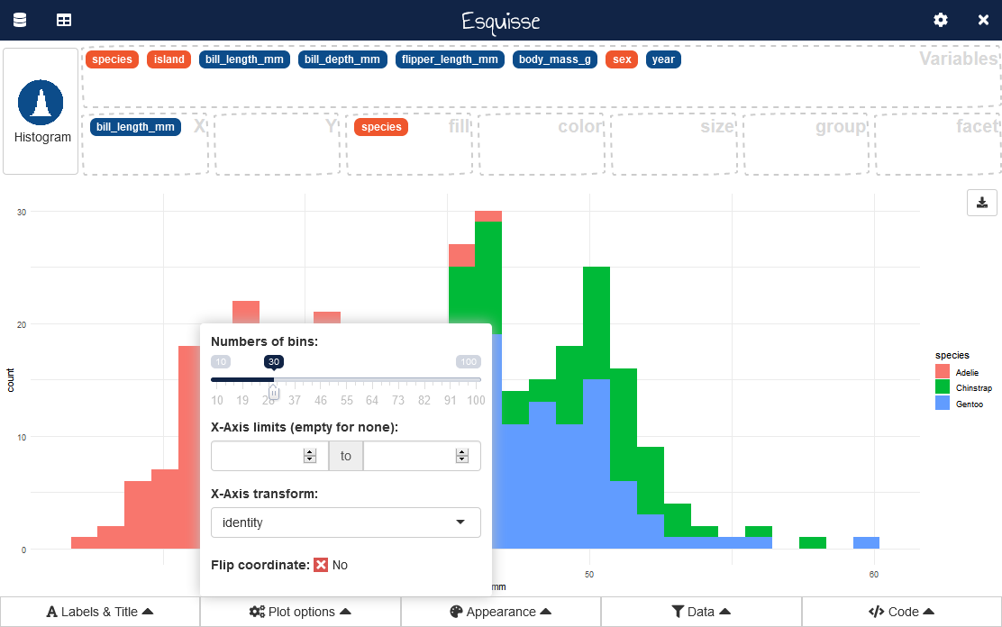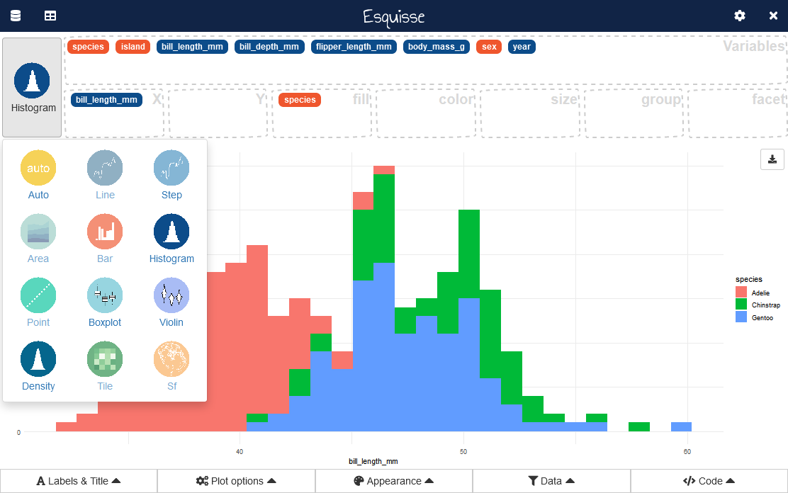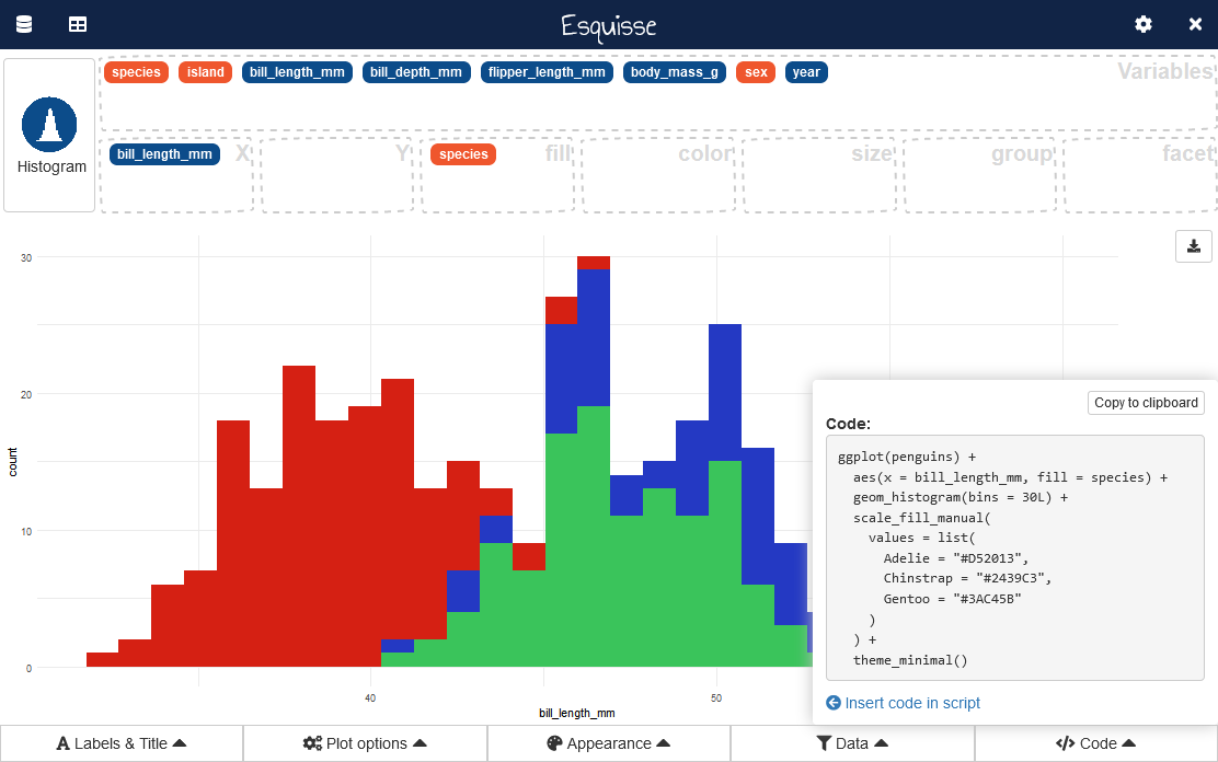 This is the main interface and the most interesting part of the addin (in example below, we use penguins dataset from {palmerpenguins}) :