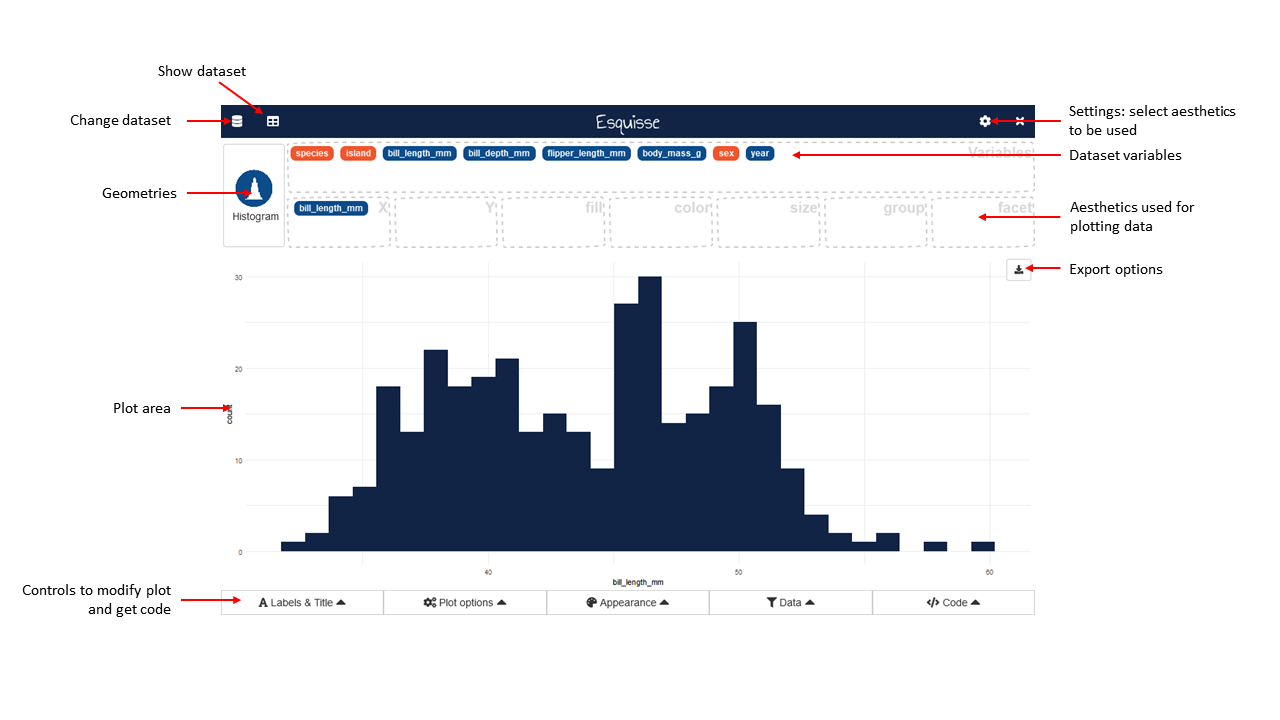 options("esquisse.viewer" = "browser")Currently you can use {esquisse} in the following language: english (default),