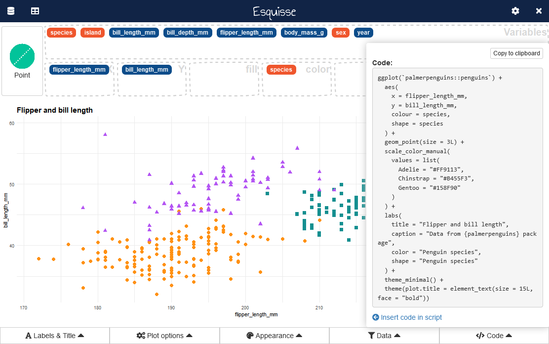 Above gif was made with ❤️ by @mfanny and cannot be removed, but in the meantime {esquisse} has evolved, the latest version now looks like: