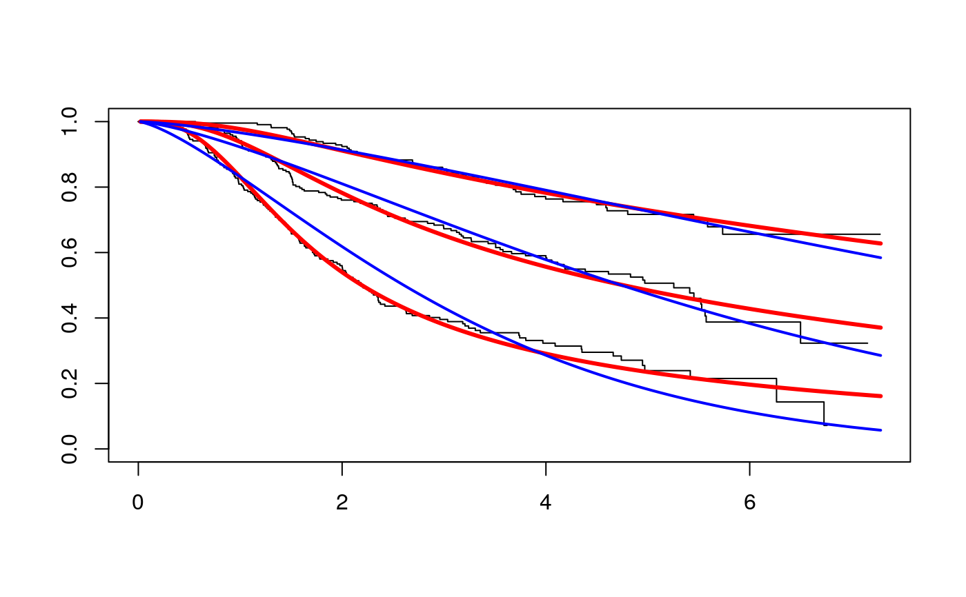 ## Best-fitting model to breast cancer data from Royston and Parmar (2002) ## One internal knot (2 df) and cumulative odds scale spl <- flexsurvspline(Surv(recyrs, censrec) ~ group, data=bc, k=1, scale="odds") ## Fitted survival plot(spl, lwd=3, ci=FALSE)## Simple Weibull model fits much less well splw <- flexsurvspline(Surv(recyrs, censrec) ~ group, data=bc, k=0, scale="hazard") lines(splw, col="blue", ci=FALSE)## Alternative way of fitting the Weibull if (FALSE) { splw2 <- flexsurvreg(Surv(recyrs, censrec) ~ group, data=bc, dist="weibull") }