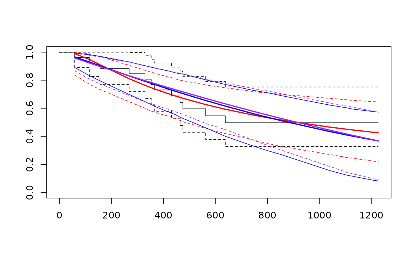 ## Compare generalized gamma fit with Weibull fitg <- flexsurvreg(formula = Surv(futime, fustat) ~ 1, data = ovarian, dist="gengamma") fitg#> Call: #> flexsurvreg(formula = Surv(futime, fustat) ~ 1, data = ovarian, #> dist = "gengamma") #> #> Estimates: #> est L95% U95% se #> mu 6.426 4.984 7.868 0.736 #> sigma 1.426 0.888 2.292 0.345 #> Q -0.766 -3.340 1.807 1.313 #> #> N = 26, Events: 12, Censored: 14 #> Total time at risk: 15588 #> Log-likelihood = -96.94907, df = 3 #> AIC = 199.8981 #>fitw <- flexsurvreg(formula = Surv(futime, fustat) ~ 1, data = ovarian, dist="weibull") fitw#> Call: #> flexsurvreg(formula = Surv(futime, fustat) ~ 1, data = ovarian, #> dist = "weibull") #> #> Estimates: #> est L95% U95% se #> shape 1.108 0.674 1.822 0.281 #> scale 1225.419 690.421 2174.979 358.714 #> #> N = 26, Events: 12, Censored: 14 #> Total time at risk: 15588 #> Log-likelihood = -97.9539, df = 2 #> AIC = 199.9078 #>## Identical AIC, probably not enough data in this simple example for a ## very flexible model to be worthwhile. ## Custom distribution ## make "dEV" and "pEV" from eha package (if installed) ## available to the working environment if (require("eha")) { custom.ev <- list(name="EV", pars=c("shape","scale"), location="scale", transforms=c(log, log), inv.transforms=c(exp, exp), inits=function(t){ c(1, median(t)) }) fitev <- flexsurvreg(formula = Surv(futime, fustat) ~ 1, data = ovarian, dist=custom.ev) fitev lines(fitev, col="purple", col.ci="purple") }#>#> #>#> #> #> #> #>#>#>## Custom distribution: supply the hazard function only hexp2 <- function(x, rate=1){ rate } # exponential distribution hexp2 <- Vectorize(hexp2) custom.exp2 <- list(name="exp2", pars=c("rate"), location="rate", transforms=c(log), inv.transforms=c(exp), inits=function(t)1/mean(t)) flexsurvreg(Surv(futime, fustat) ~ 1, data = ovarian, dist=custom.exp2)#> Error in form.dp(dlist, dfns, integ.opts): Neither density function "dexp2" nor hazard function "hexp2" found#> Call: #> flexsurvreg(formula = Surv(futime, fustat) ~ 1, data = ovarian, #> dist = "exp") #> #> Estimates: #> est L95% U95% se #> rate 0.000770 0.000437 0.001356 0.000222 #> #> N = 26, Events: 12, Censored: 14 #> Total time at risk: 15588 #> Log-likelihood = -98.0322, df = 1 #> AIC = 198.0644 #>## should give same answer