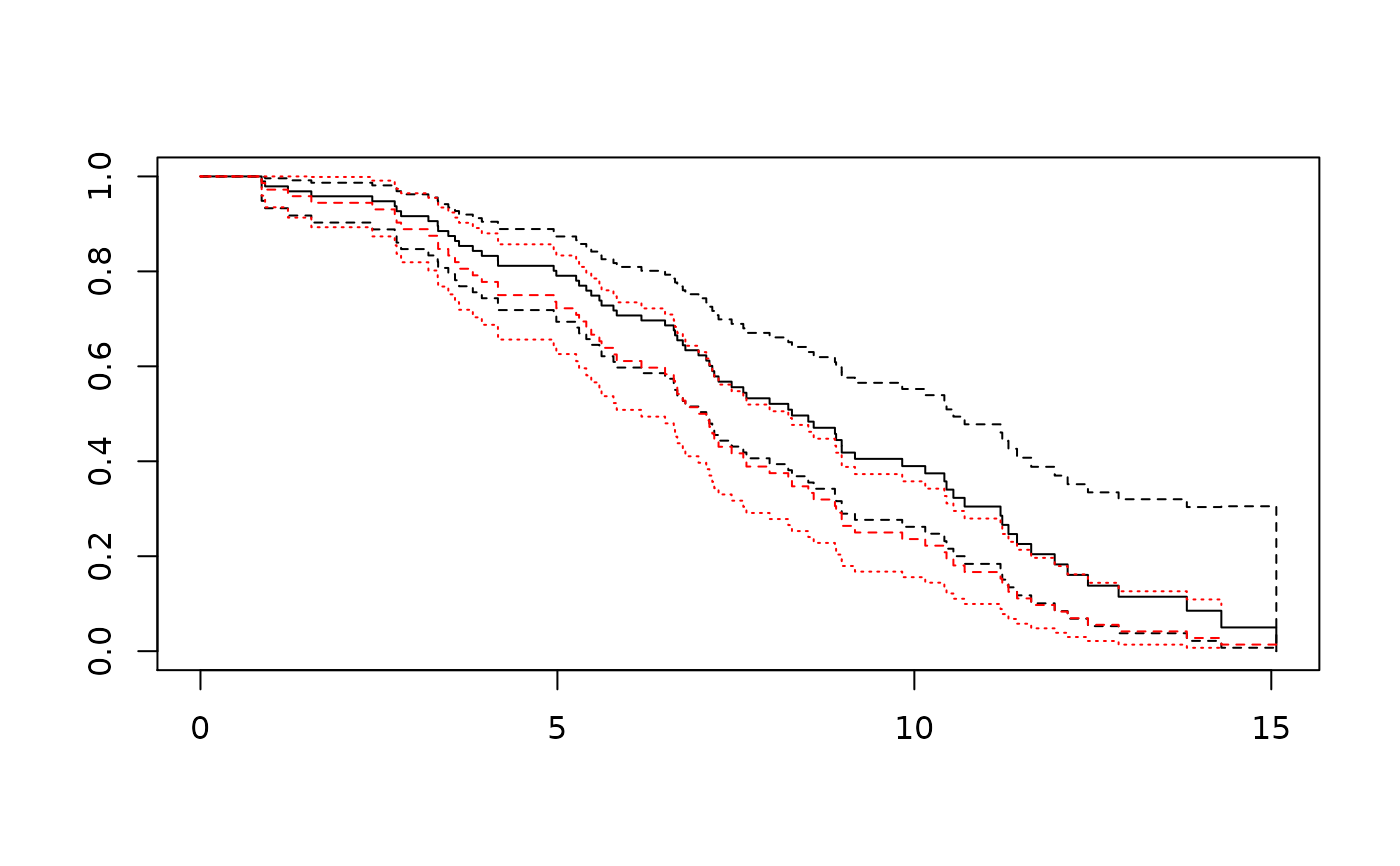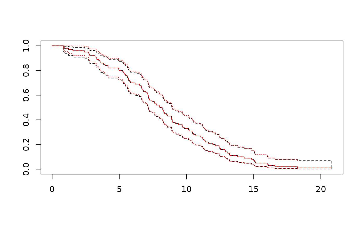 ## simulate some event time data set.seed(1) X <- rweibull(100, 2, 10) T <- rweibull(100, 2, 10) ## truncate above tmax <- 20 obs <- X + T < tmax rtrunc <- tmax - X dat <- data.frame(X, T, rtrunc)[obs,] sf <- survrtrunc(T, rtrunc, data=dat, tmax=tmax) plot(sf, conf.int=TRUE)## Kaplan-Meier estimate ignoring truncation is biased sfnaive <- survfit(Surv(T) ~ 1, data=dat) lines(sfnaive, conf.int=TRUE, lty=2, col="red")## truncate above the maximum observed time tmax <- max(X + T) + 10 obs <- X + T < tmax rtrunc <- tmax - X dat <- data.frame(X, T, rtrunc)[obs,] sf <- survrtrunc(T, rtrunc, data=dat, tmax=tmax) plot(sf, conf.int=TRUE)## estimates identical to the standard Kaplan-Meier sfnaive <- survfit(Surv(T) ~ 1, data=dat) lines(sfnaive, conf.int=TRUE, lty=2, col="red")