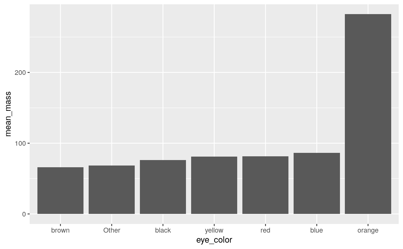 #> 7 Other 68.4It looks like people (or at least one person) with orange eyes are definitely heavier! If we wanted to make a graph, it would be nice if it was ordered by mean_mass. We can do this with fct_reorder(), which reorders one variable by another.