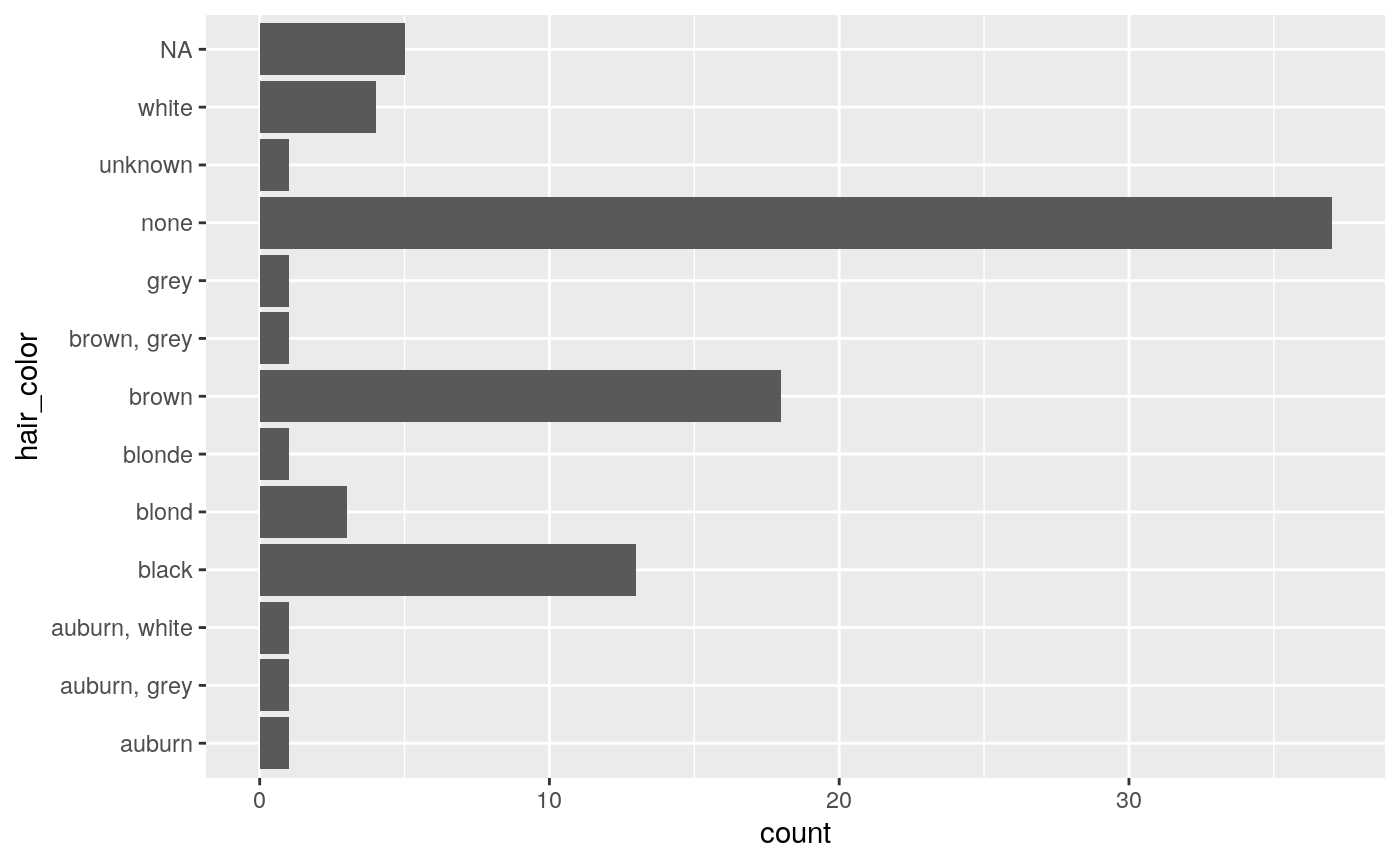 Let’s try answering the question, “what are the most common hair colors of star wars characters?” Let’s start off by making a bar plot: