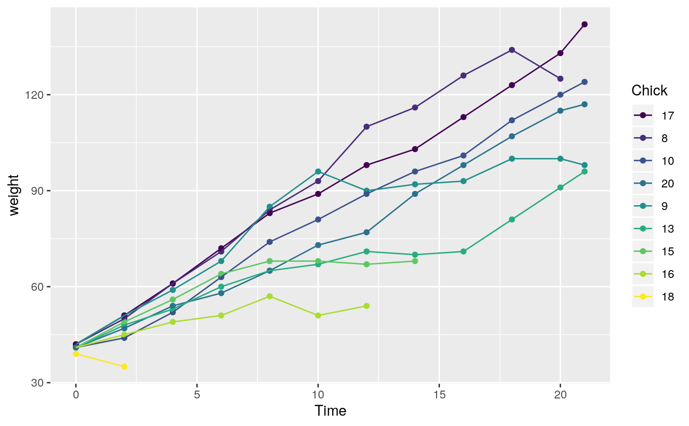 chks <- subset(ChickWeight, as.integer(Chick) < 10) chks <- transform(chks, Chick = fct_shuffle(Chick)) if (require("ggplot2")) { ggplot(chks, aes(Time, weight, colour = Chick)) + geom_point() + geom_line() # Note that lines match order in legend ggplot(chks, aes(Time, weight, colour = fct_reorder2(Chick, Time, weight))) + geom_point() + geom_line() + labs(colour = "Chick") }#>