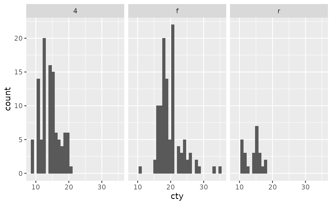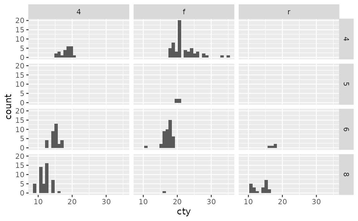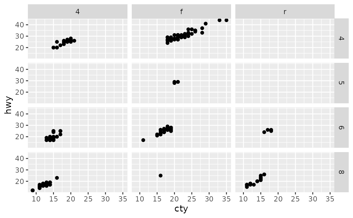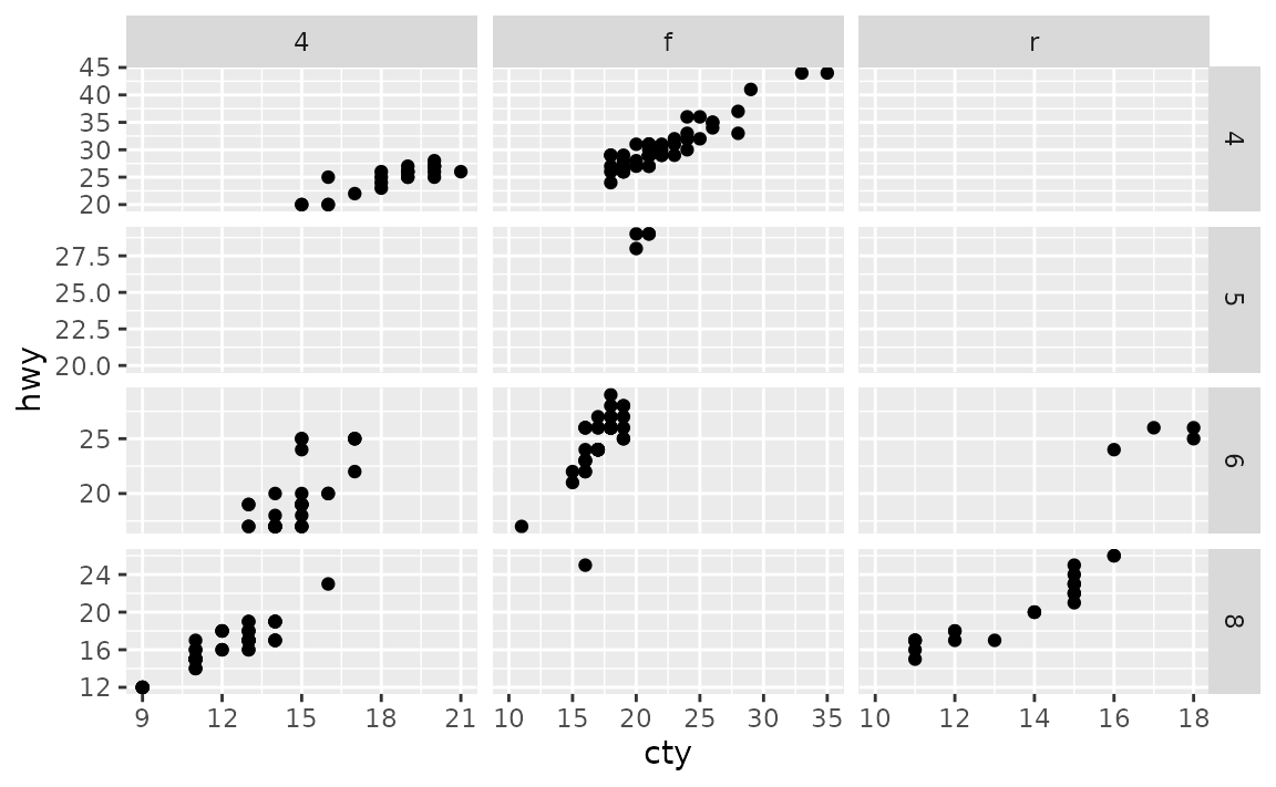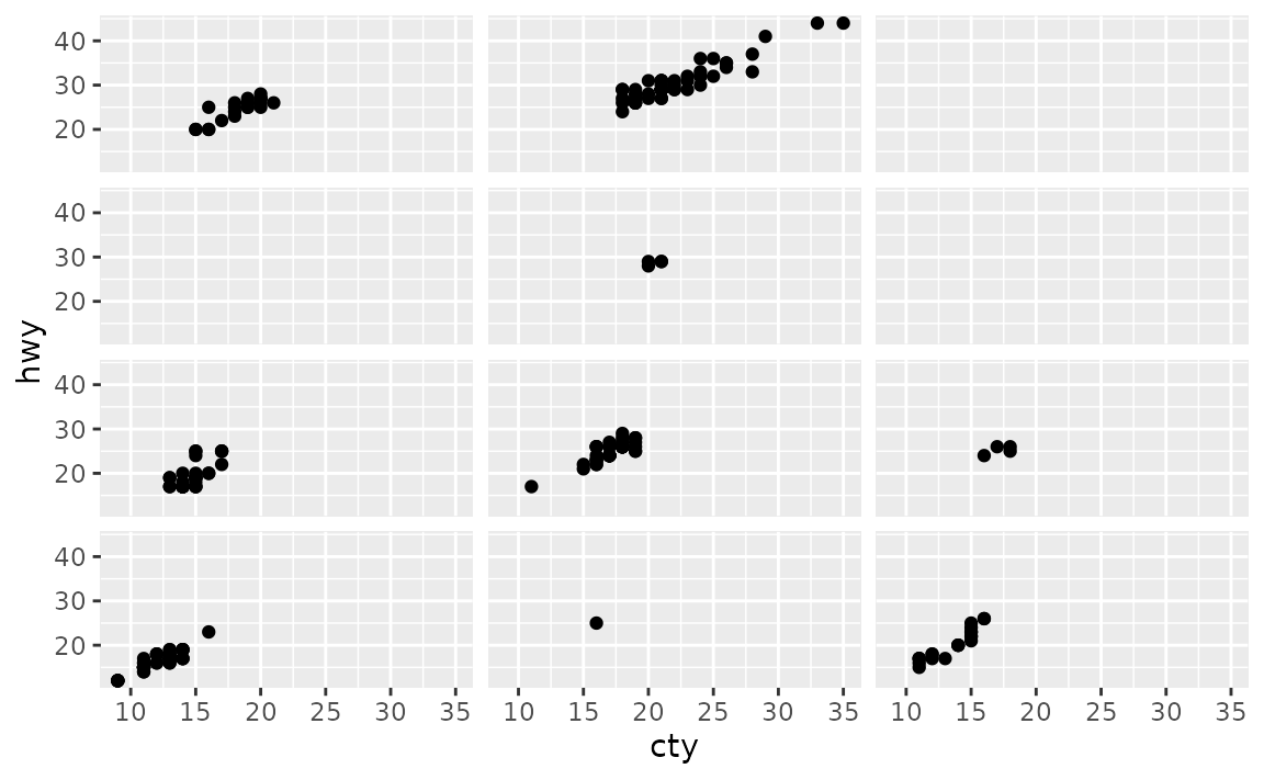 Notice that this results in some empty panes (e.g. 4-wheel drive and 5 cylinders) as there are no cars in the mpg dataset that fall into such categories.