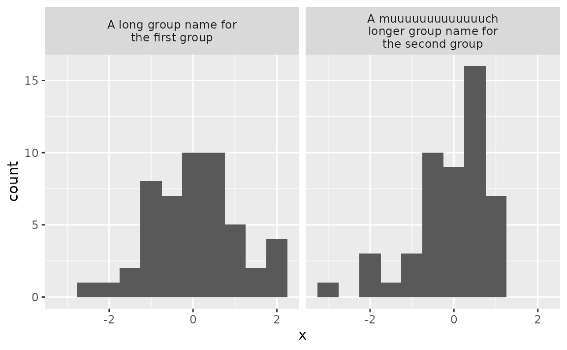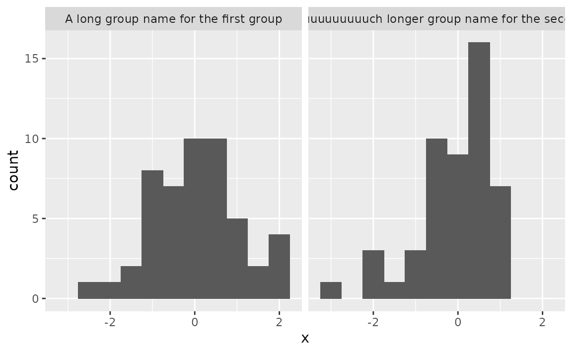 In the data frame below we have 100 observations, 50 of them come from one group and 50 from another. These groups have very long names, and so when you facet the ploy by group, the facet labels (strips) get cut off.